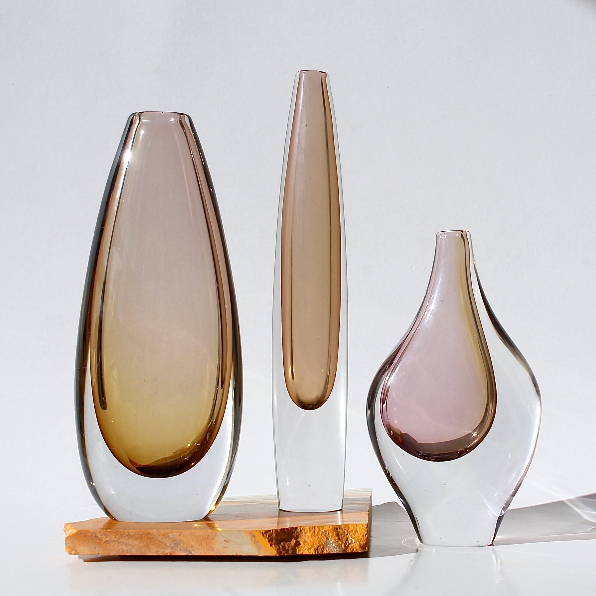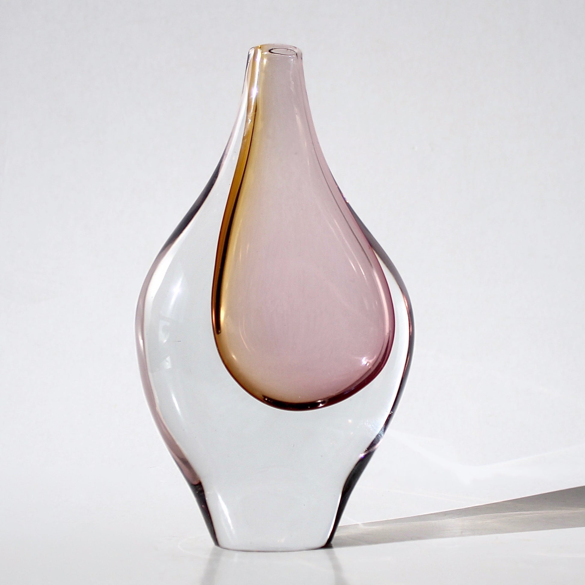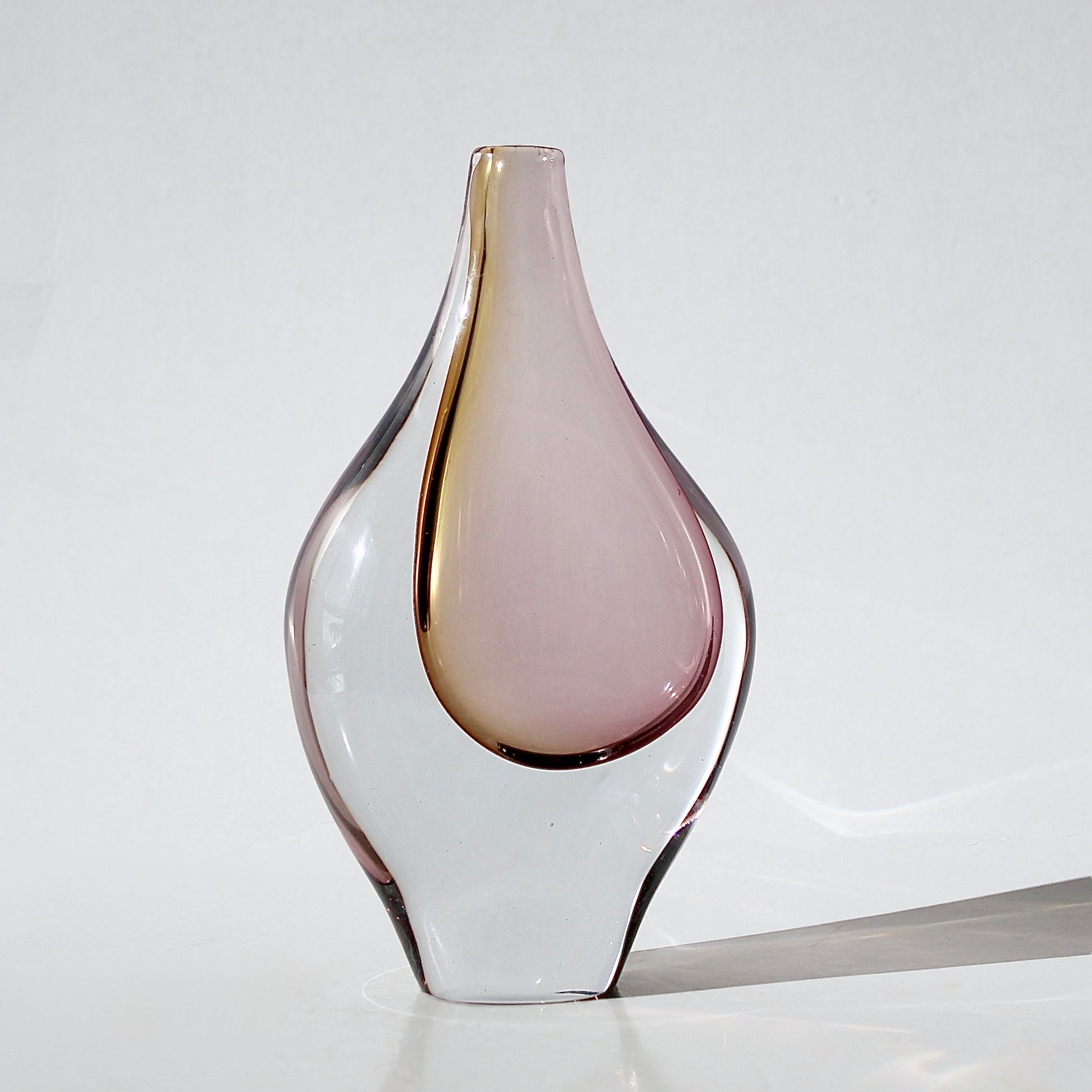 This sommerso biomorphic vase features handblown solid clear glass that encases a multicoloured underlay of amber to copper tones. The B927 model may have been designed by Asta Strömberg or Gunnar Nylund, who were both Artistic Directors during the mid-century period.