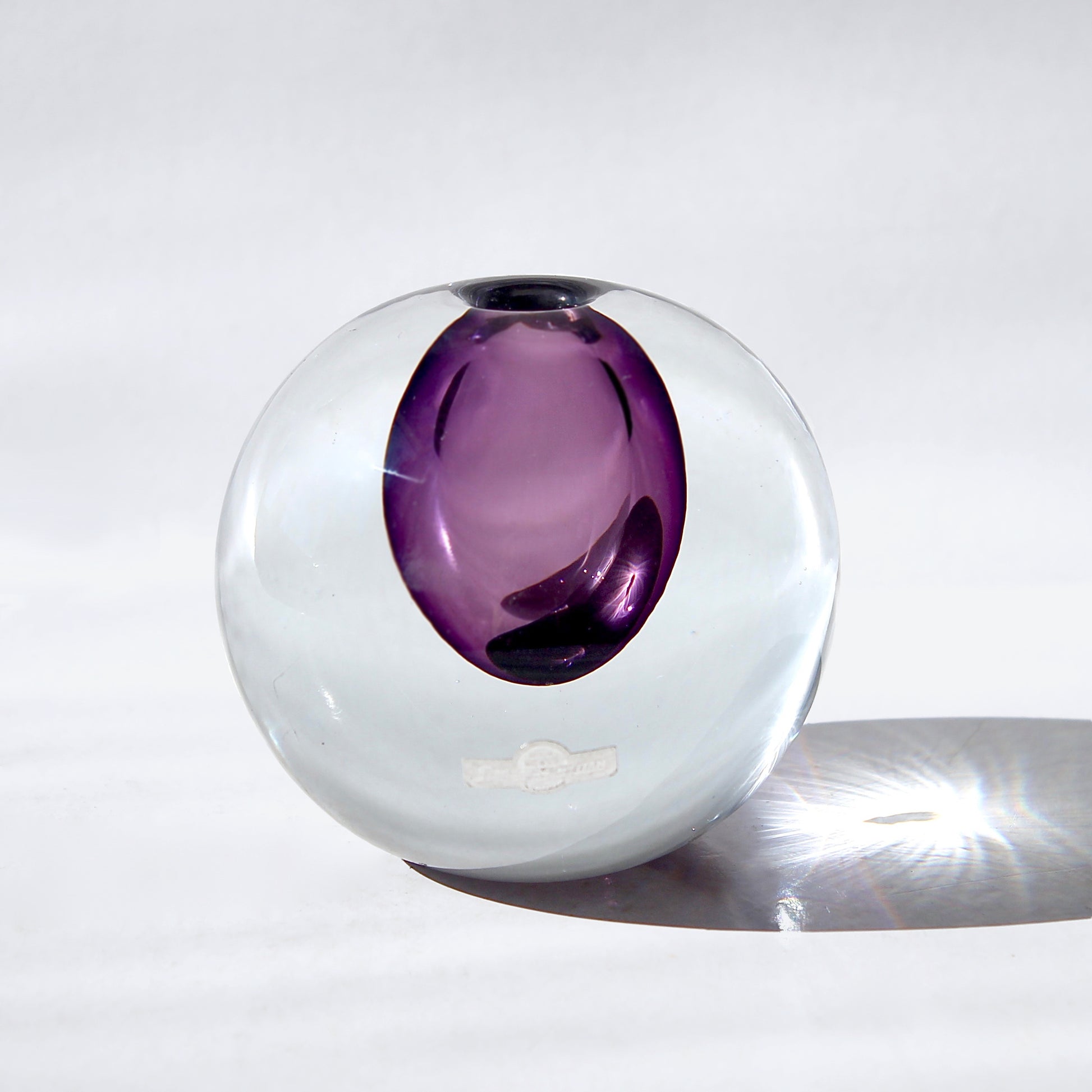 A spherical form of super solid clear handblown crystal that encases a beautiful translucent amethyst underlay. The overall condition of this vase is excellent with no notches, cracks, repairs or discolouration. It still has its original label.