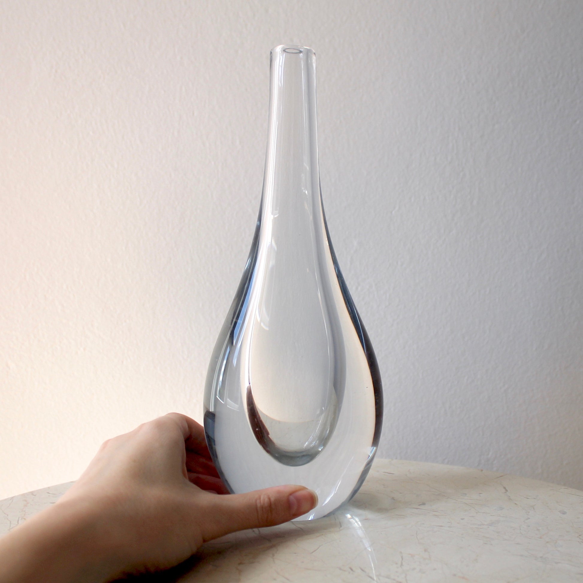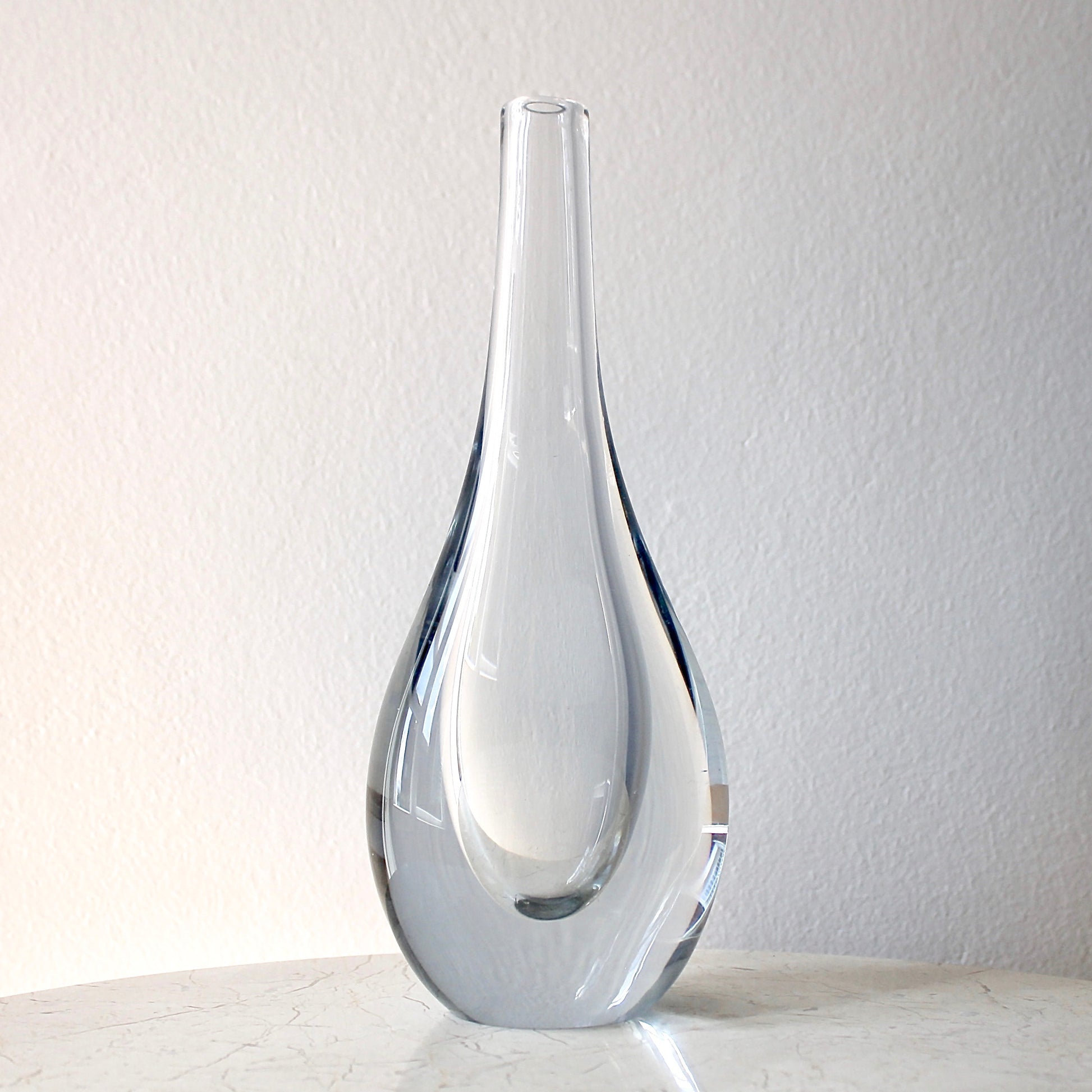 This beautiful heavy tear-drop vase by Gunnar Nylund features super solid clear handblown crystal with the iconic slight blue tint that Strömbergshyttan glassworks is known for. It is known as model B818.