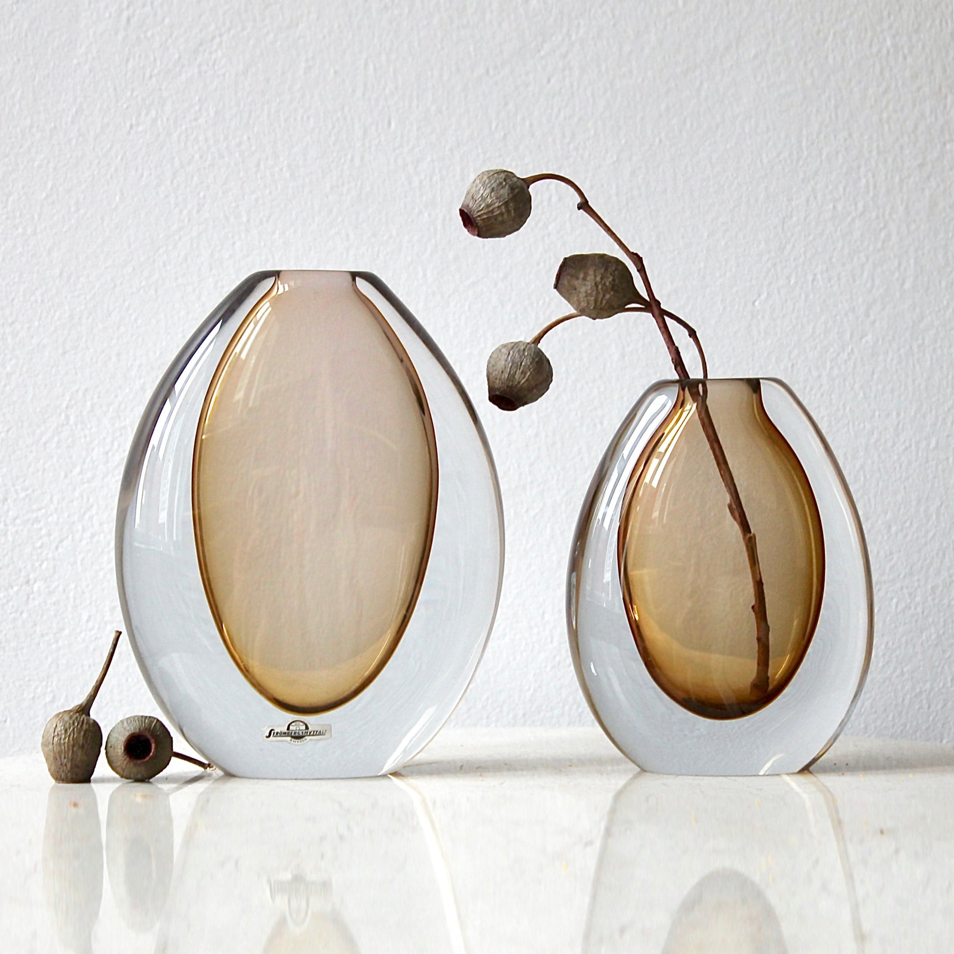 This beautiful mid-century vase features heavy handblown Strömberg crystal that encases a translucent golden amber underlay. It has a biomorphic ovoid cavity with a small opening ideal for highlighting stems and cuttings.