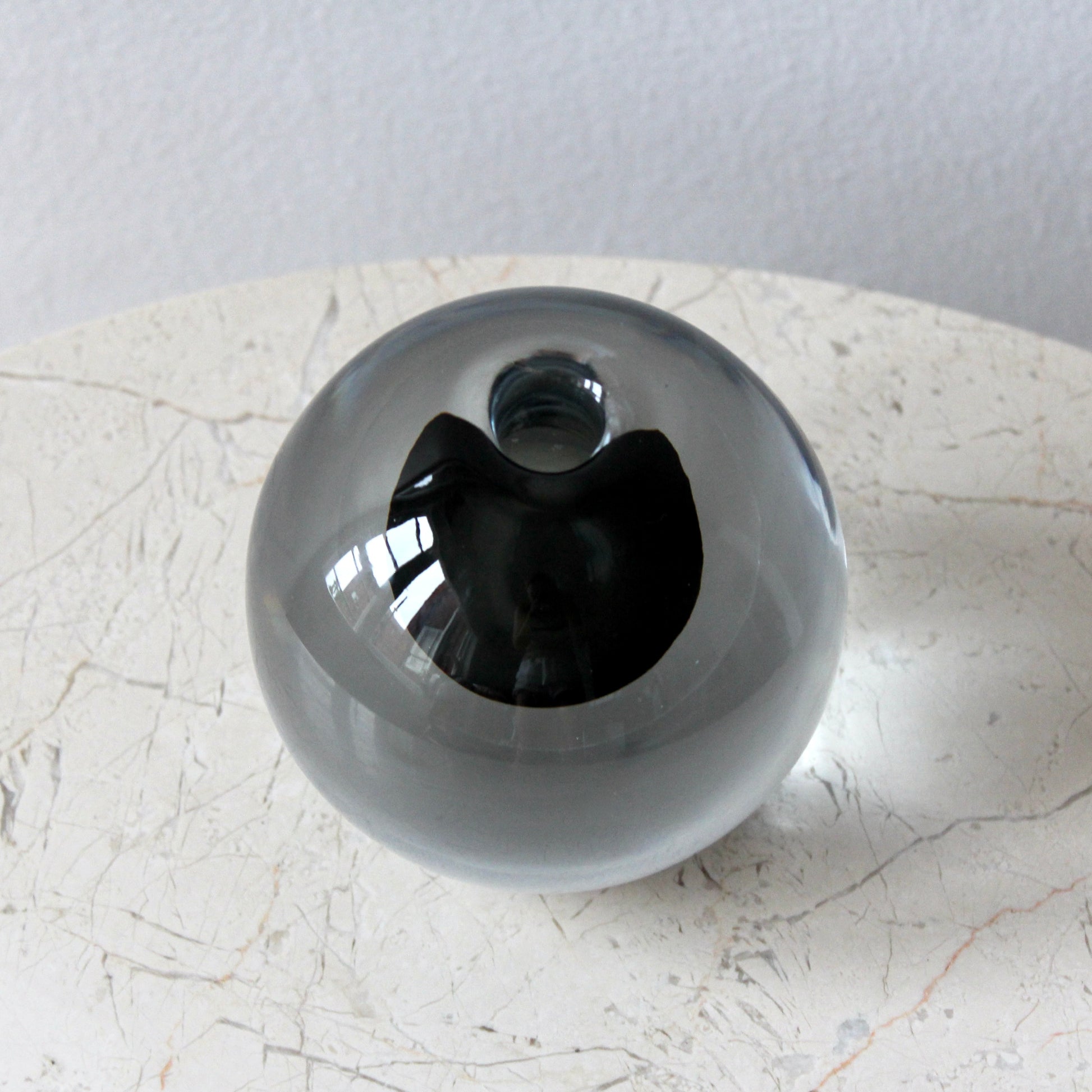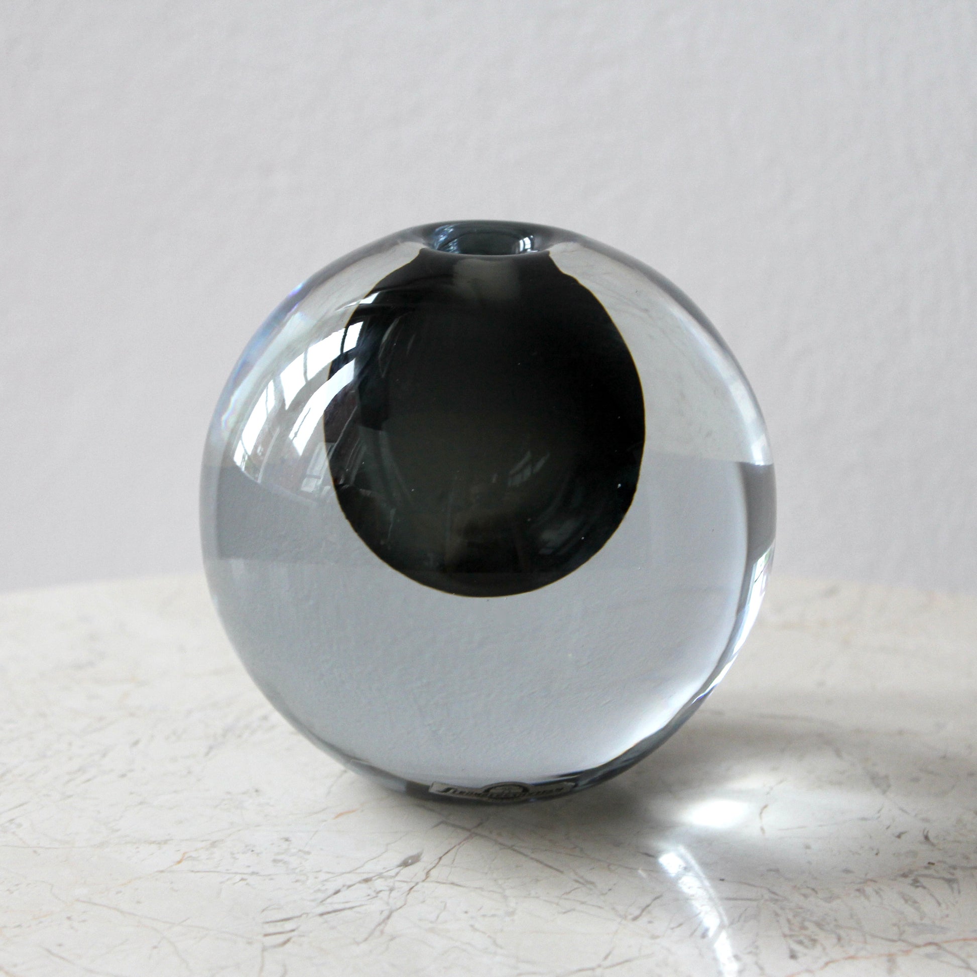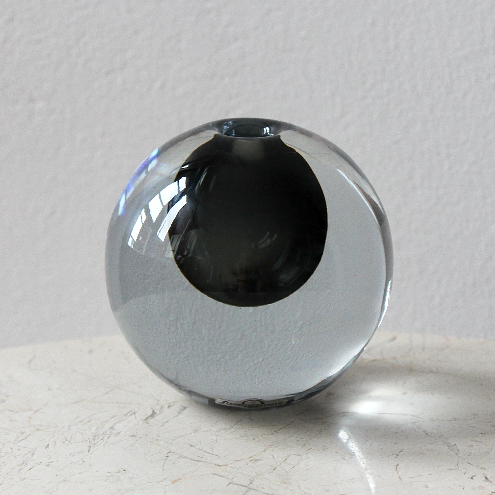 A spherical form of super solid clear hand-blown crystal that encases a beautiful transparent charcoal underlay.
