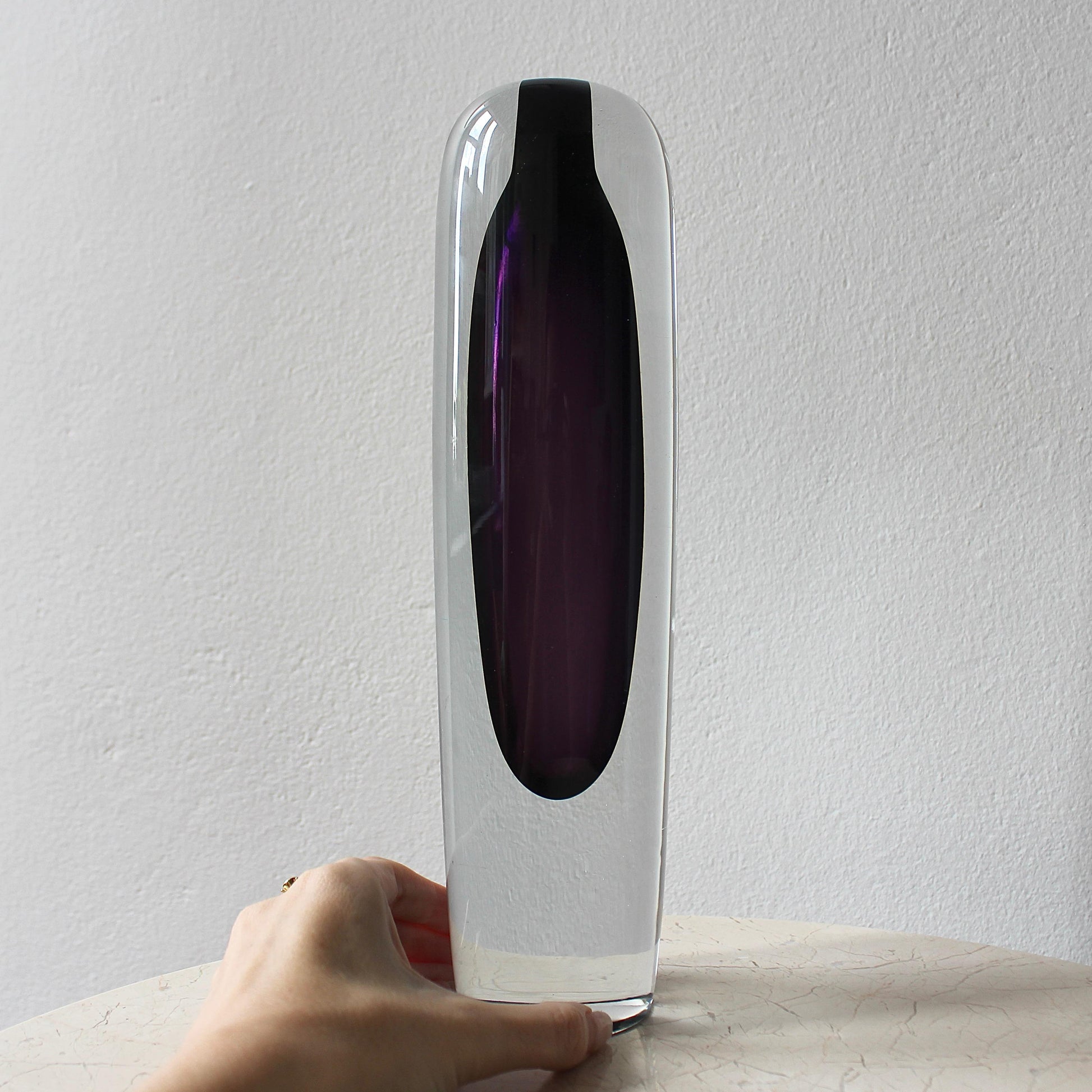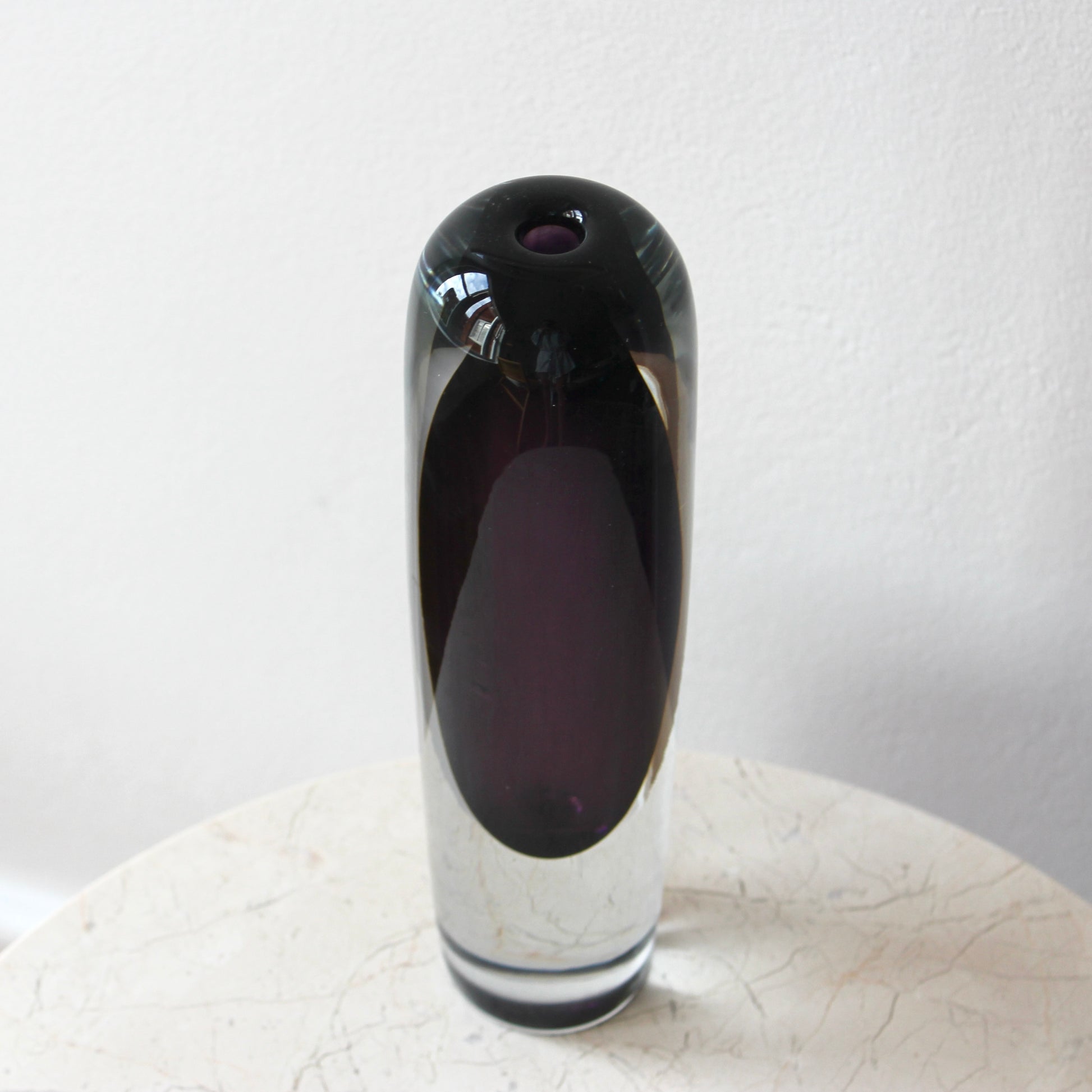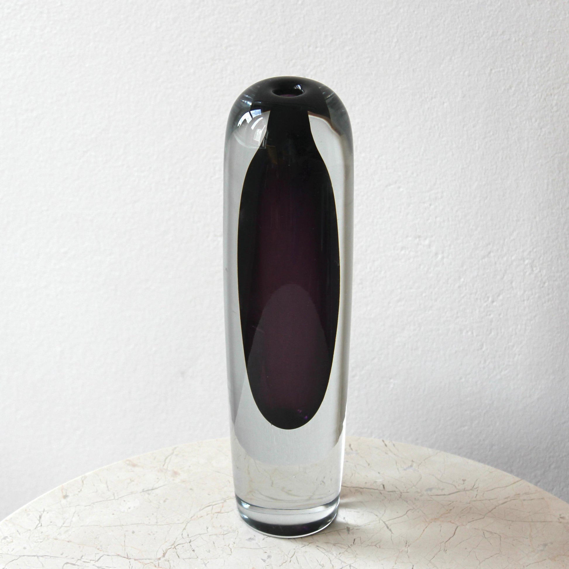 This lovely sommerso vase features solid clear hand blown crystal that encases a dark amethyst underlay. The beautiful elongated form has an ovoid-shaped cavity with a narrow opening, making it ideal for beautifully highlighting a single stem.