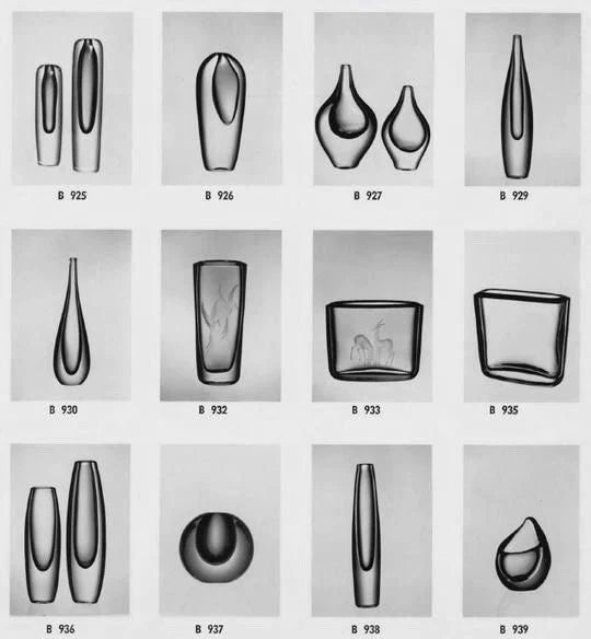 The model B925 can be found in Strömbergshyttan's catalogues from the early 60s (see photo). It may have been designed by Gunnar Nylund or his earlier designs may have inspired Asta Strömberg to create this piece, as she also designed for Strömbergshyttan during the mid-century period. Given the date of release, I have attributed it to Strömberg.