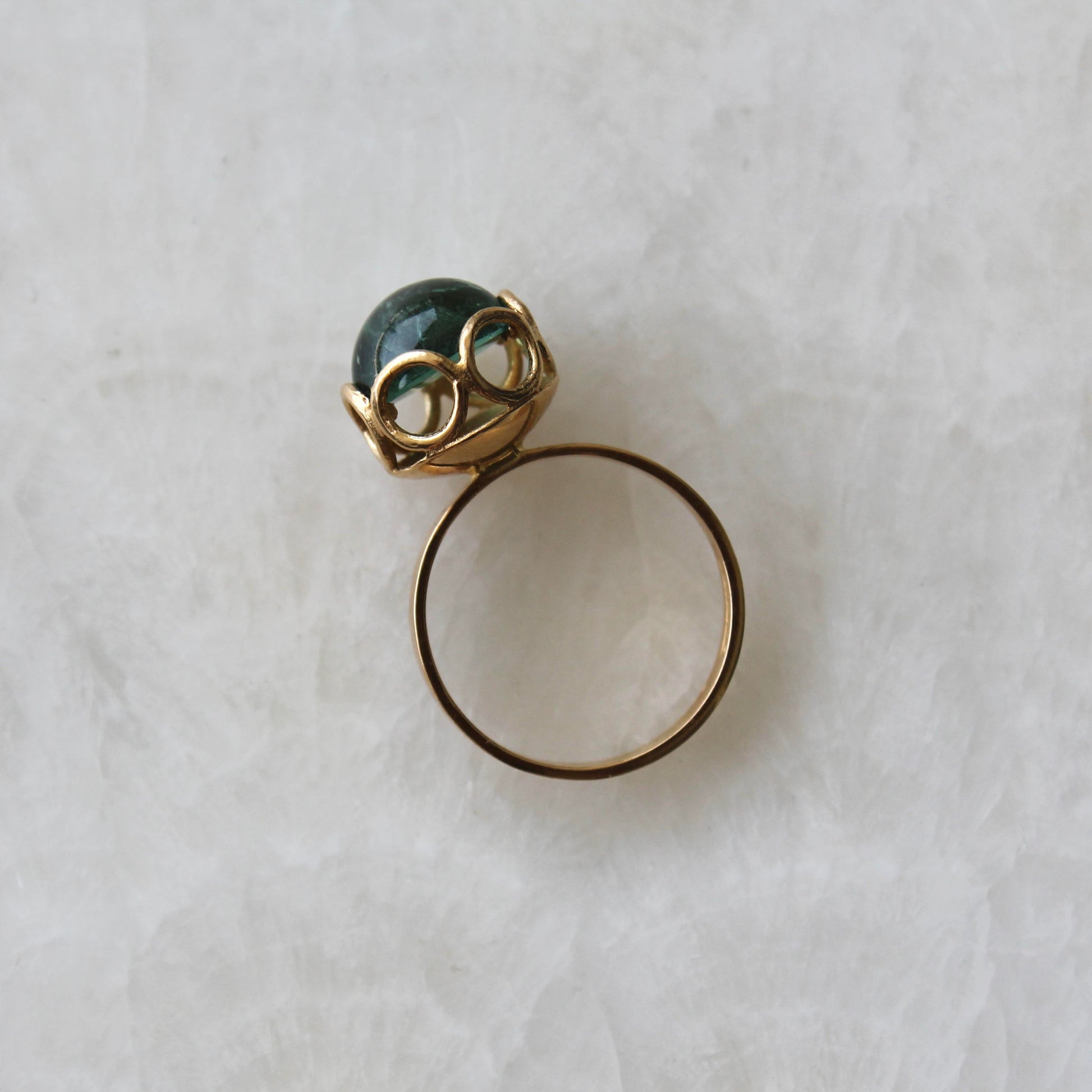 This beautiful ring features solid 18k gold that highlights a sea-foam green cabochon tourmaline in a raised circular-motif setting. It was designed by Ateljé Stigbert, Stockholm (an offshoot of Heribert Engelbert Ab) in 1970.