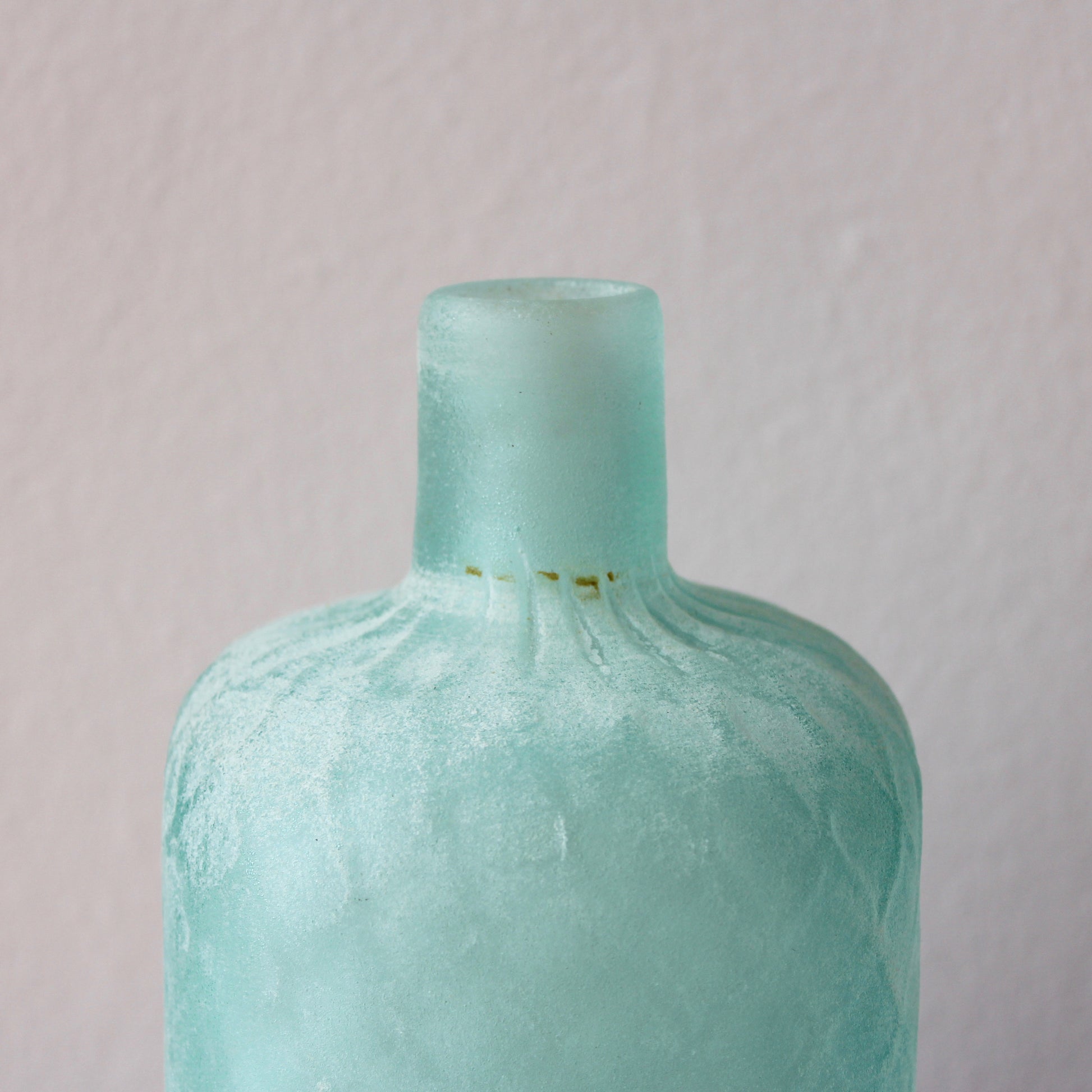 Scavo means excavation in English. The technique involves applying different substances to the surface of the glass, which when heated fuse to create an effect similar to weathering, thereby imitating glass from an archeological excavation.