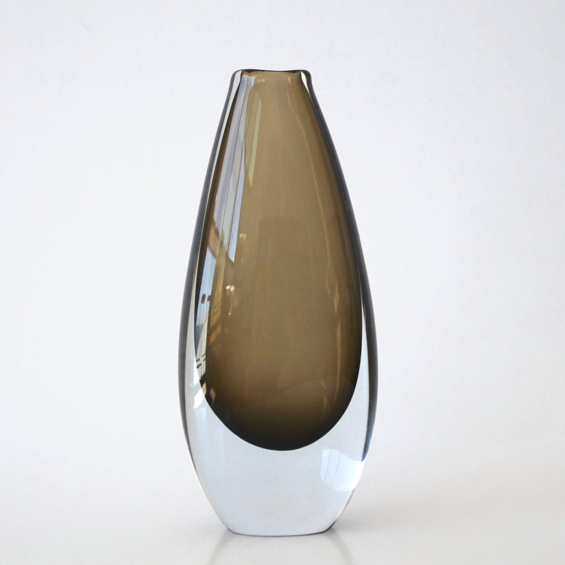 A tear-drop sommerso vase featuring handblown solid clear Stromberg crystal with a beautiful translucent sepia underlay. Known as the model B894, this vase is in excellent vintage condition with no notches, discolouration, cracks or repairs. It looks great paired with other models from Strömbergshyttan.