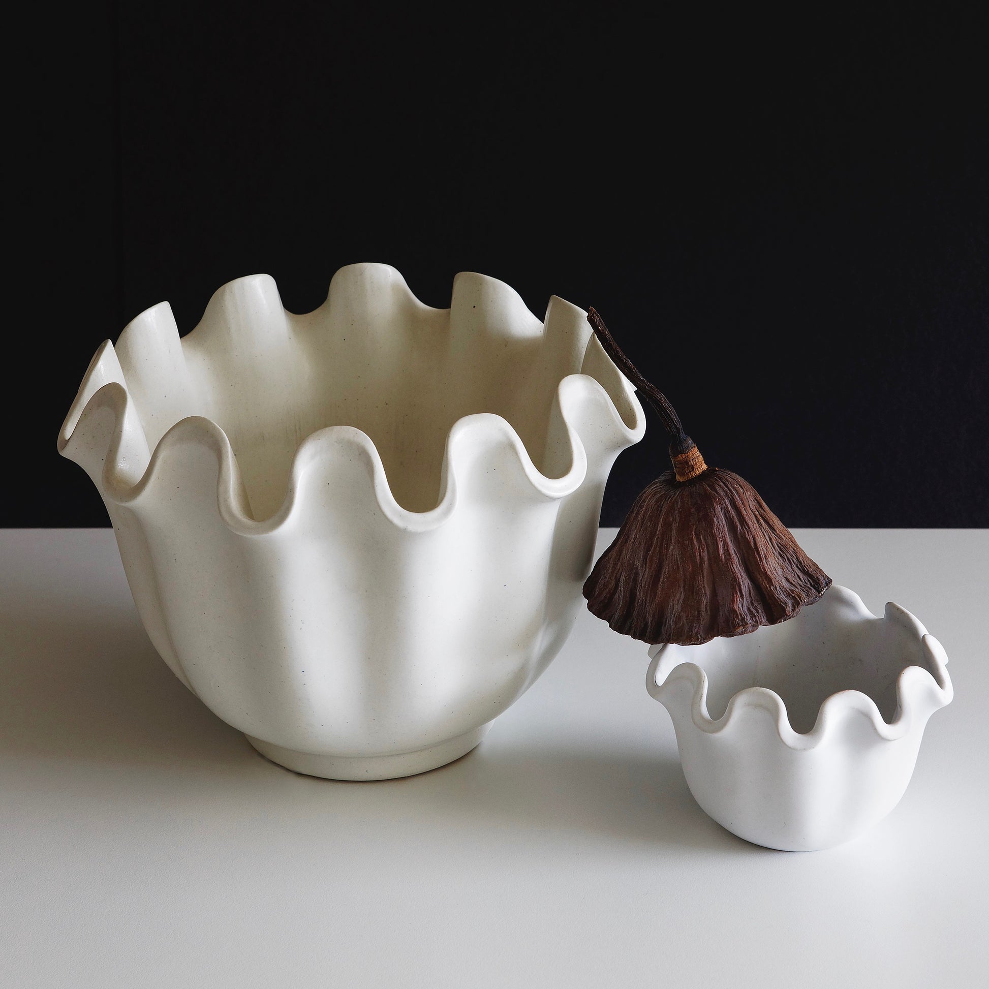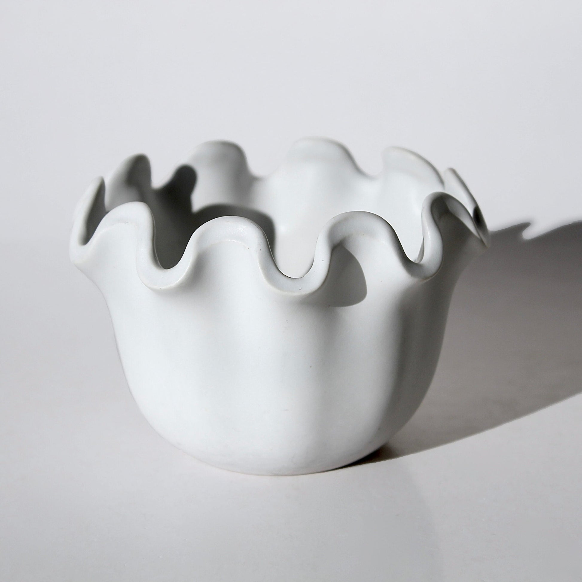 This hand-thrown biomorphic vessels features a deep fluted edge and creamy white Carrara glaze. It was designed by the famous Wilhelm Kåge during the midcentury period.