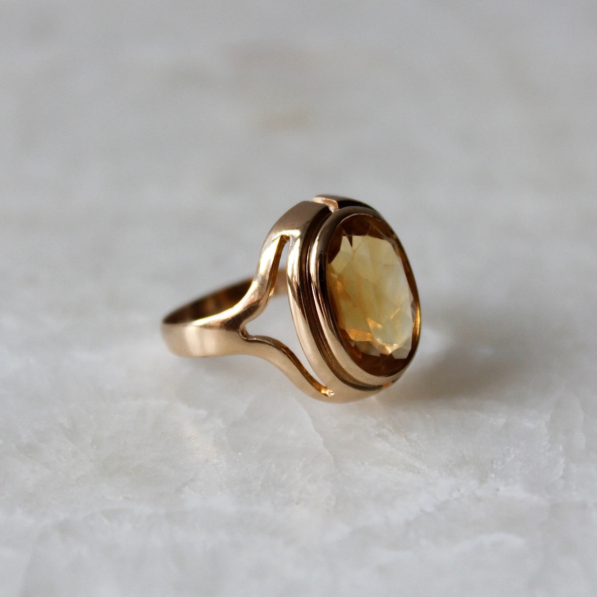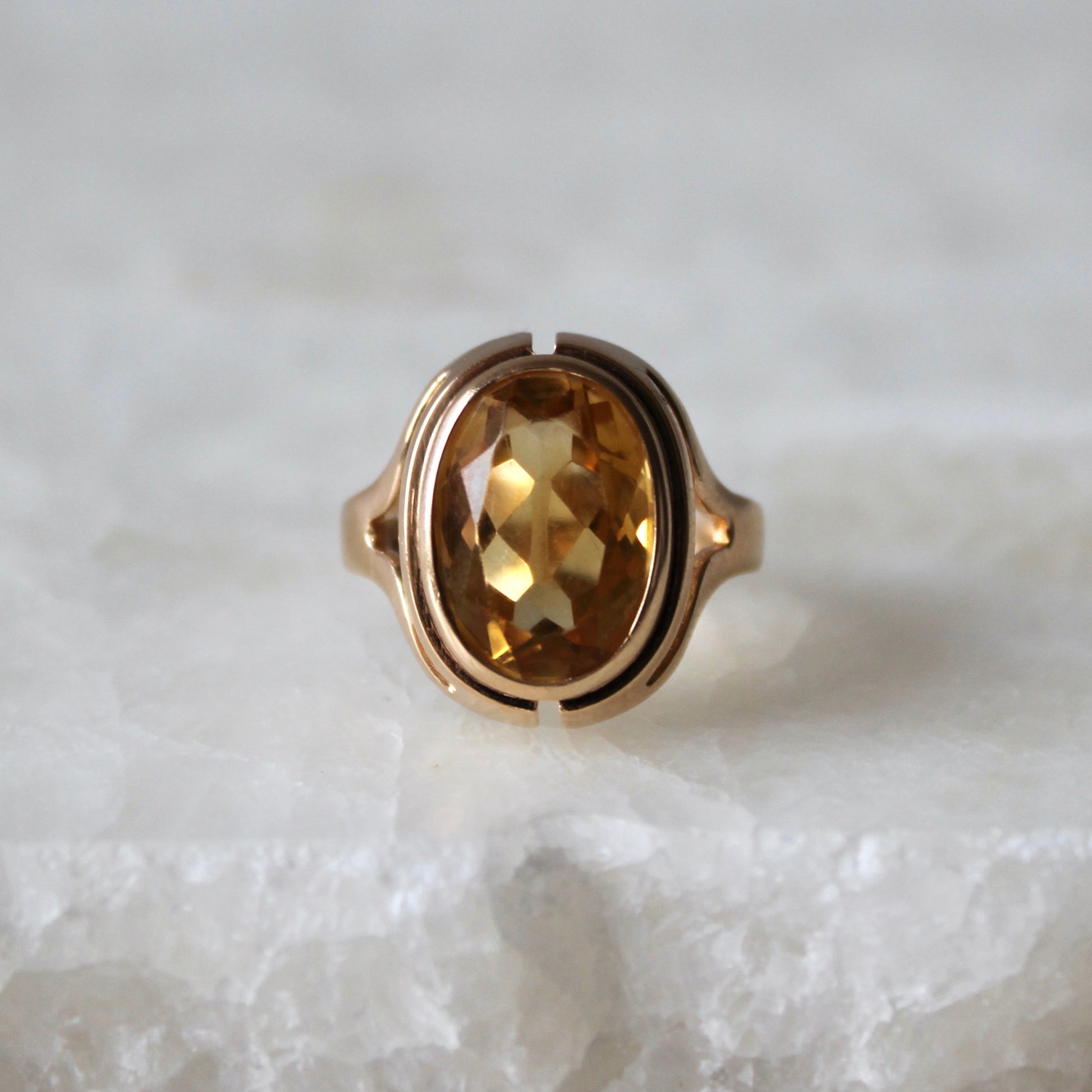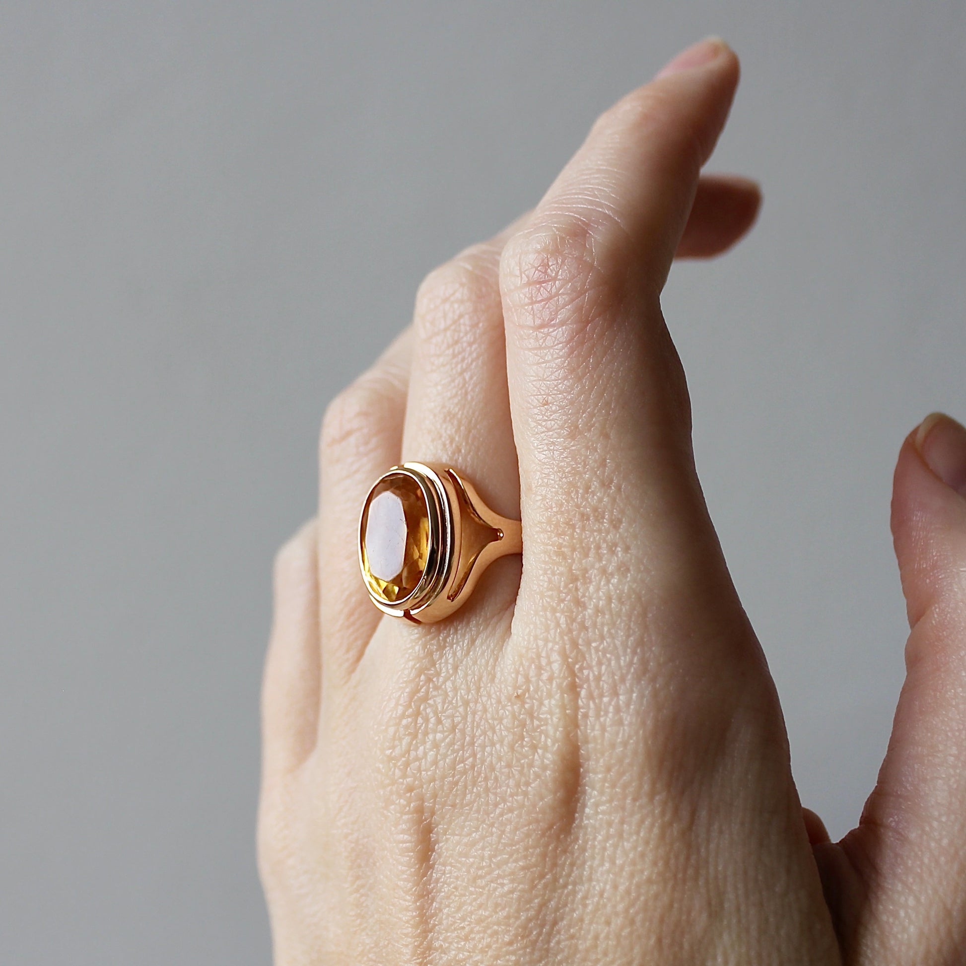 This elegant original Modernist ring features an oval lab-created yellow spinel framed by solid 14k gold. It was designed by award-winning industrial engineer Eero Rislakki (1924-2017) and beautifully crafted by N. Westerback Oy in 1962.