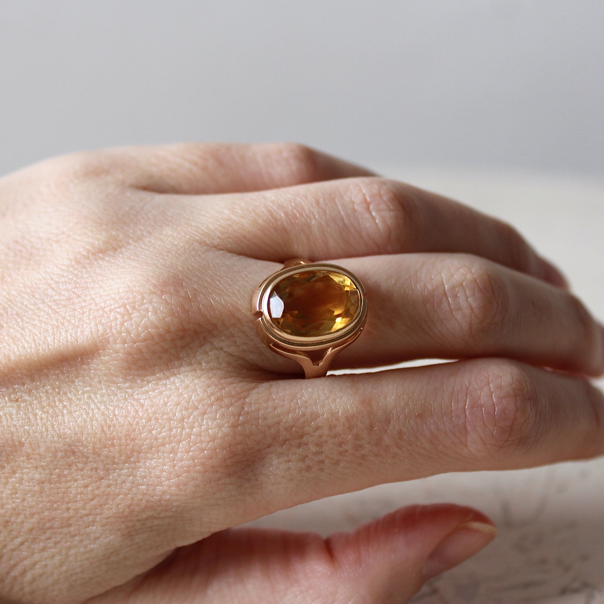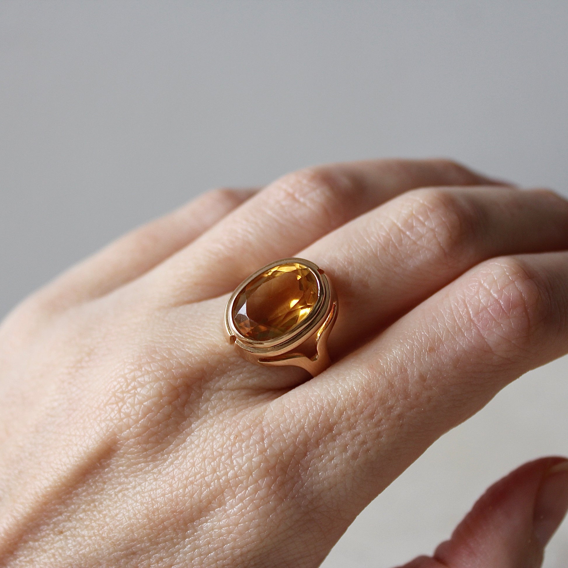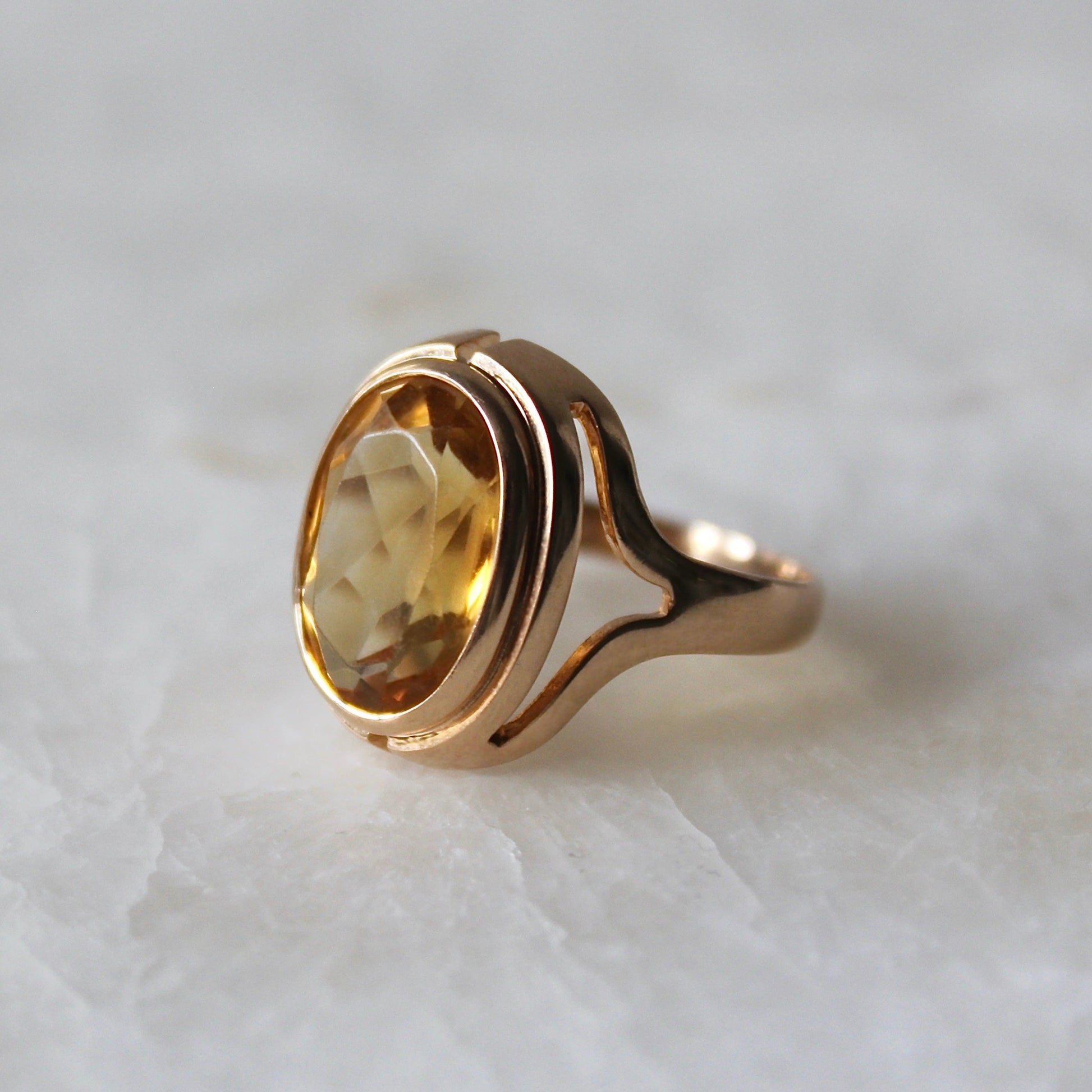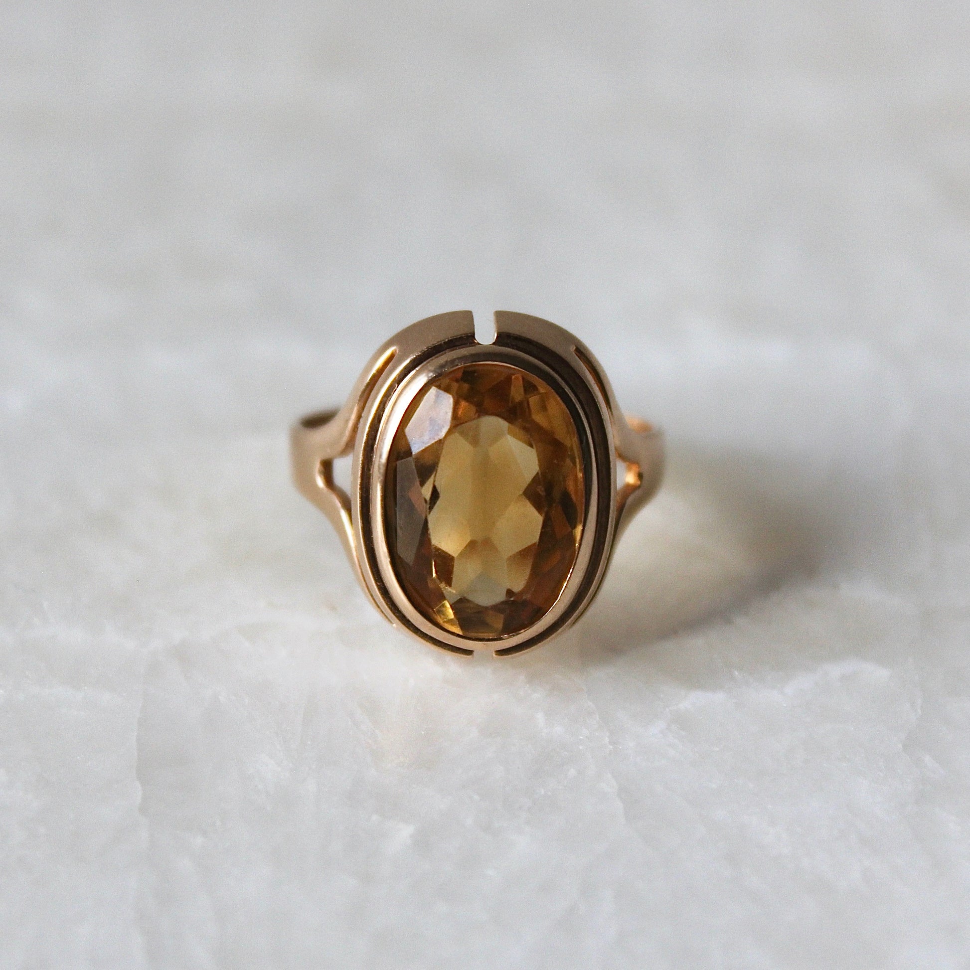 This elegant original Modernist ring features an oval lab-created yellow spinel framed by solid 14k gold. It was designed by award-winning industrial engineer Eero Rislakki (1924-2017) and beautifully crafted by N. Westerback Oy in 1962.