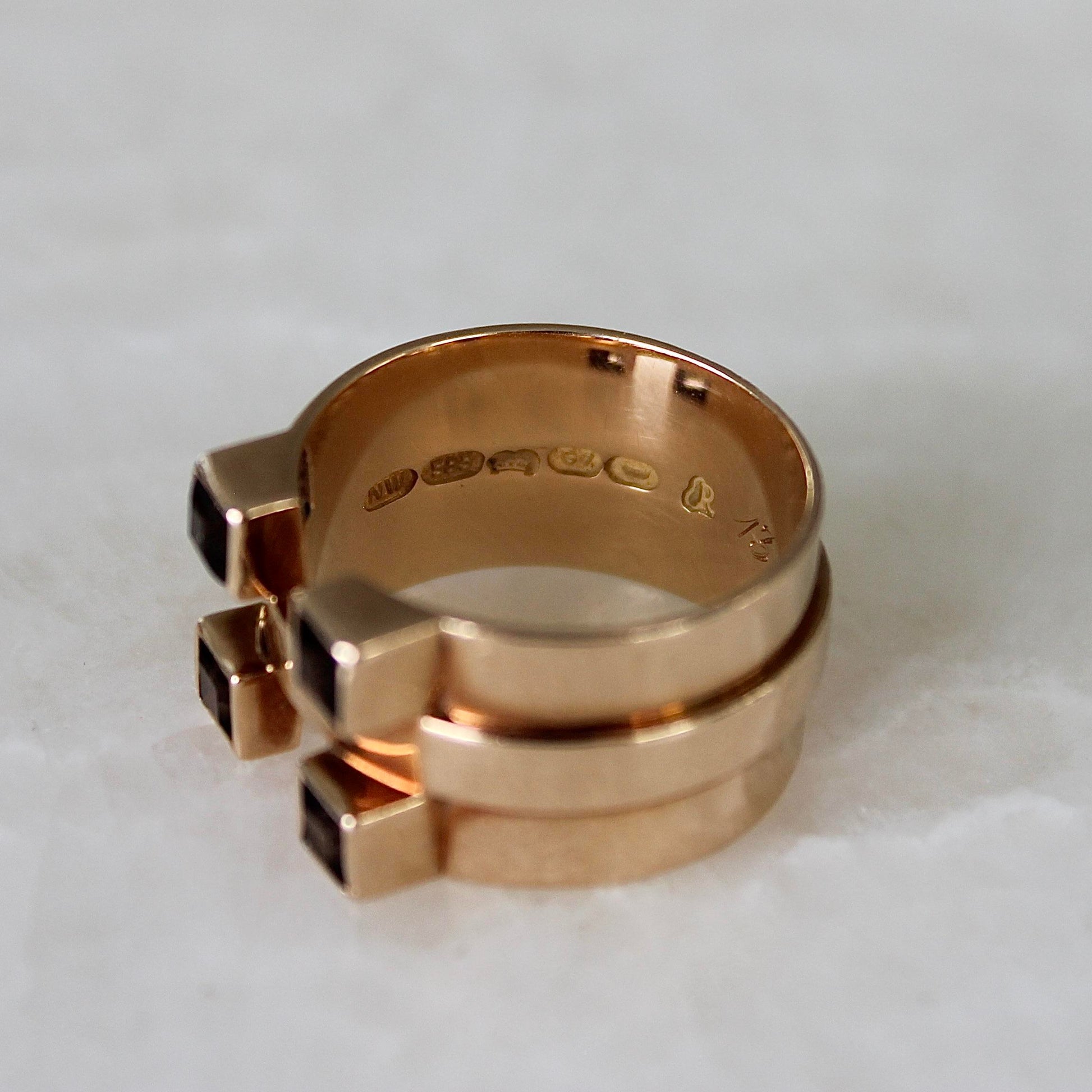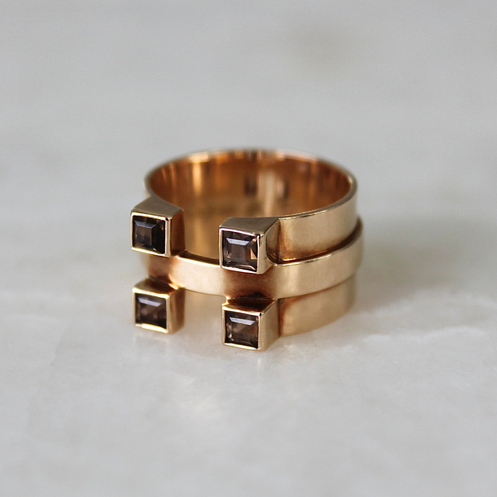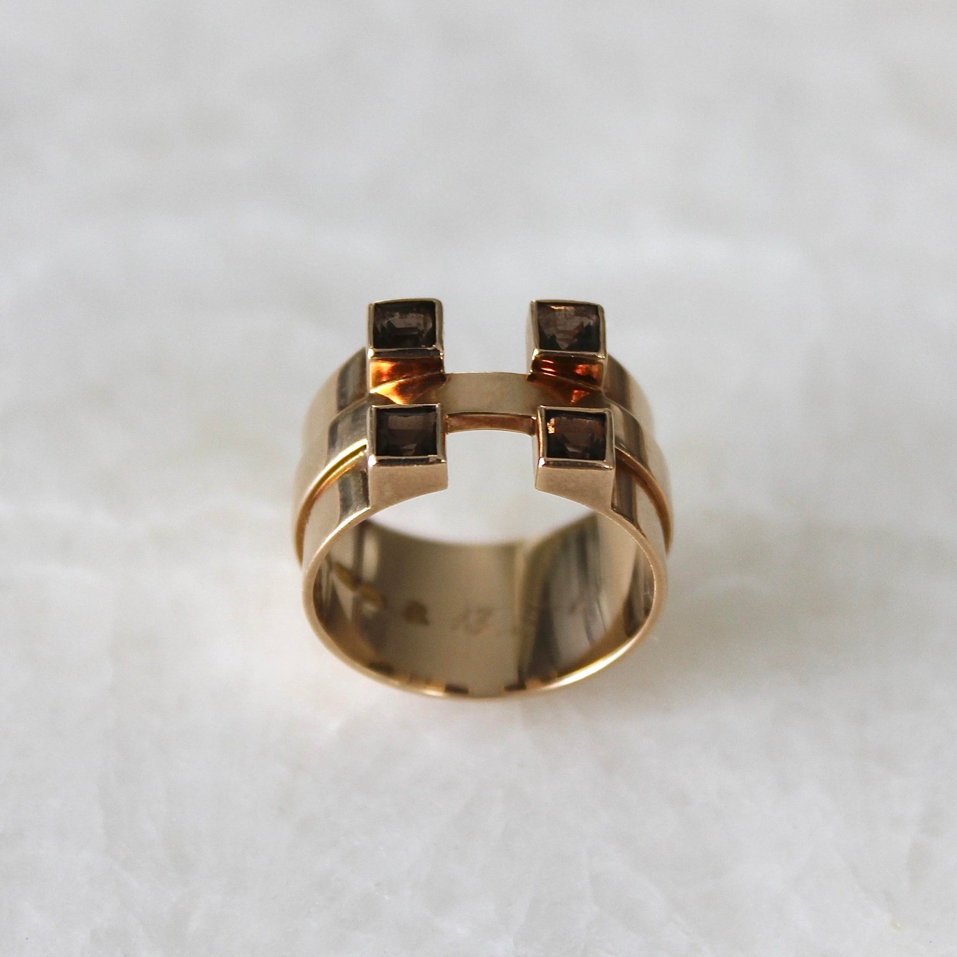 This stunning Modernist ring features solid 14k gold that frames four faceted square smoky quartz. It was beautifully designed by award-winning industrial engineer and designer Eero Rislakki (1924-2017) for N. Westerback Oy, Helsinki in 1960.