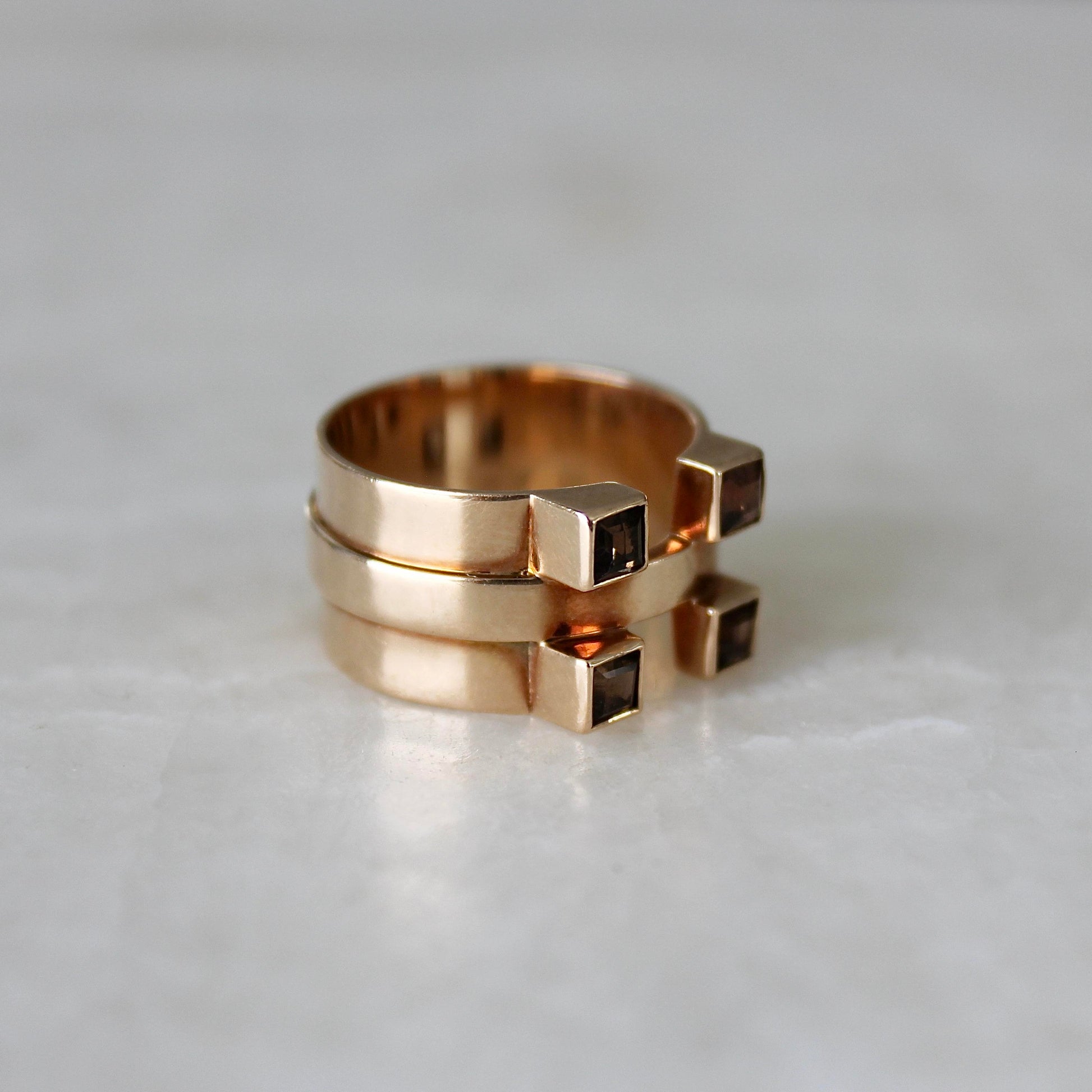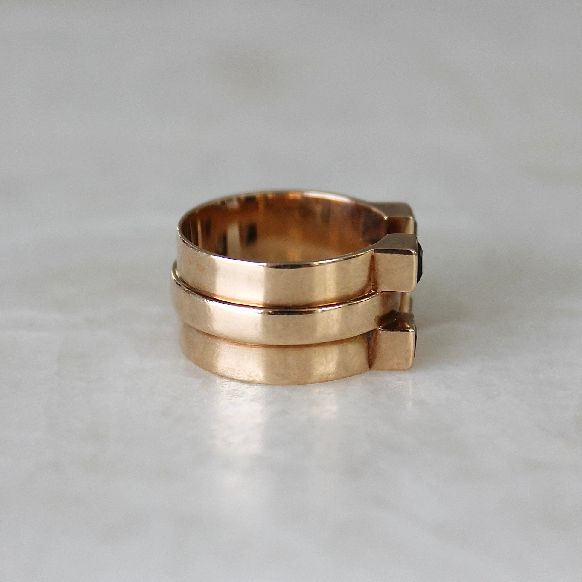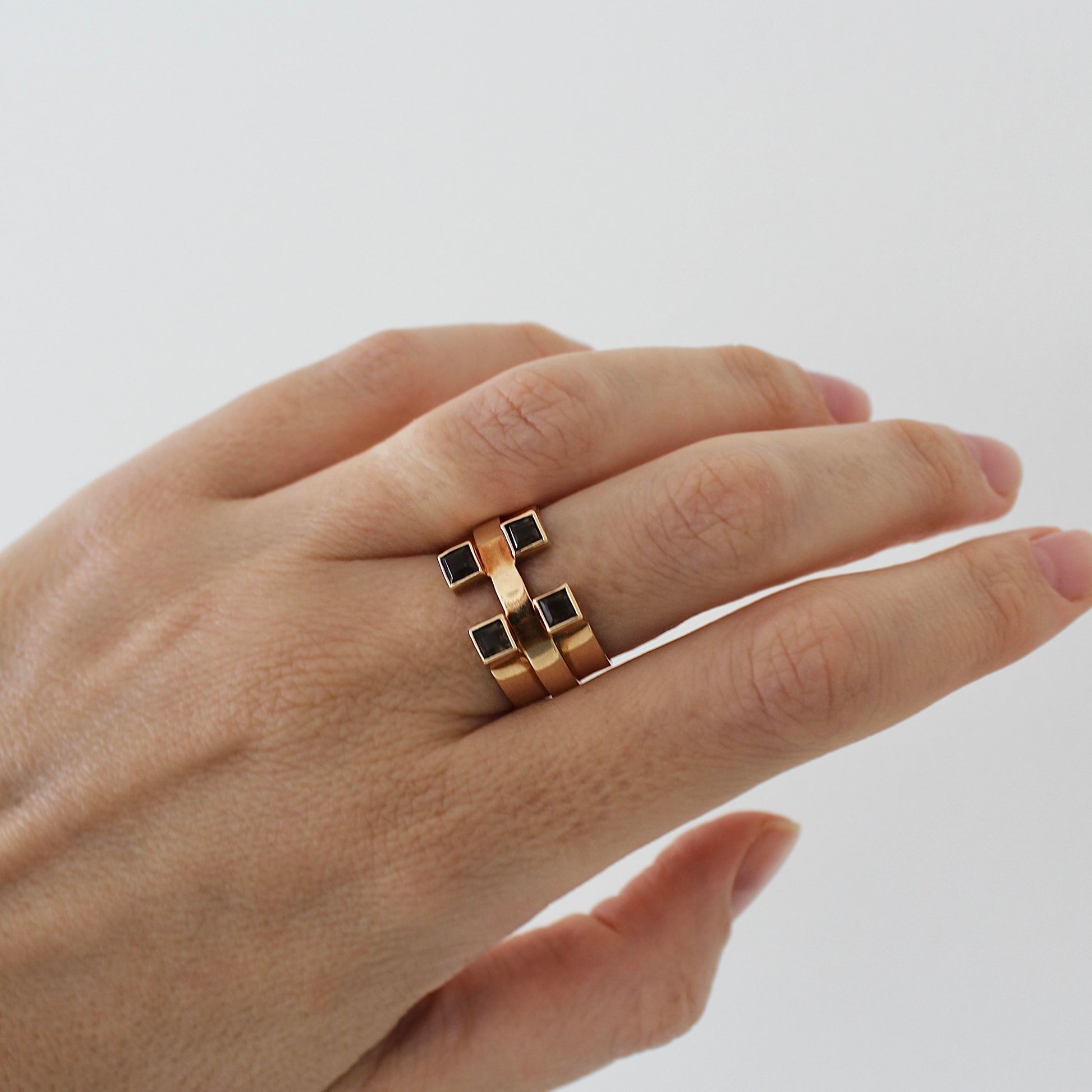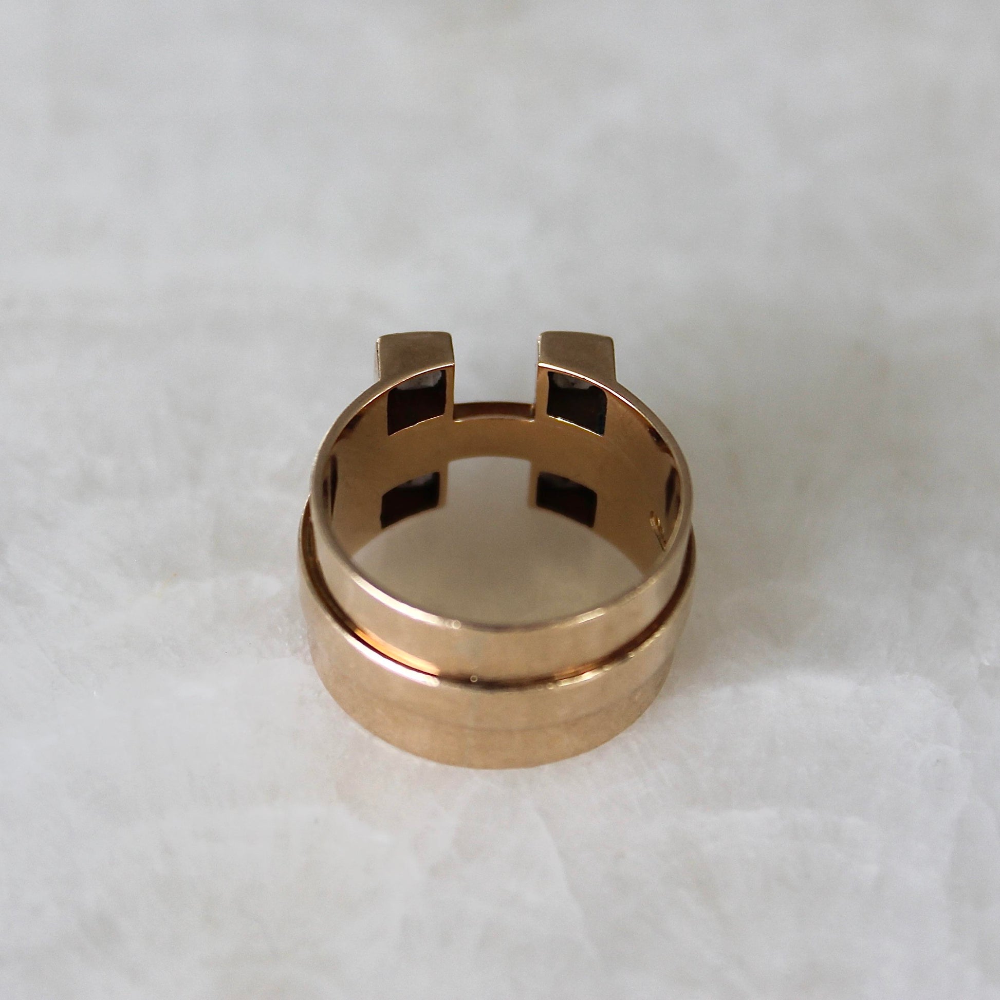 This stunning Modernist ring features solid 14k gold that frames four faceted square smoky quartz. It was beautifully designed by award-winning industrial engineer and designer Eero Rislakki (1924-2017) for N. Westerback Oy, Helsinki in 1960.