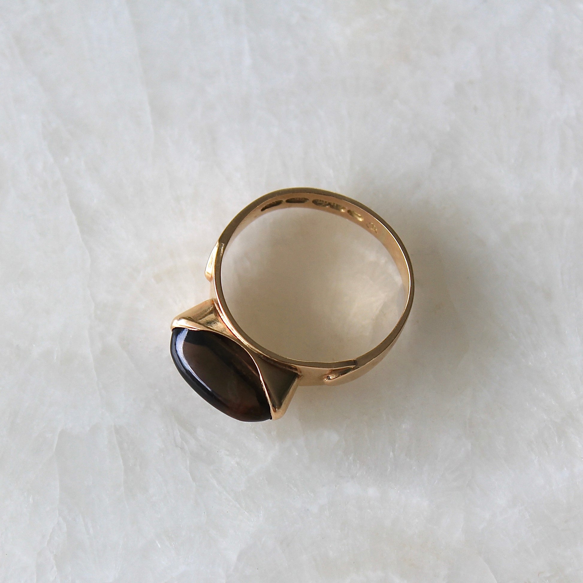 This elegant Modernist ring features solid 14k gold with a beautiful oval cabochon smoky quartz. It was designed by award-winning industrial engineer and designer Eero Rislakki (1924-2017) for N. Westerback Oy, Helsinki in 1961.