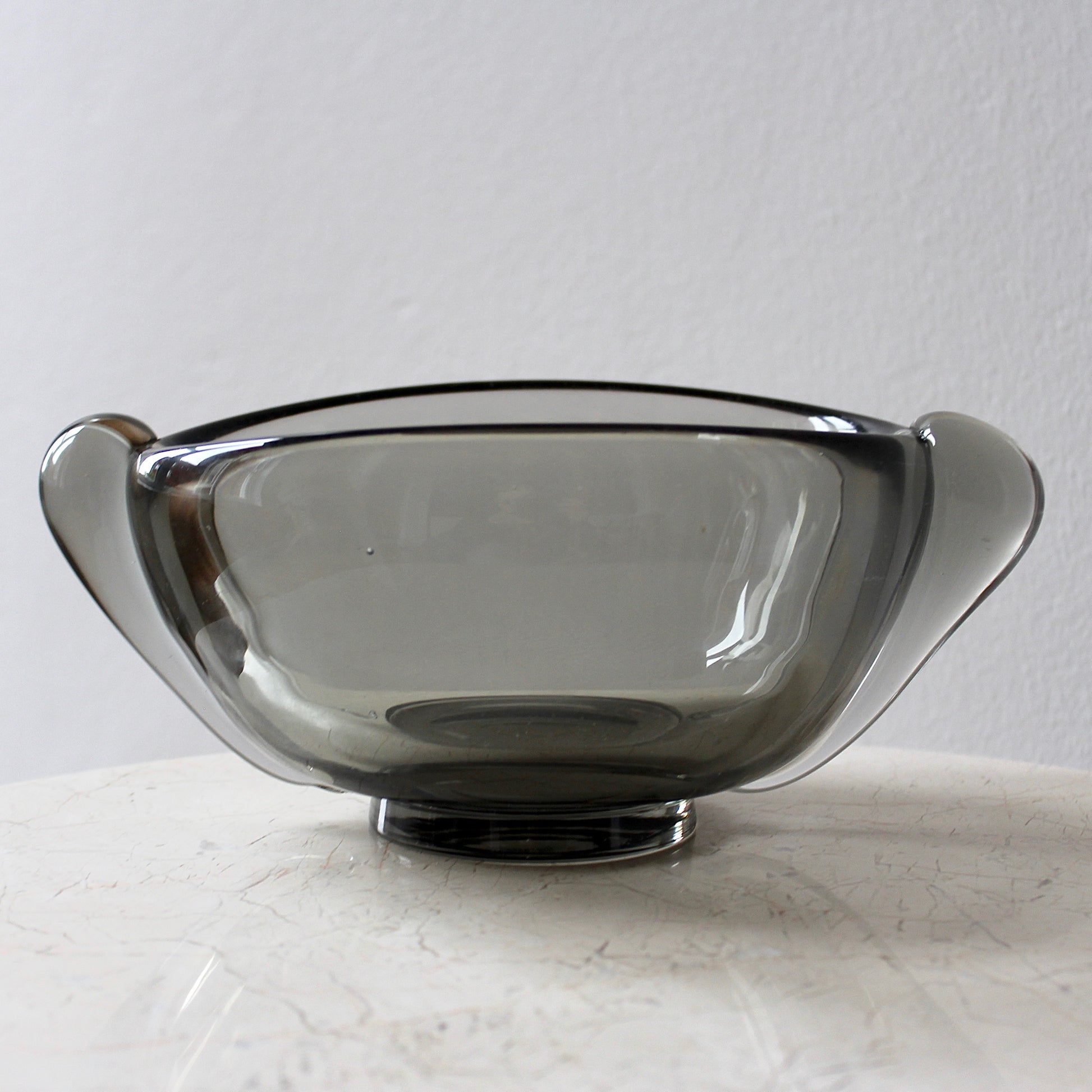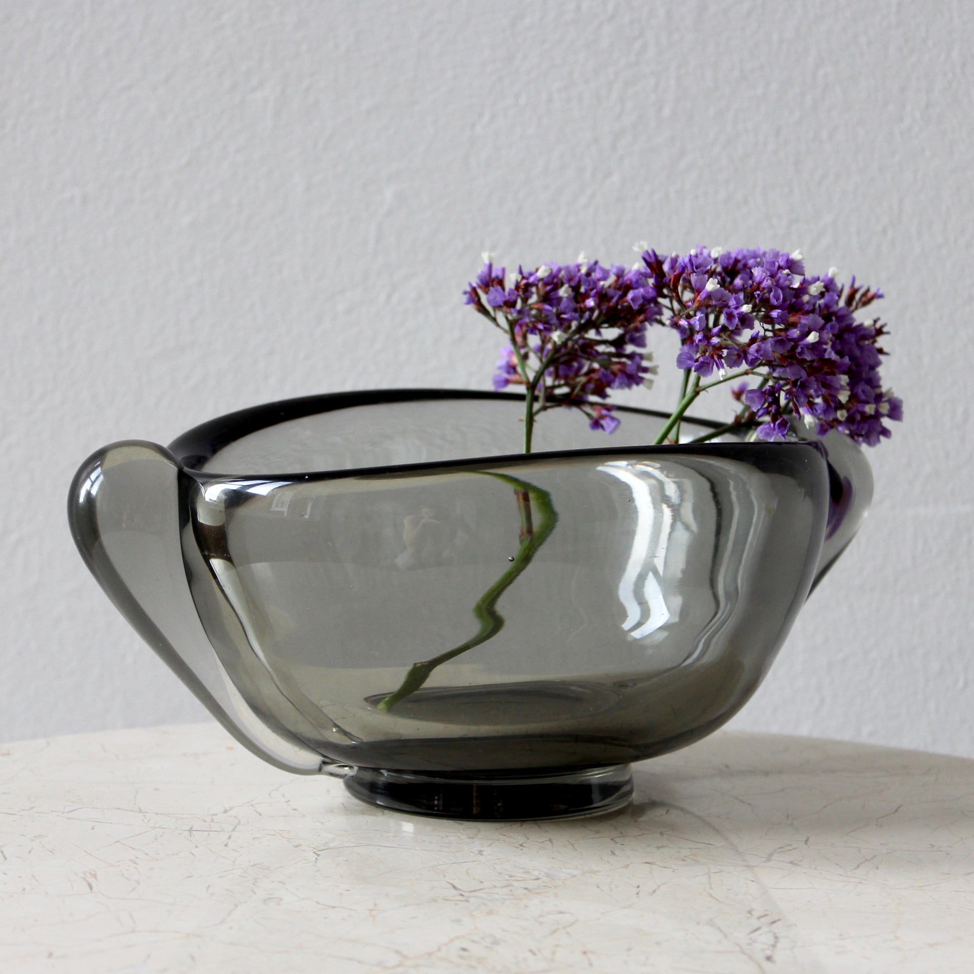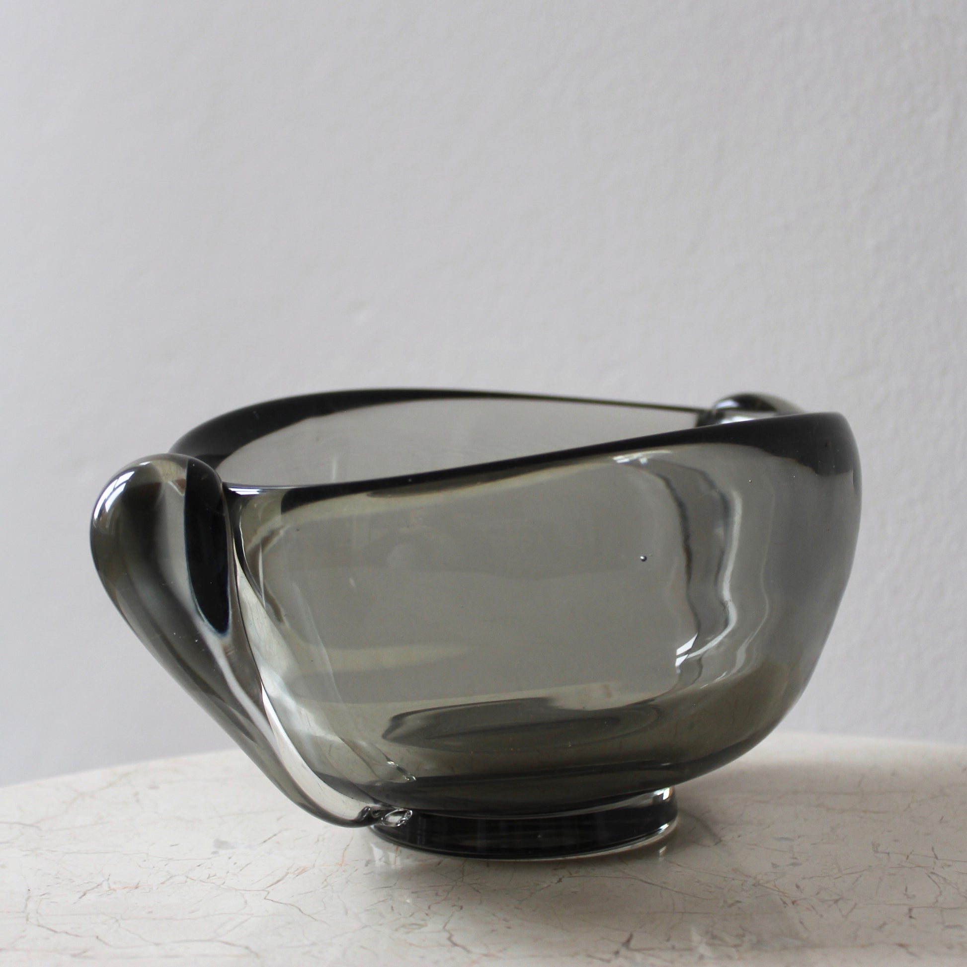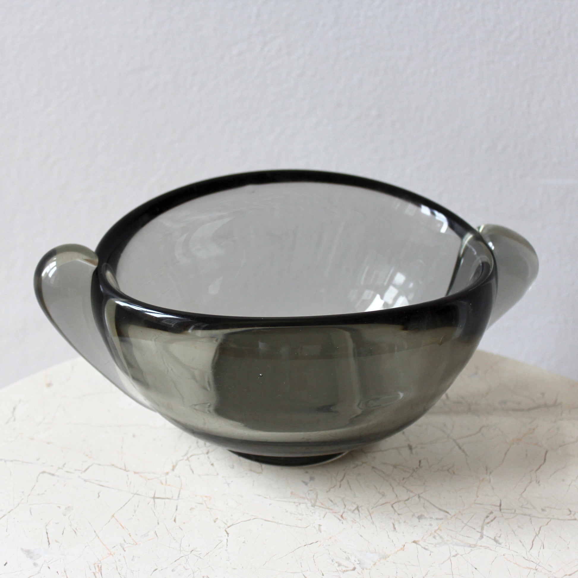 This elegant piece was designed by Elis Bergh for Kosta glassworks. It features beautiful solid smokey olive transparent crystal with applied handles and footed base.