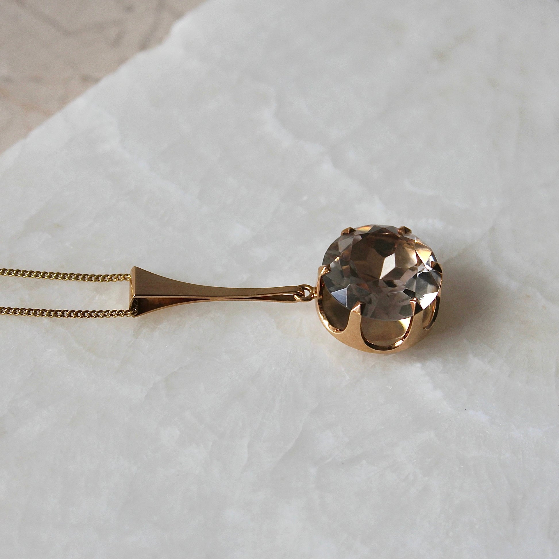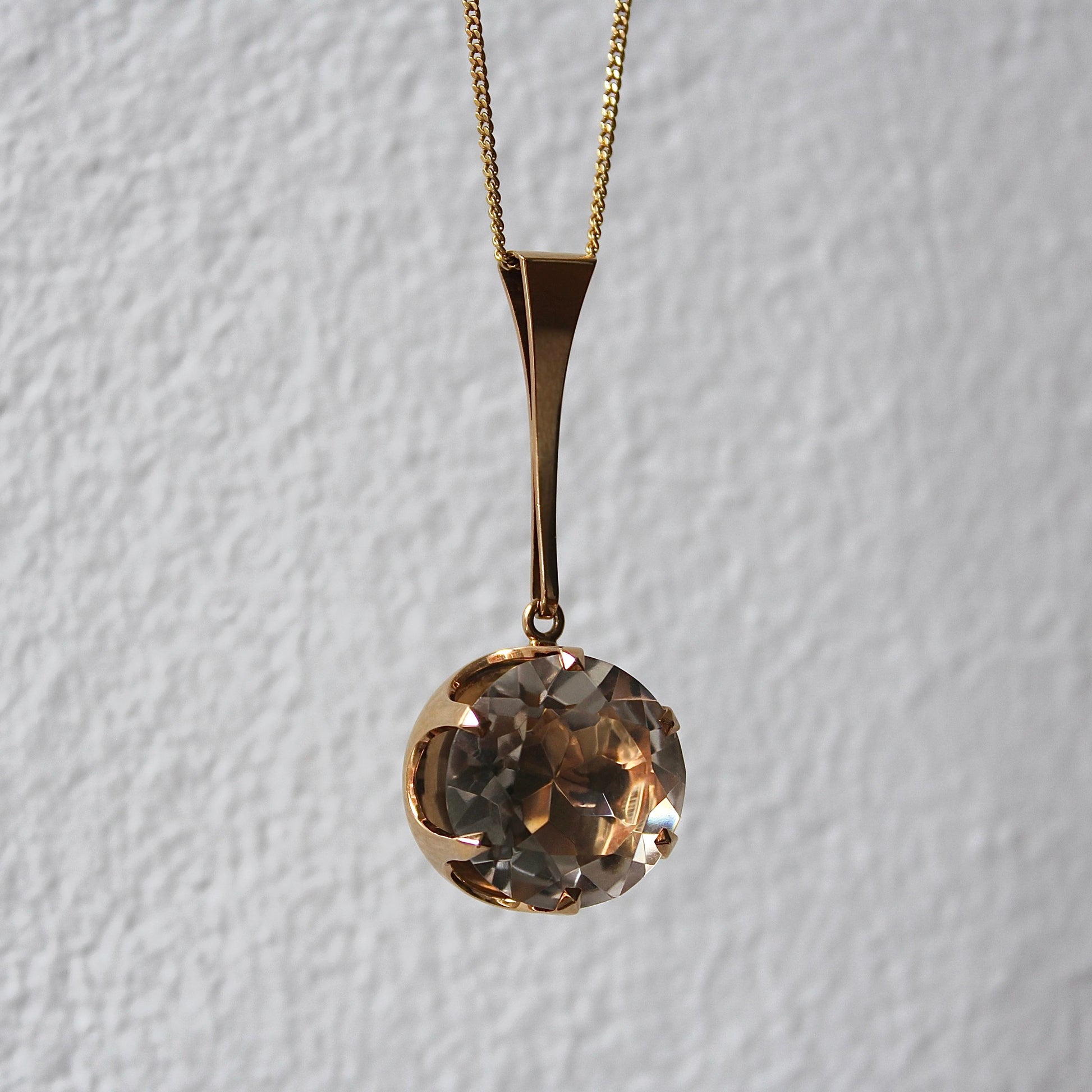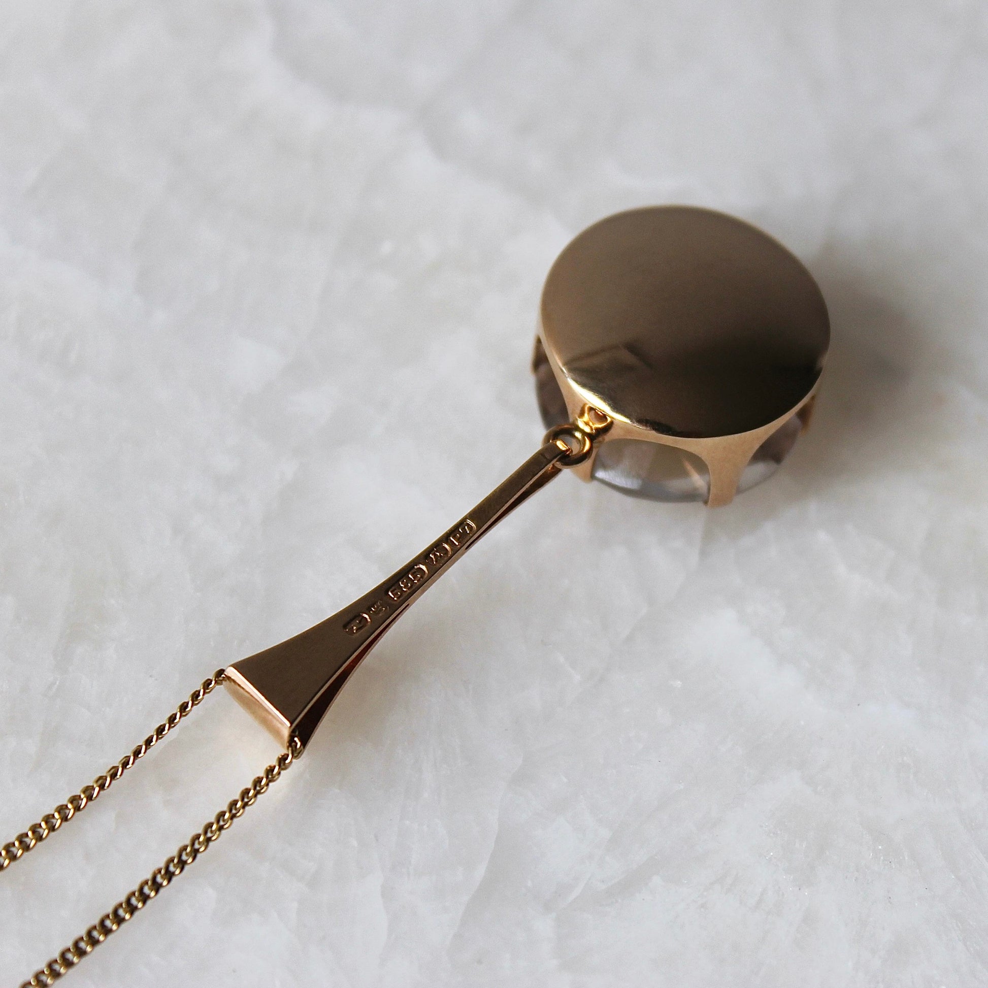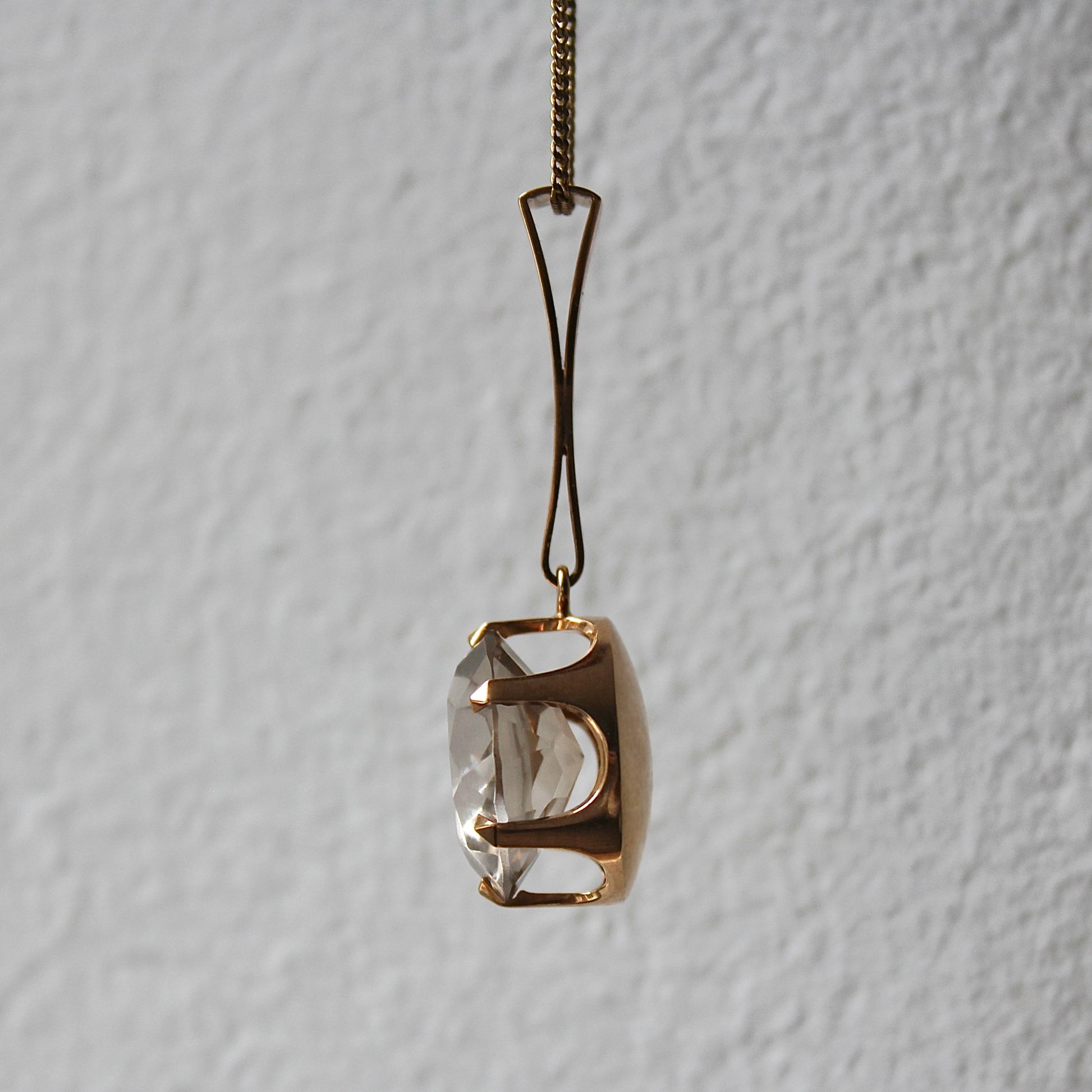 This elegant original Modernist pendant features solid 14k gold that frames a beautiful large facetted rock crystal (clear quartz). It was designed by the famous Elis Kauppi and made by his workshop Kupittaan Kulta in 1968.