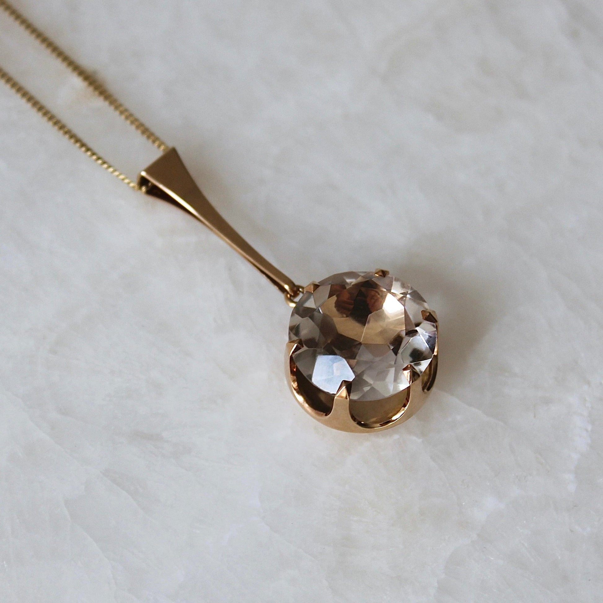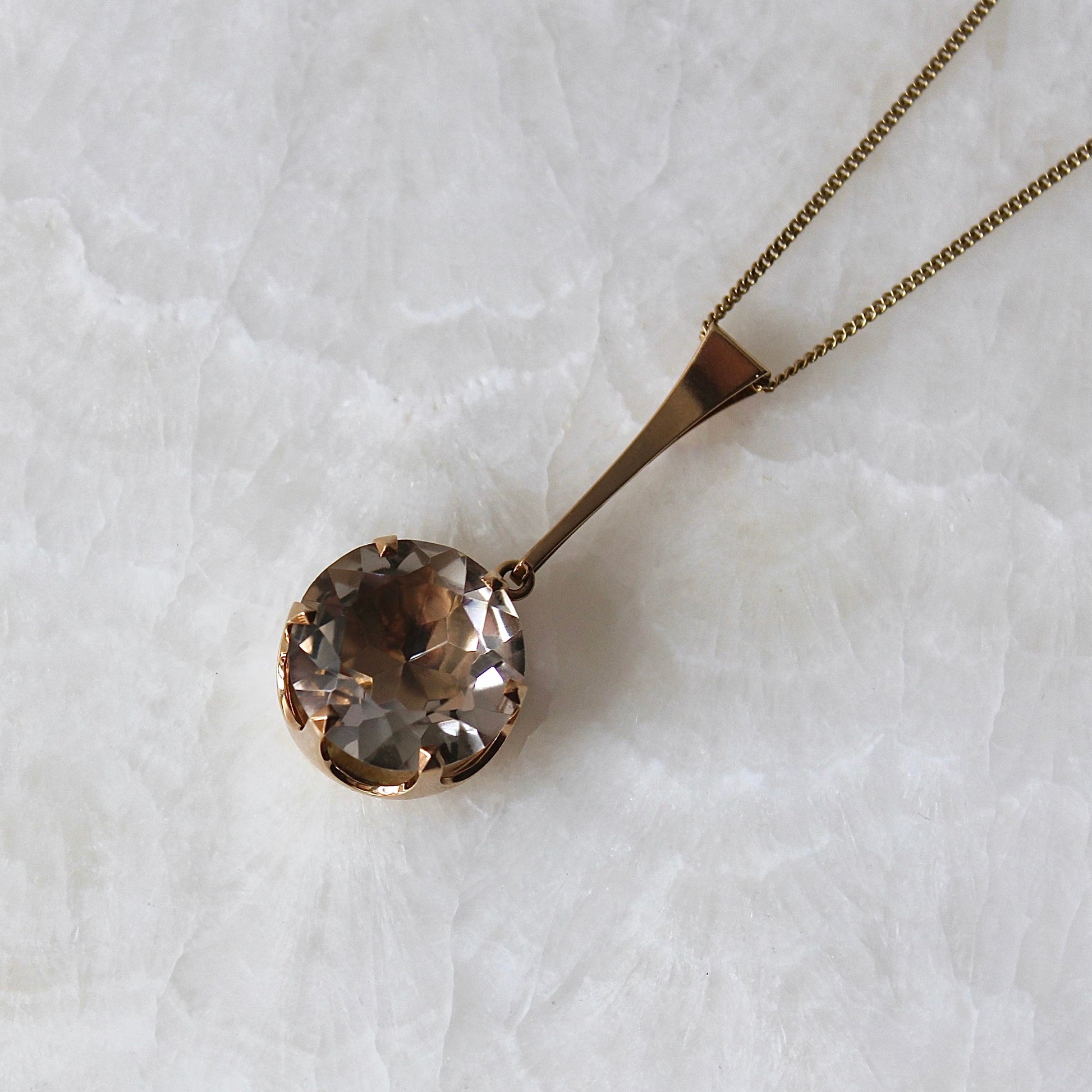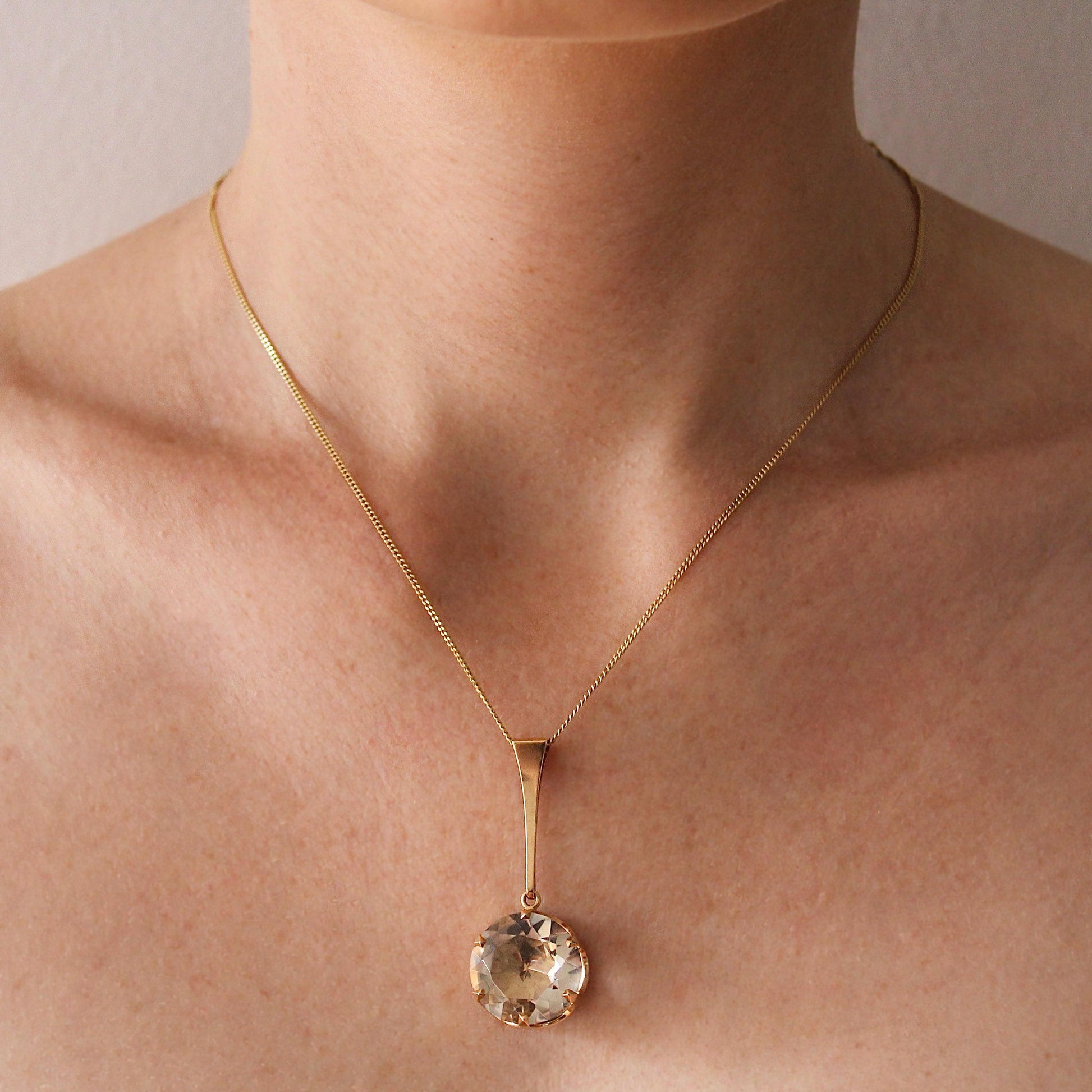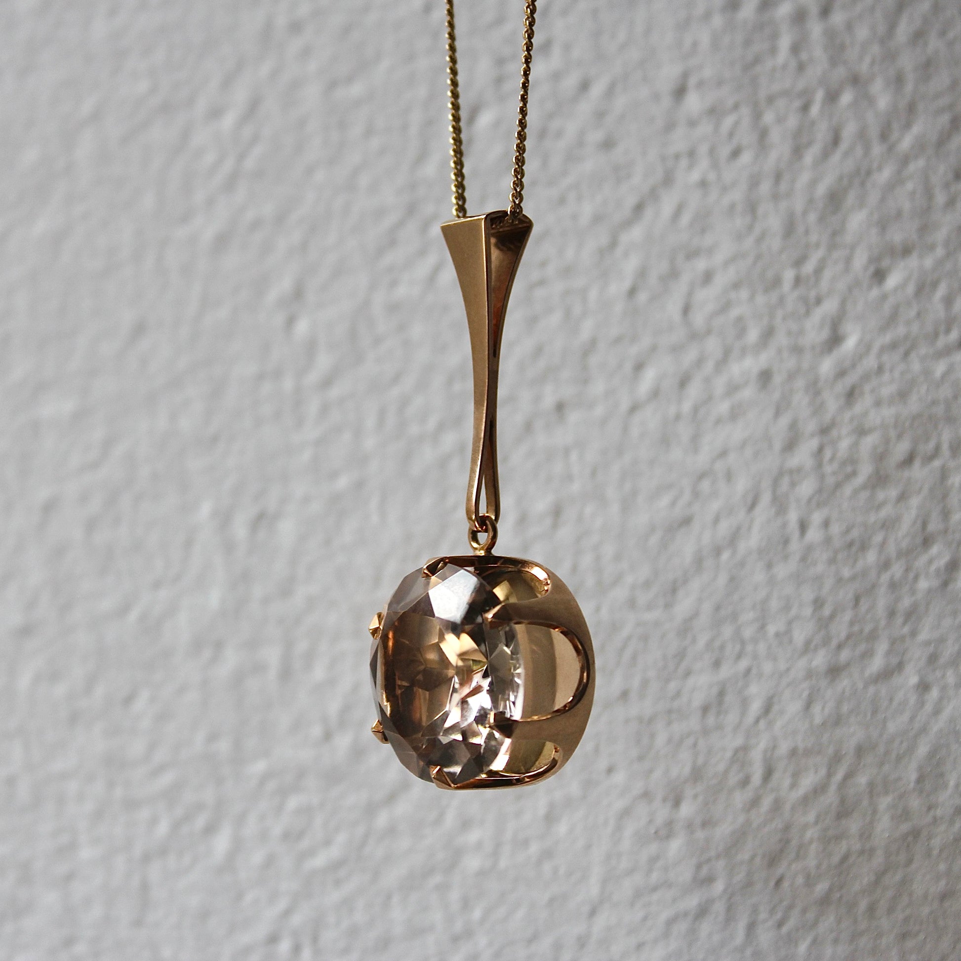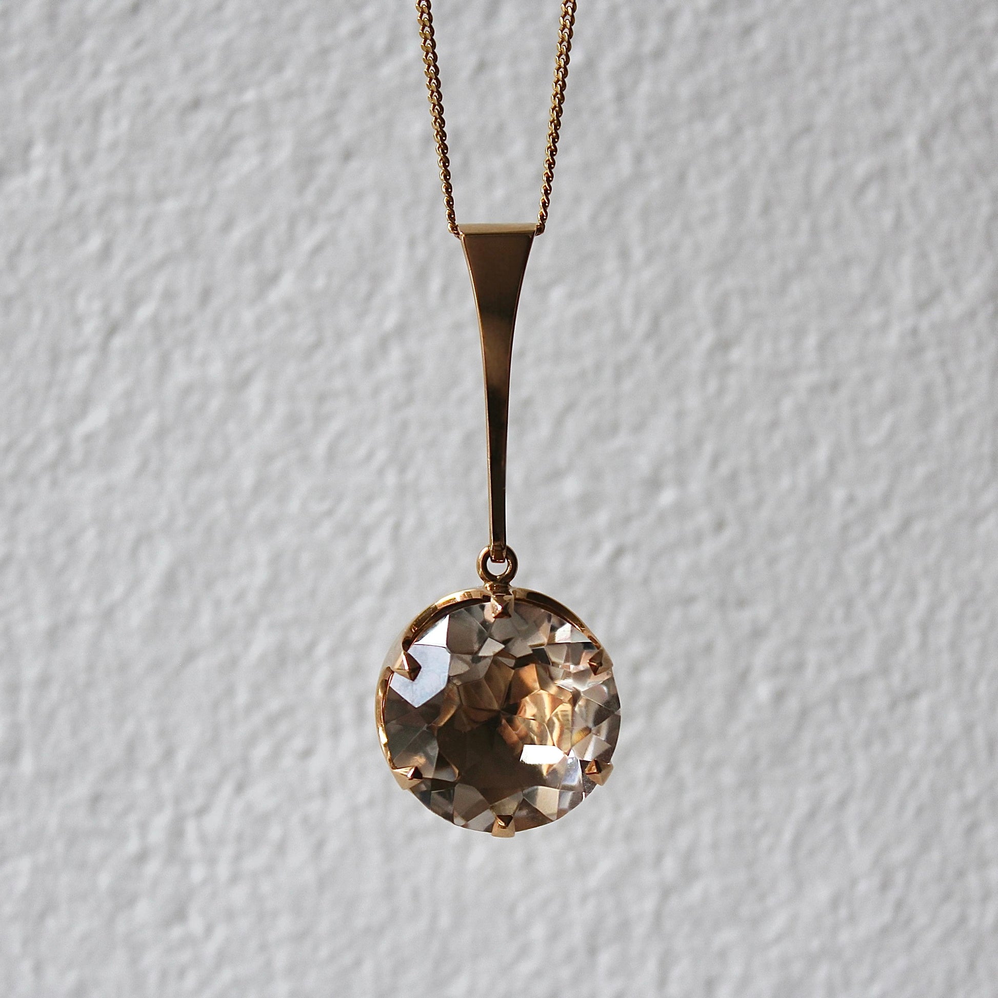 This elegant original Modernist pendant features solid 14k gold that frames a beautiful large facetted rock crystal (clear quartz). It was designed by the famous Elis Kauppi and made by his workshop Kupittaan Kulta in 1968.
