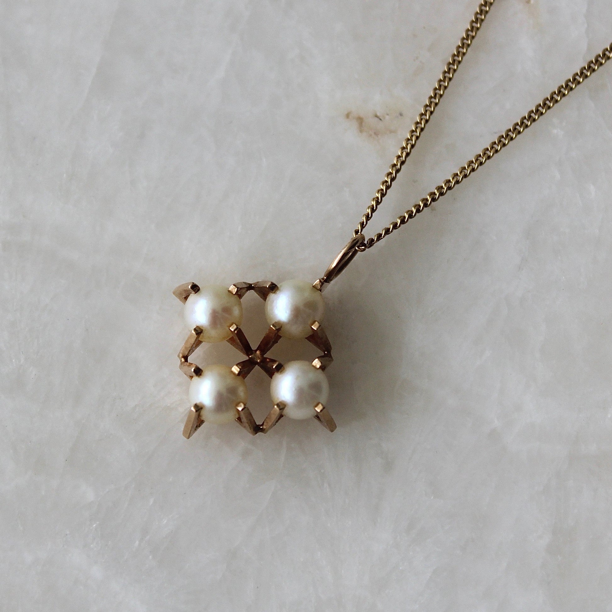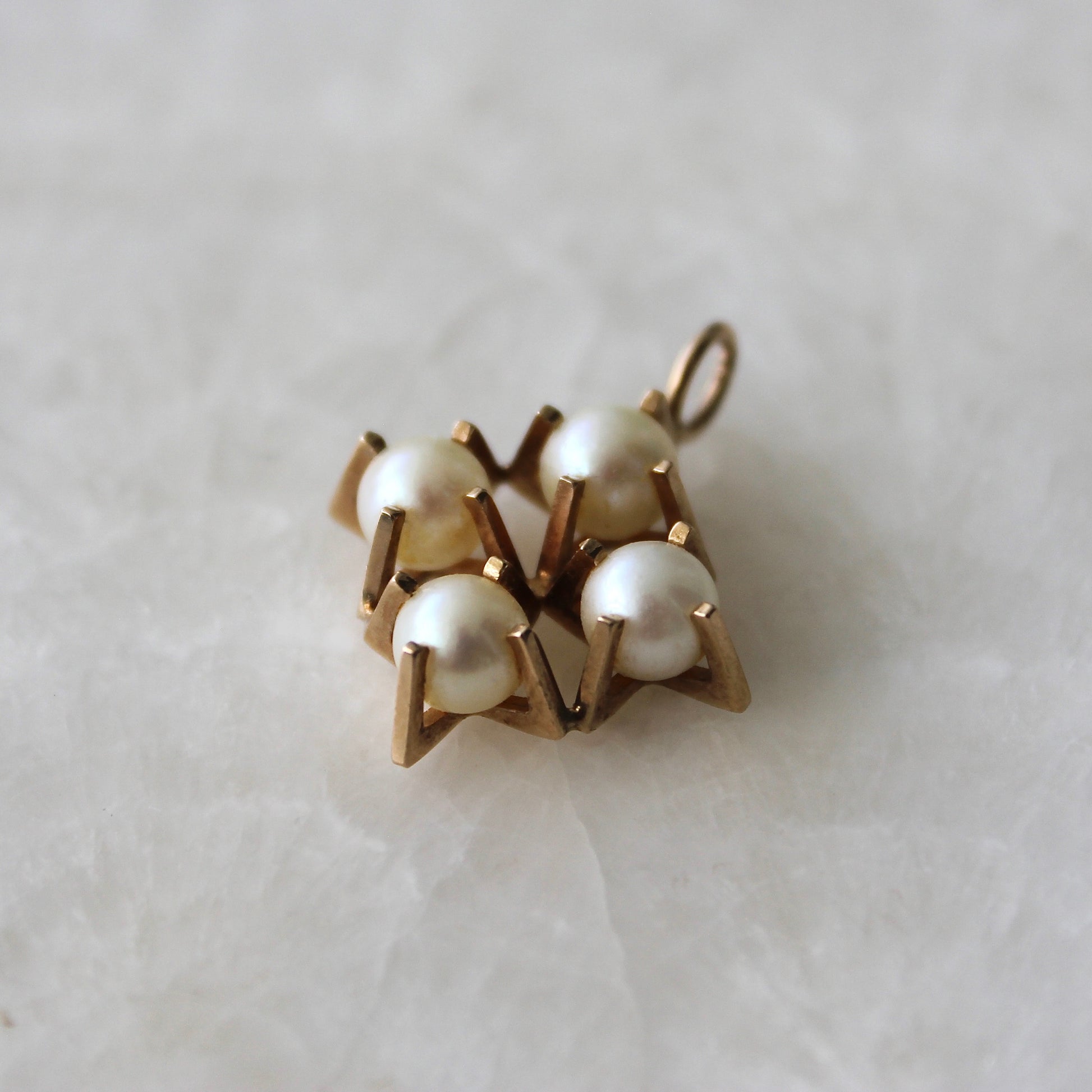 This beautiful Modernist pendant features a geometric pattern of solid 14k gold that holds four white pearls. It was designed by the famous Elis Kauppi and made by his workshop Kupittaan Kulta.