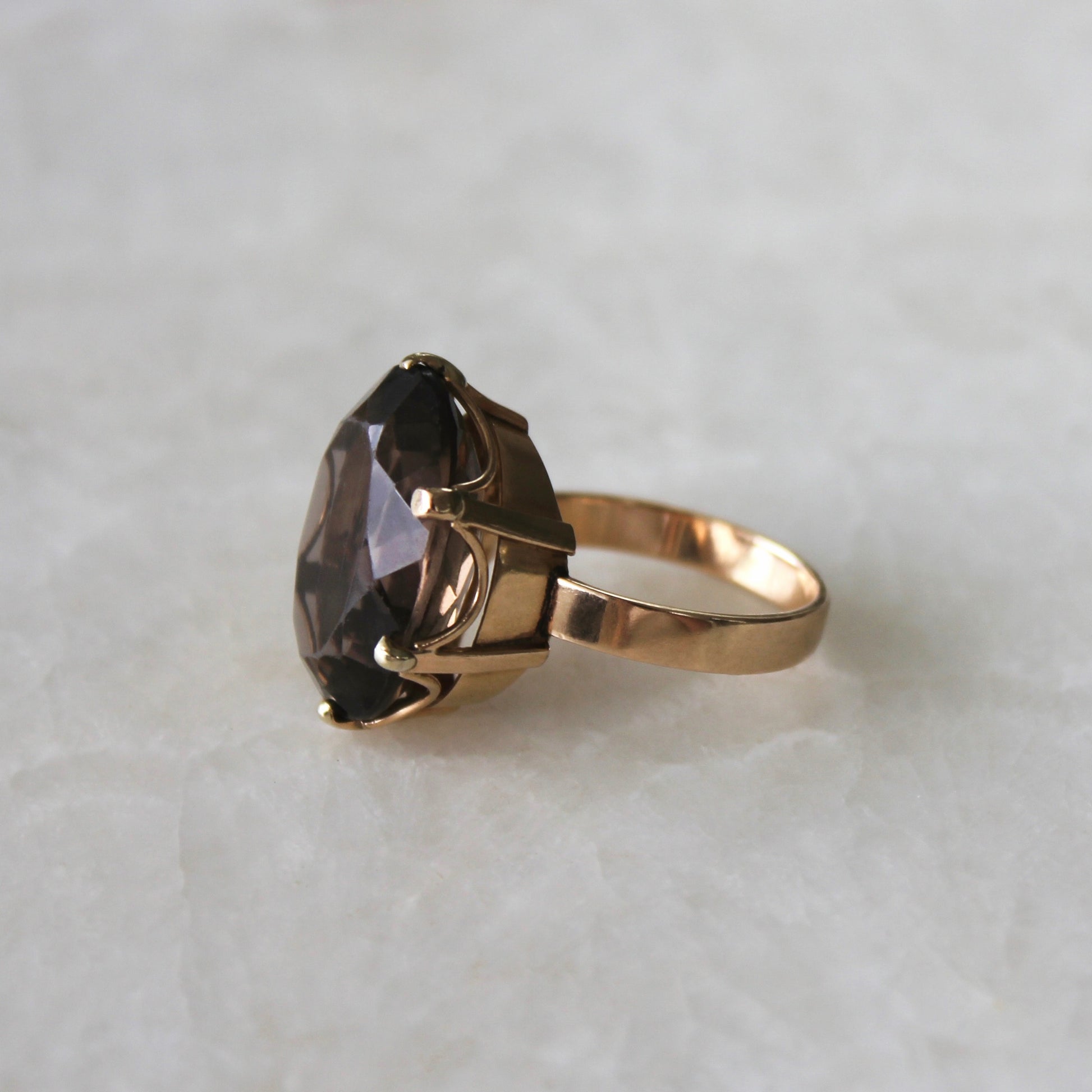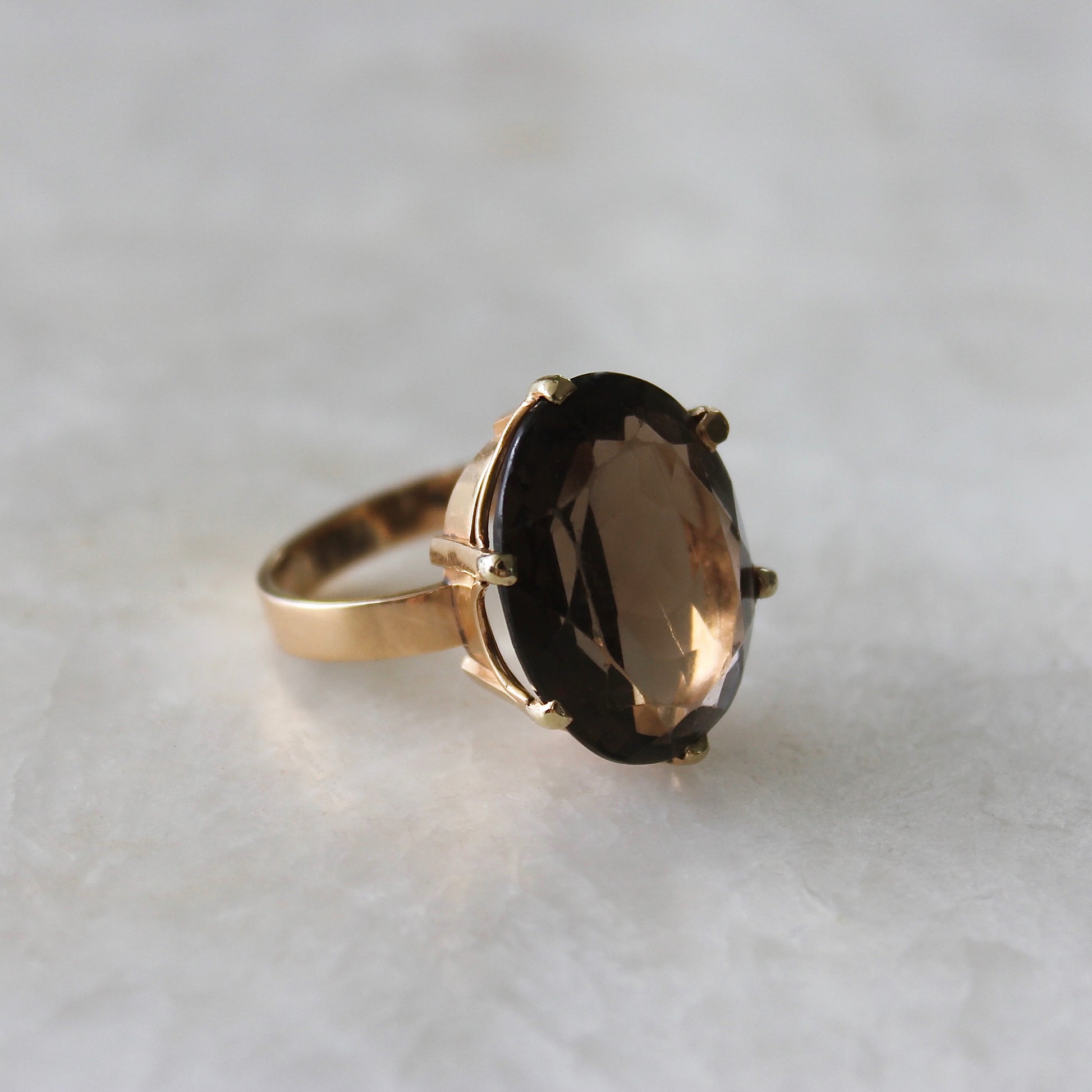 It is in excellent condition (outstanding for age). The lovely smoky quartz (21mm X 15mm) remains whole and sits firmly in the setting. The band retains its original shape well.