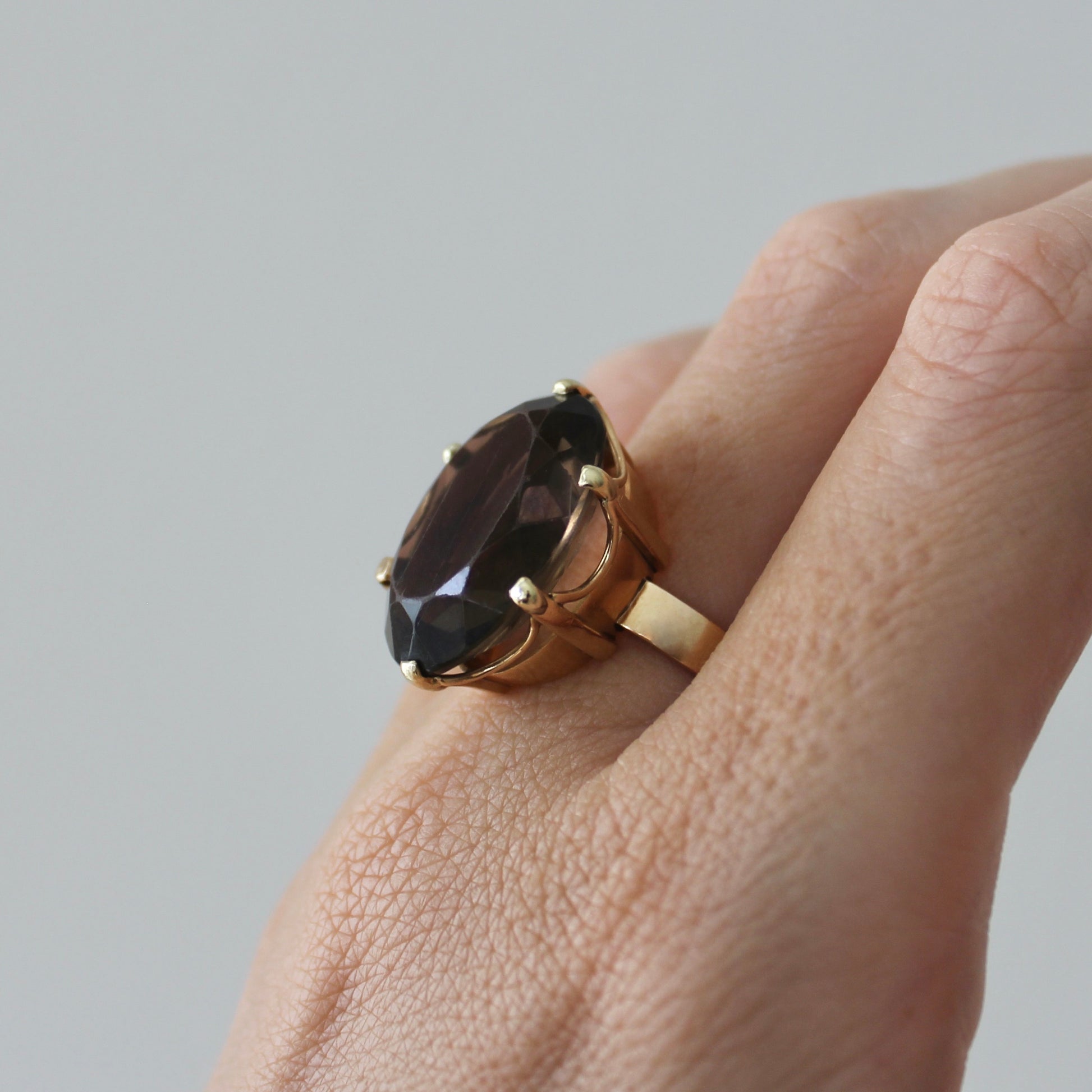 This beautiful mid-century ring features solid 14k gold that holds a stunning large facetted smoky quartz. The elegant design was designed and handcrafted by Finnish jeweller Erkki Juhani Peusa (registered 1957- 1987) in 1962.