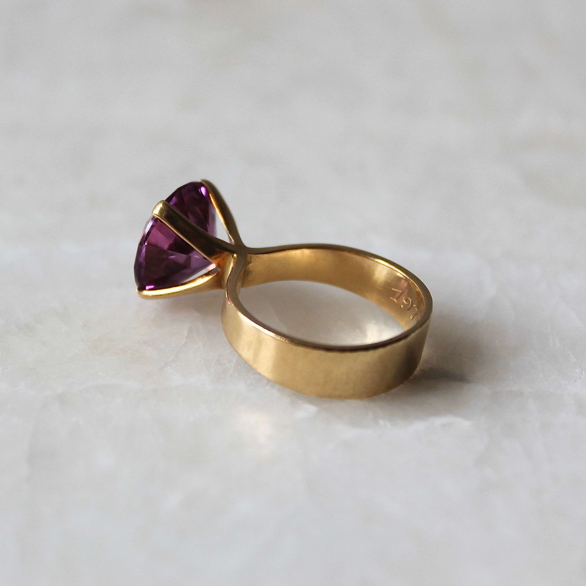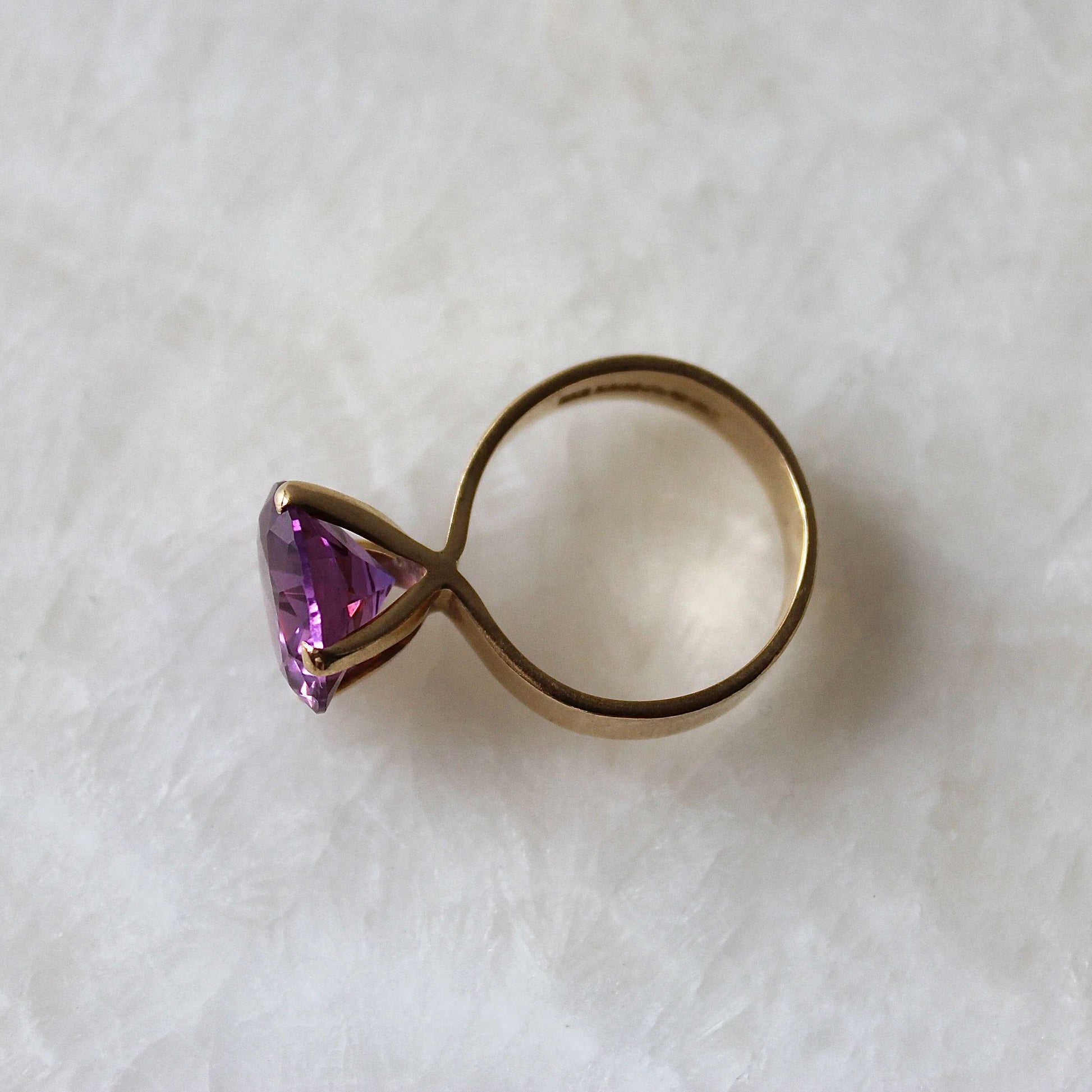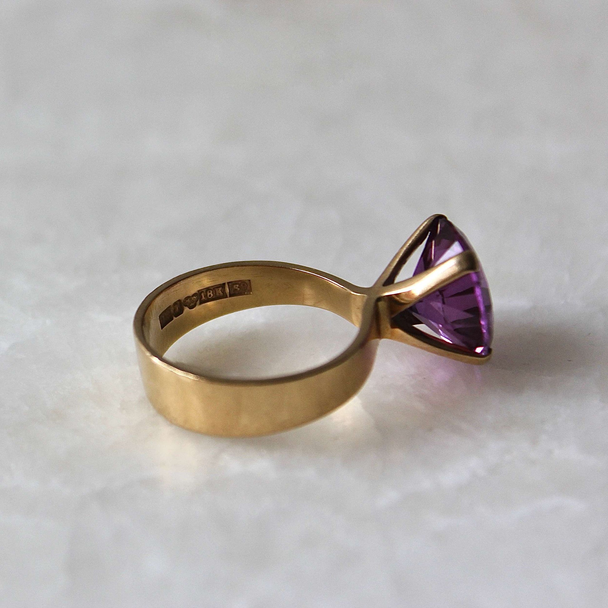 This beautiful Modernist ring dated 1968 features solid 18k gold that holds a gorgeous faceted purple stone (possibly amethyst or spinel) in a raised claw setting. It was designed and handcrafted by Stockholm based jeweller 'Ge-Kå Jewellery' G Kaplan, registered from 1945 until 1971.
