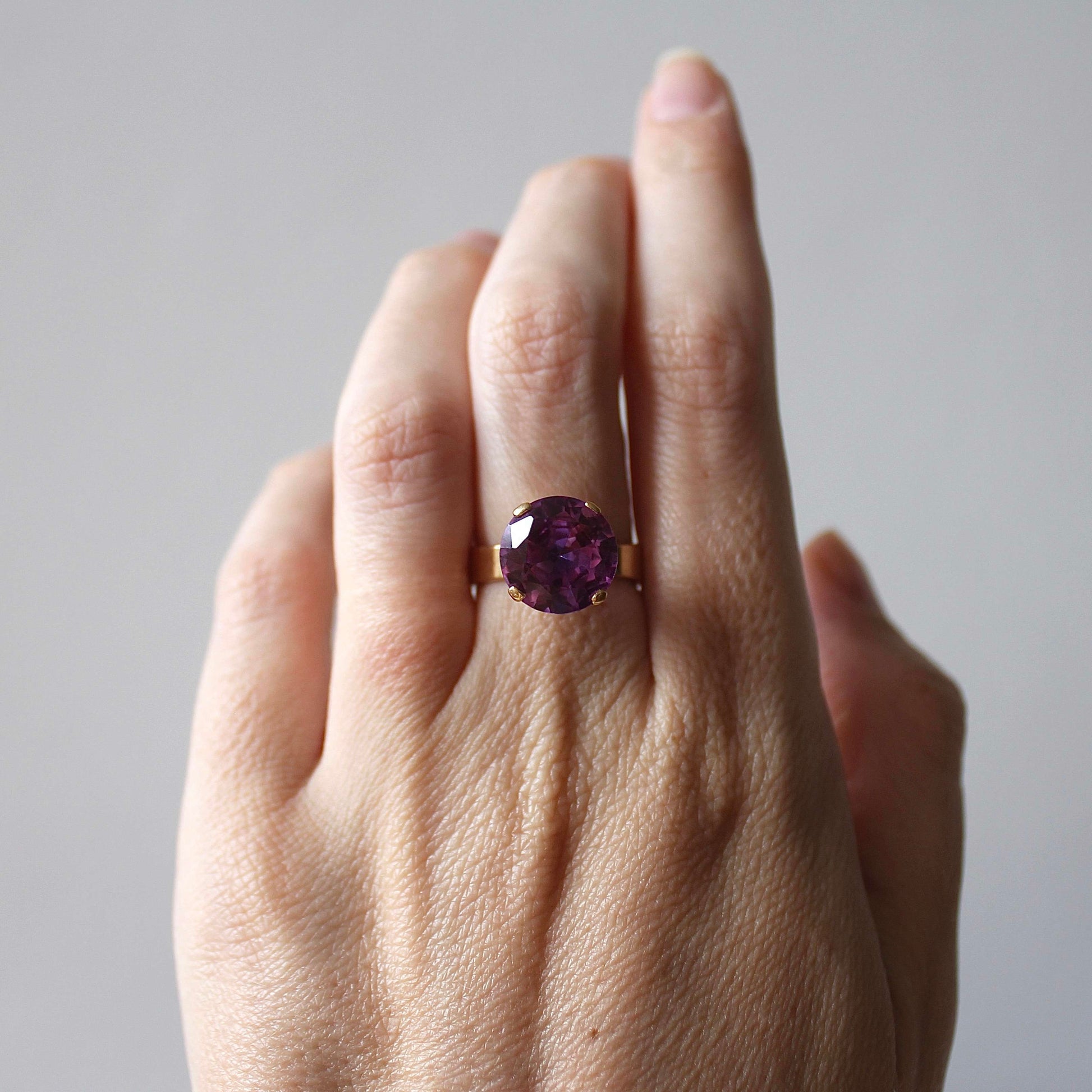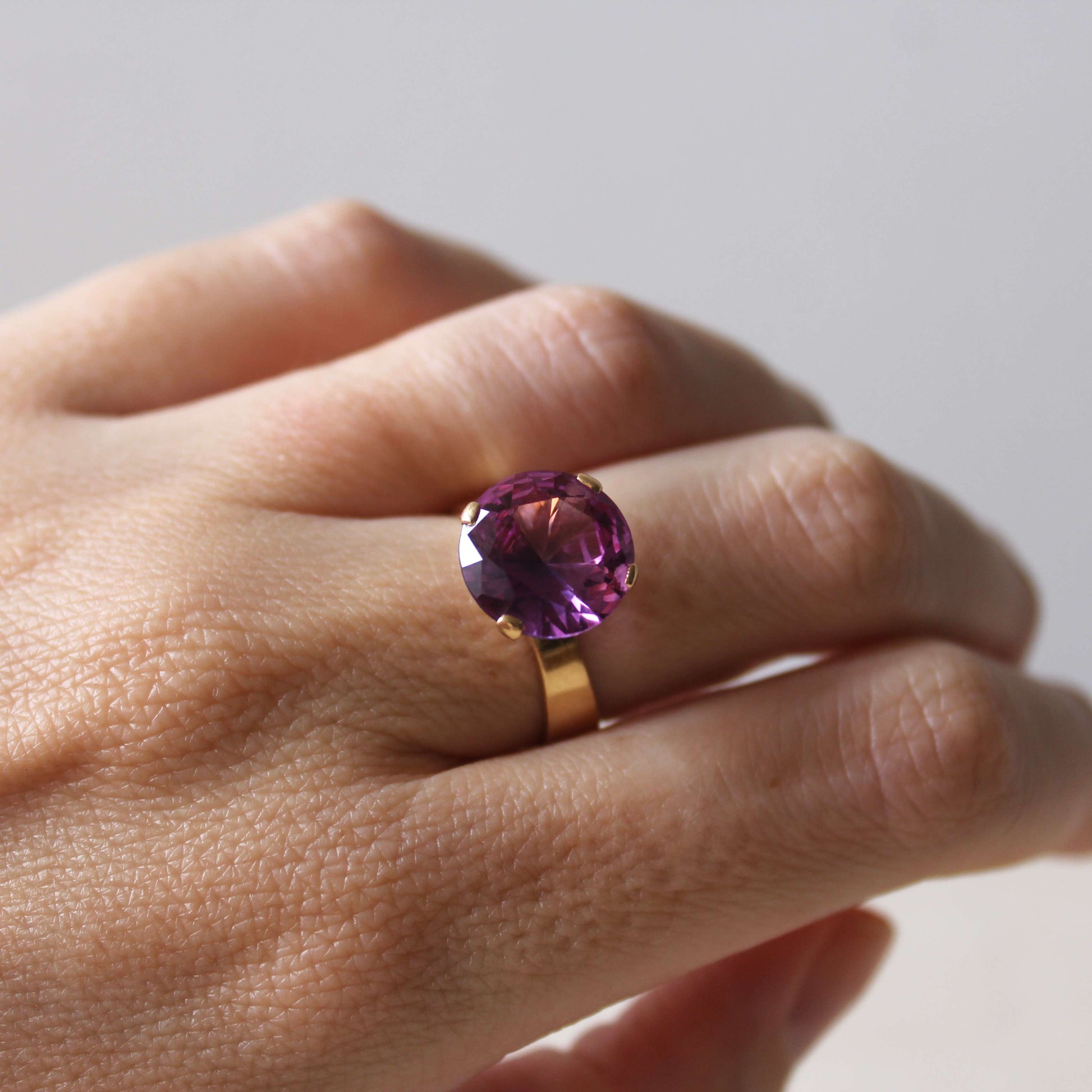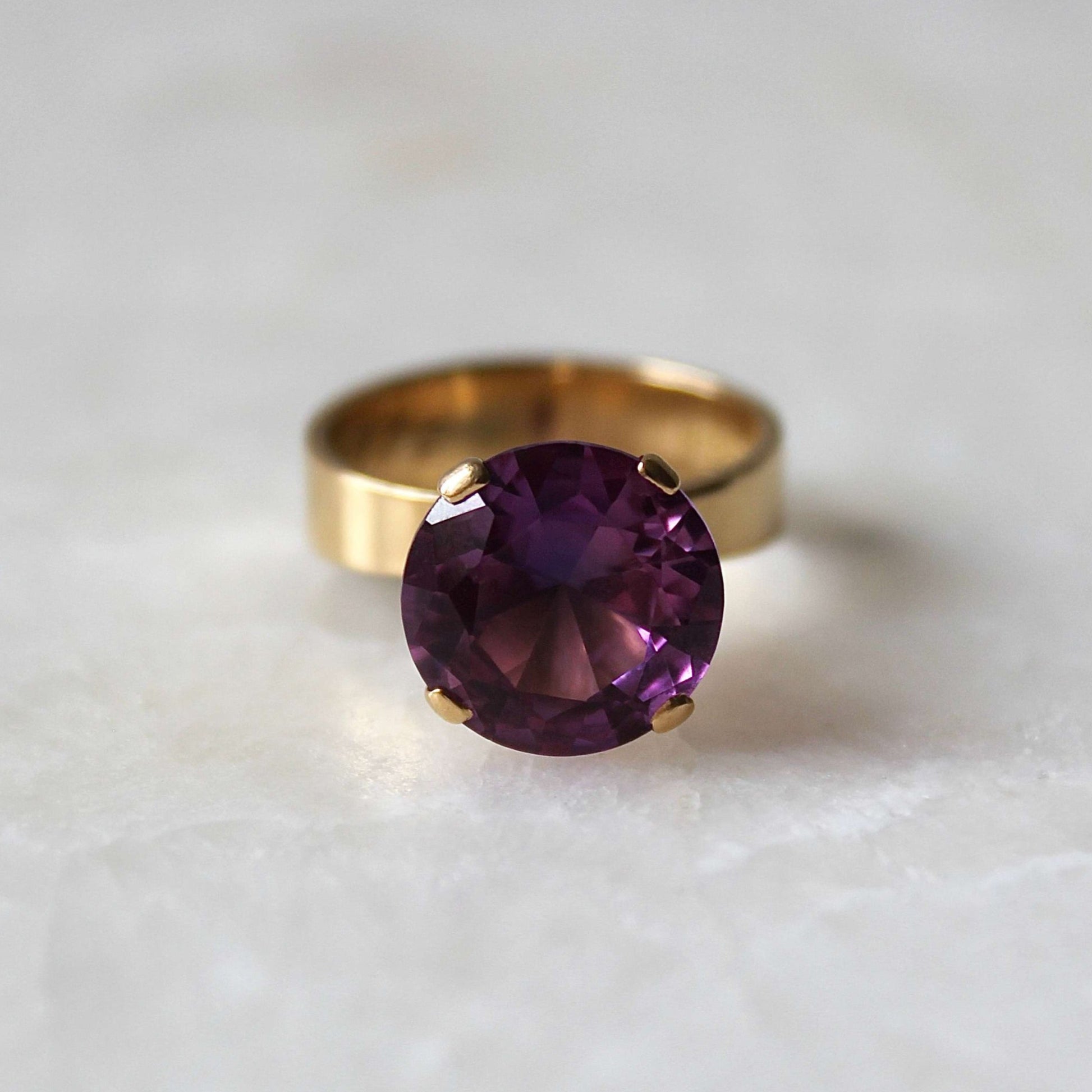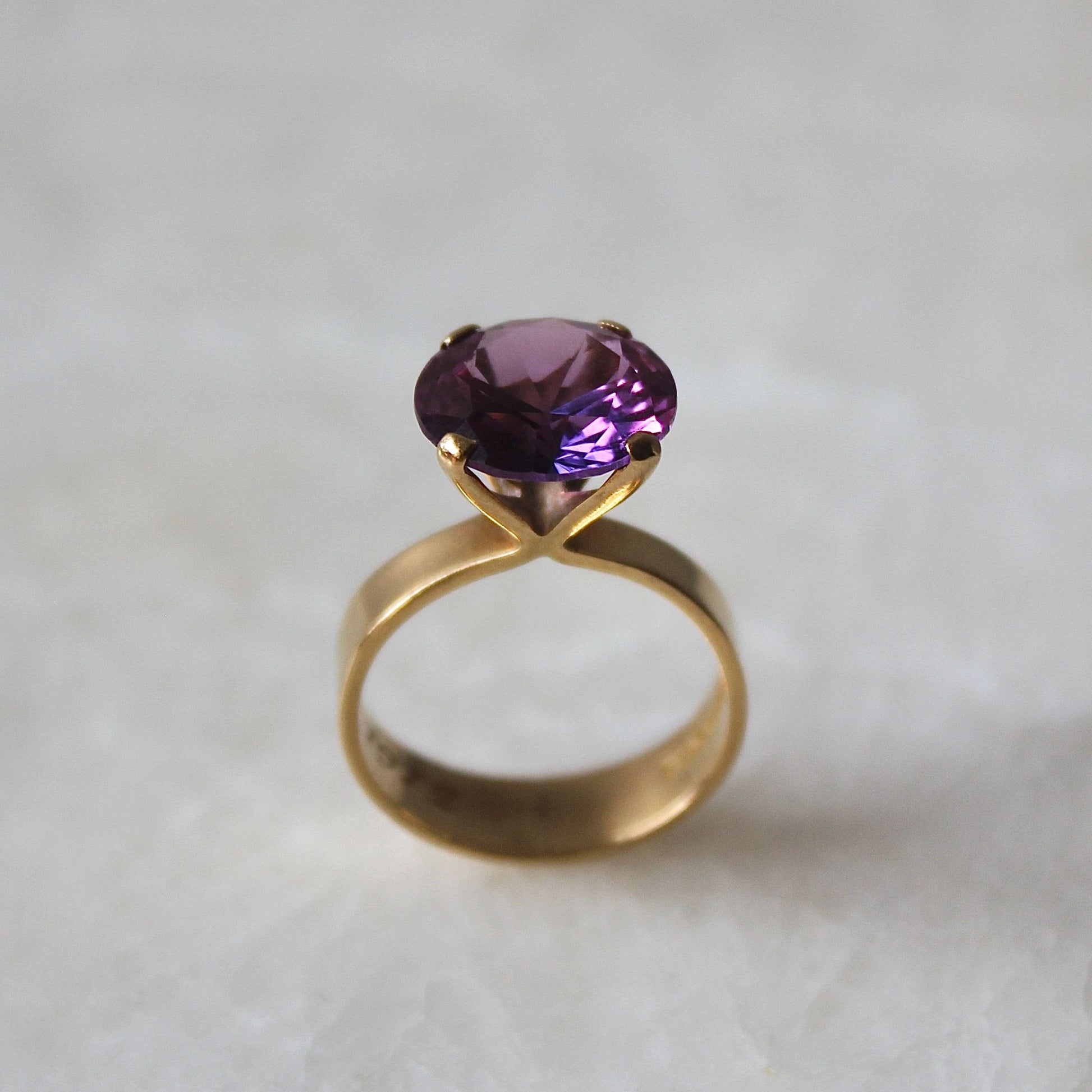 This beautiful Modernist ring dated 1968 features solid 18k gold that holds a gorgeous faceted purple stone (possibly amethyst or spinel) in a raised claw setting. It was designed and handcrafted by Stockholm based jeweller 'Ge-Kå Jewellery' G Kaplan, registered from 1945 until 1971.