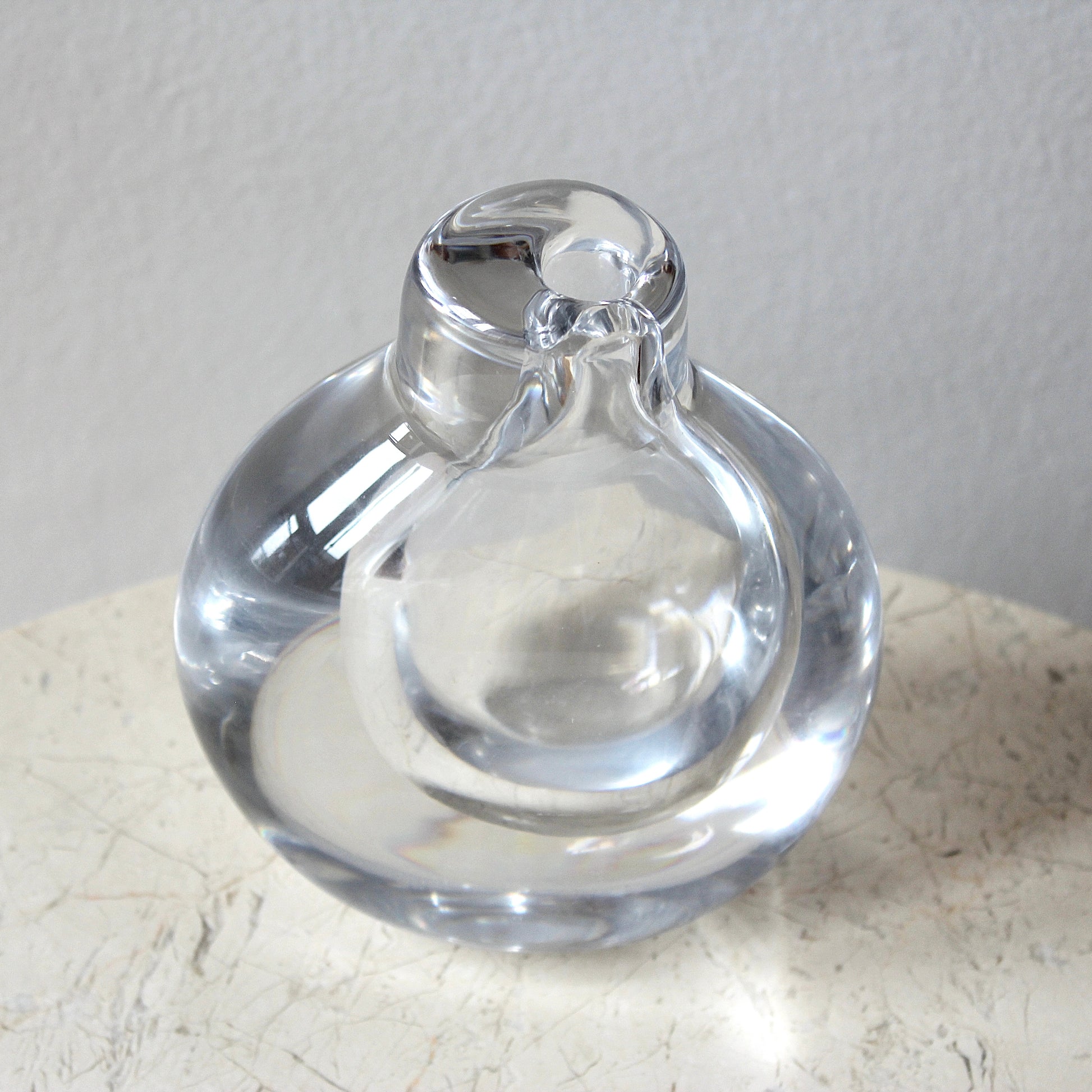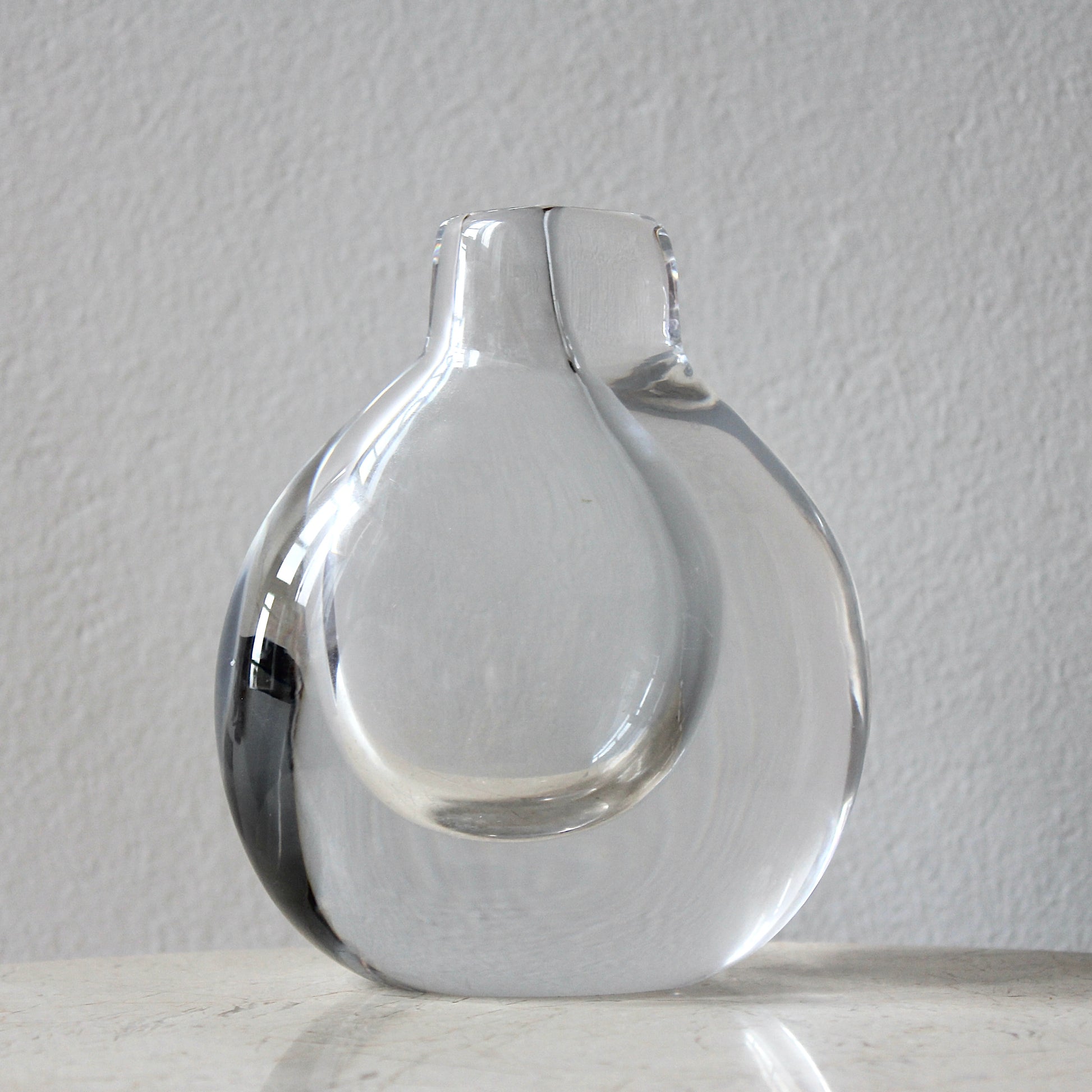 This vase was designed by Swedish artist Goran Warff (1933 - 2022), who started at Kosta (later Kosta Boda) in the 60s. The minimalist design features solid free blown clear crystal with a narrow opening and suspended circular cavity ideal for beautifully highlighting single stems.