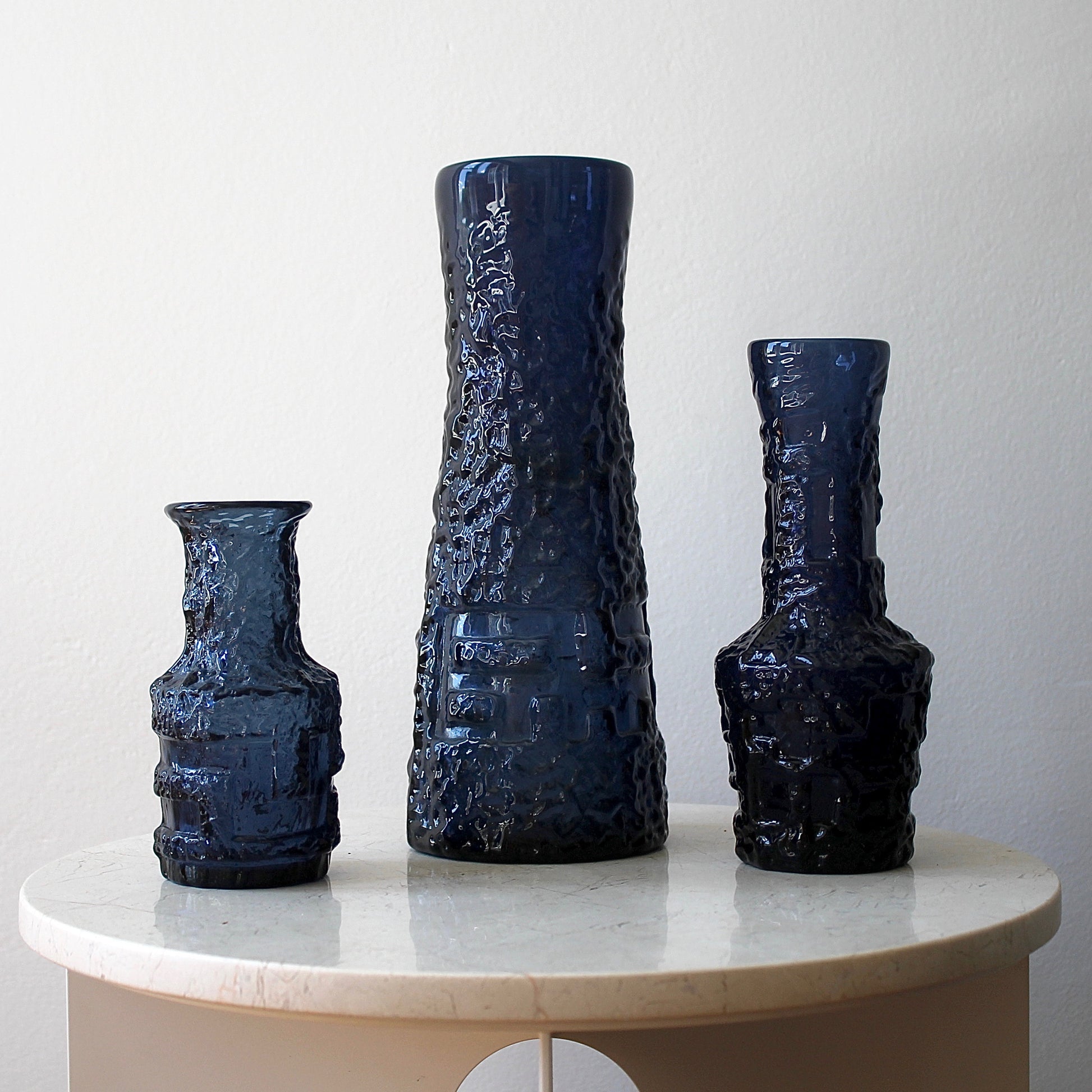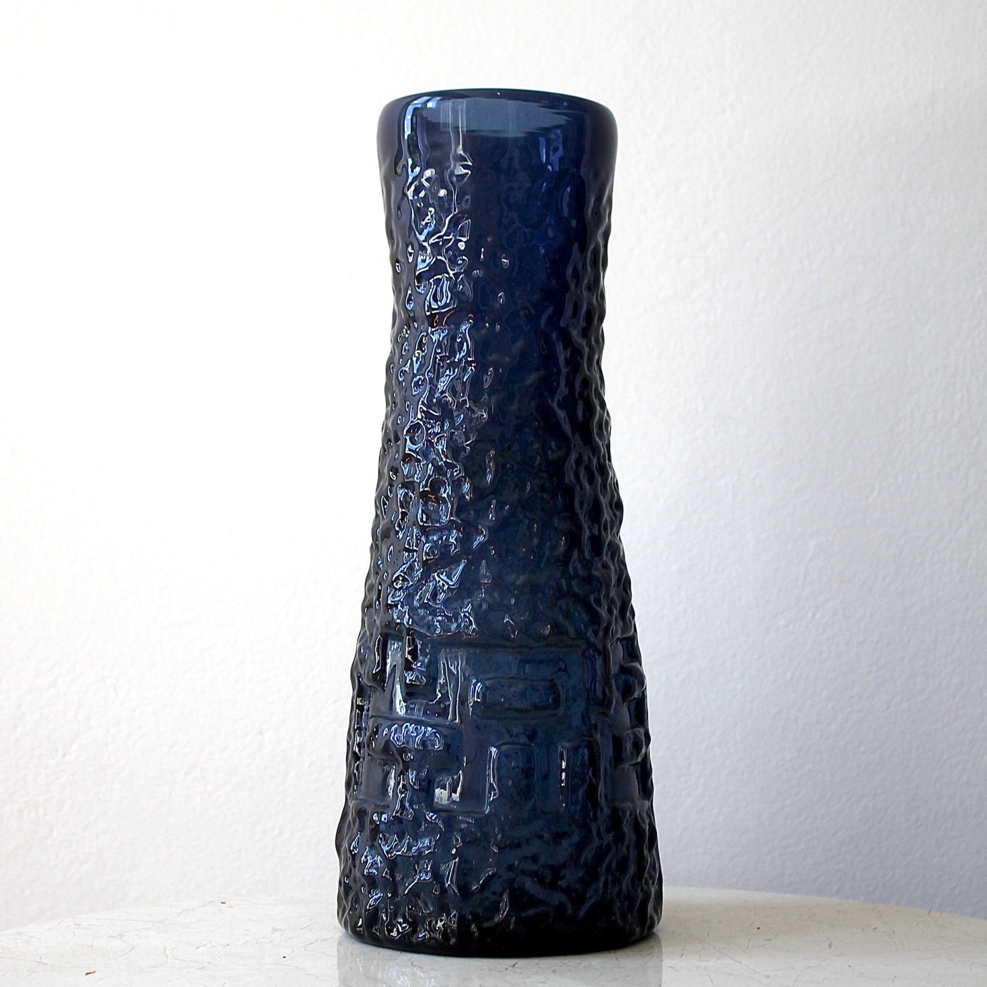 This vase was designed by Göte Augustsson (1917 - 2004) and features beautiful textured cobalt mould blown glass. When hot glass entered the moulds, it actually burnt them in the process. This meant that the surface of each vase varied and that production costs were relatively high as the moulds had to be replaced after they deteriorated. As you can see, the relief created by this technique reacts beautifully with the light.