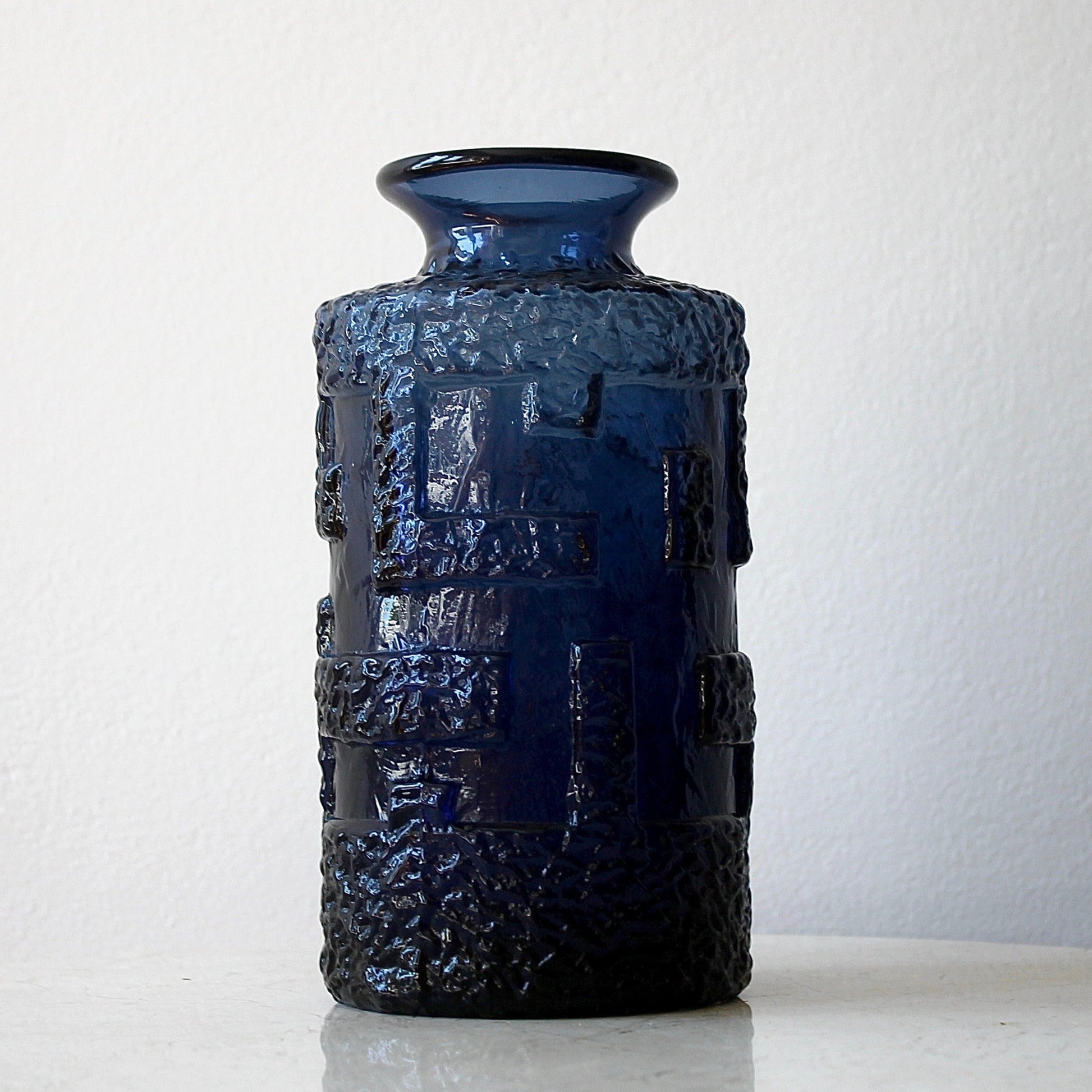 This vase was designed by Göte Augustsson (1917 - 2004) and features beautiful textured cobalt mould blown glass. When hot glass entered the moulds, it actually burnt them in the process. This meant that the surface of each vase varied and that production costs were relatively high as the moulds had to be replaced after they deteriorated. As you can see, the relief created by this technique reacts beautifully with the light.