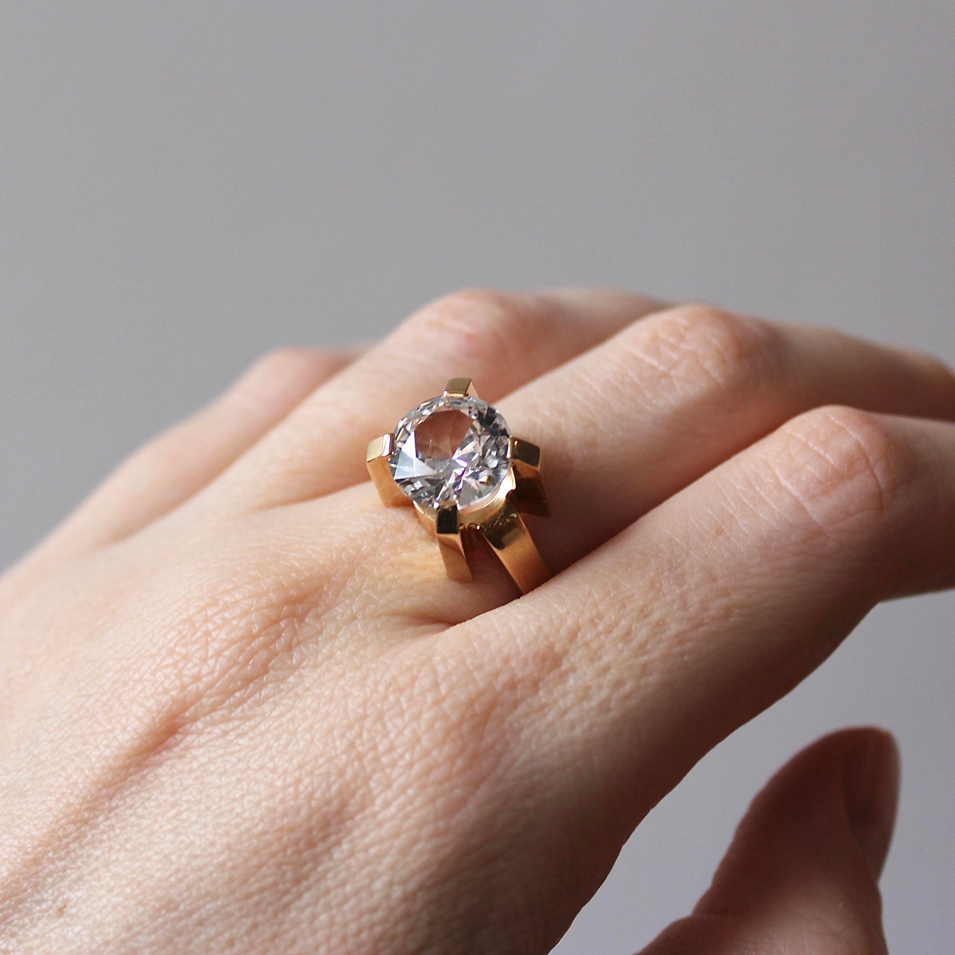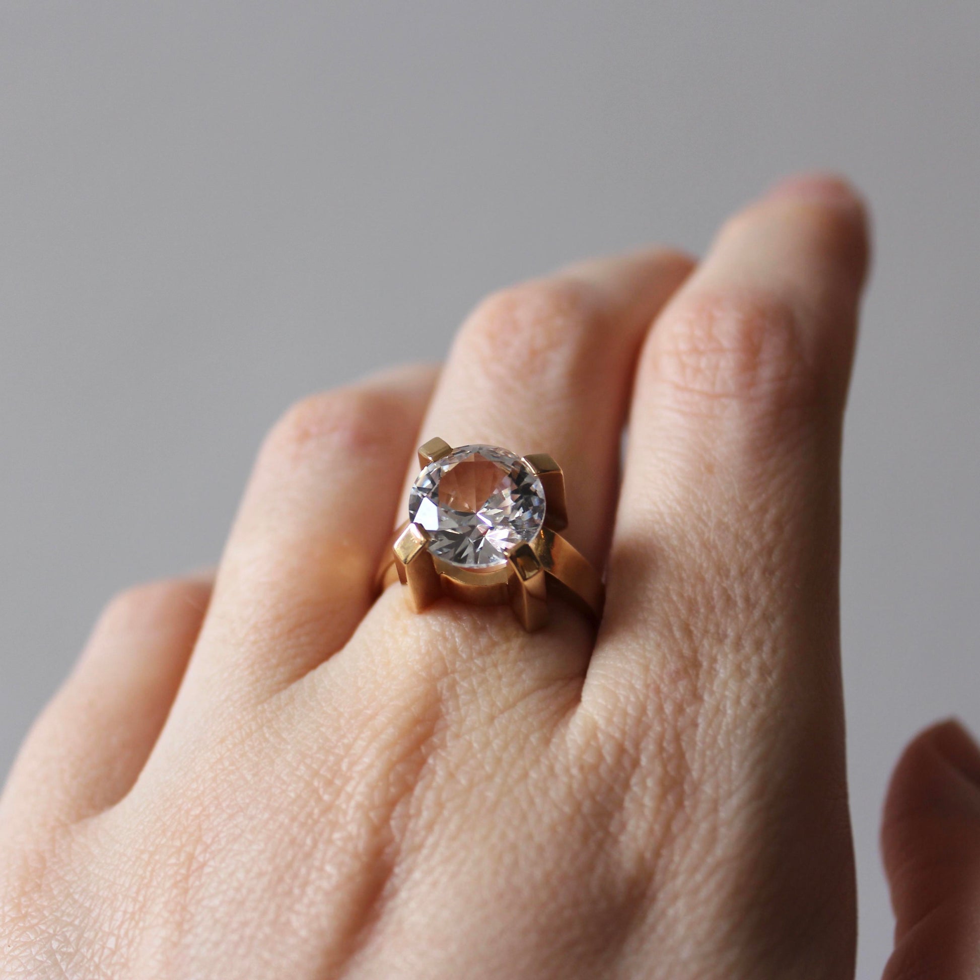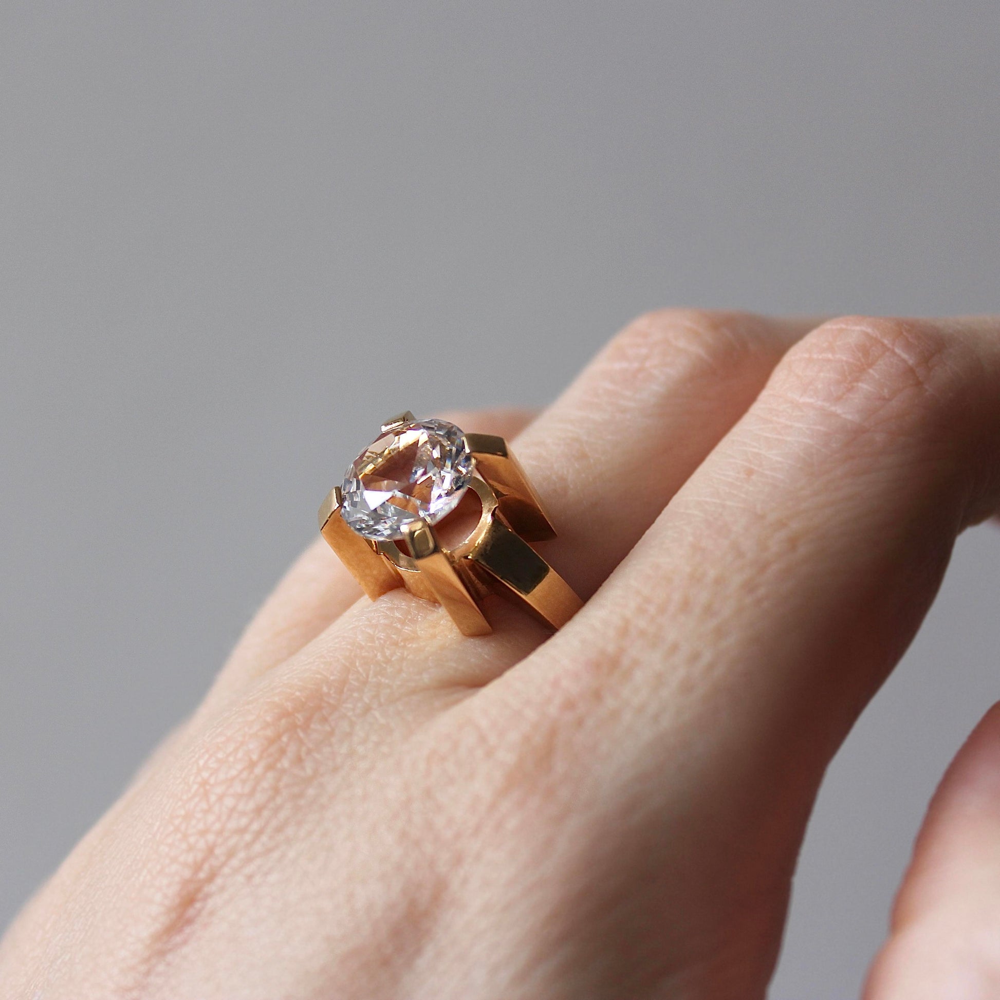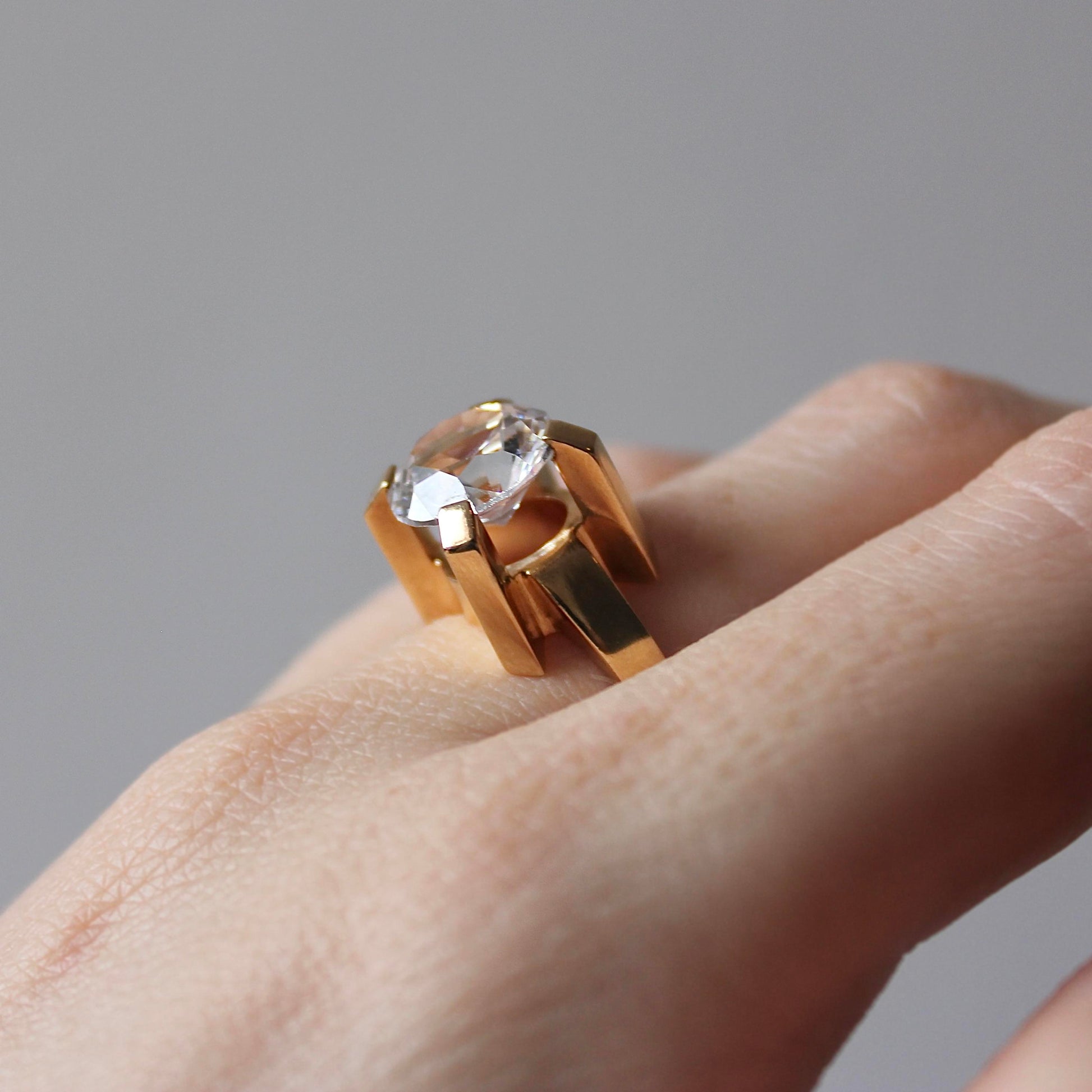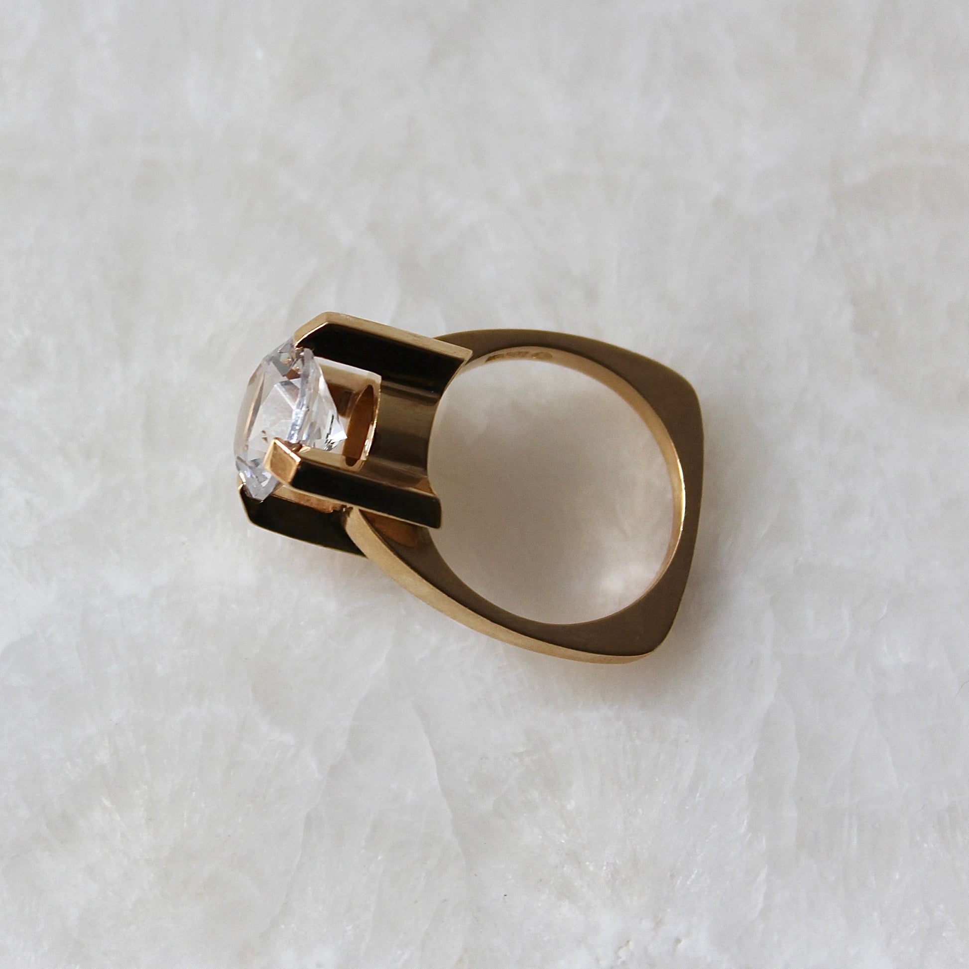 This incredible sculptural Modernist ring features solid 18k gold that beautifully highlights a large faceted rock crystal. The eye-catching piece was made by mid-century jeweller Guldvaruhuset, which was registered in Stockholm between 1923 and 1965.