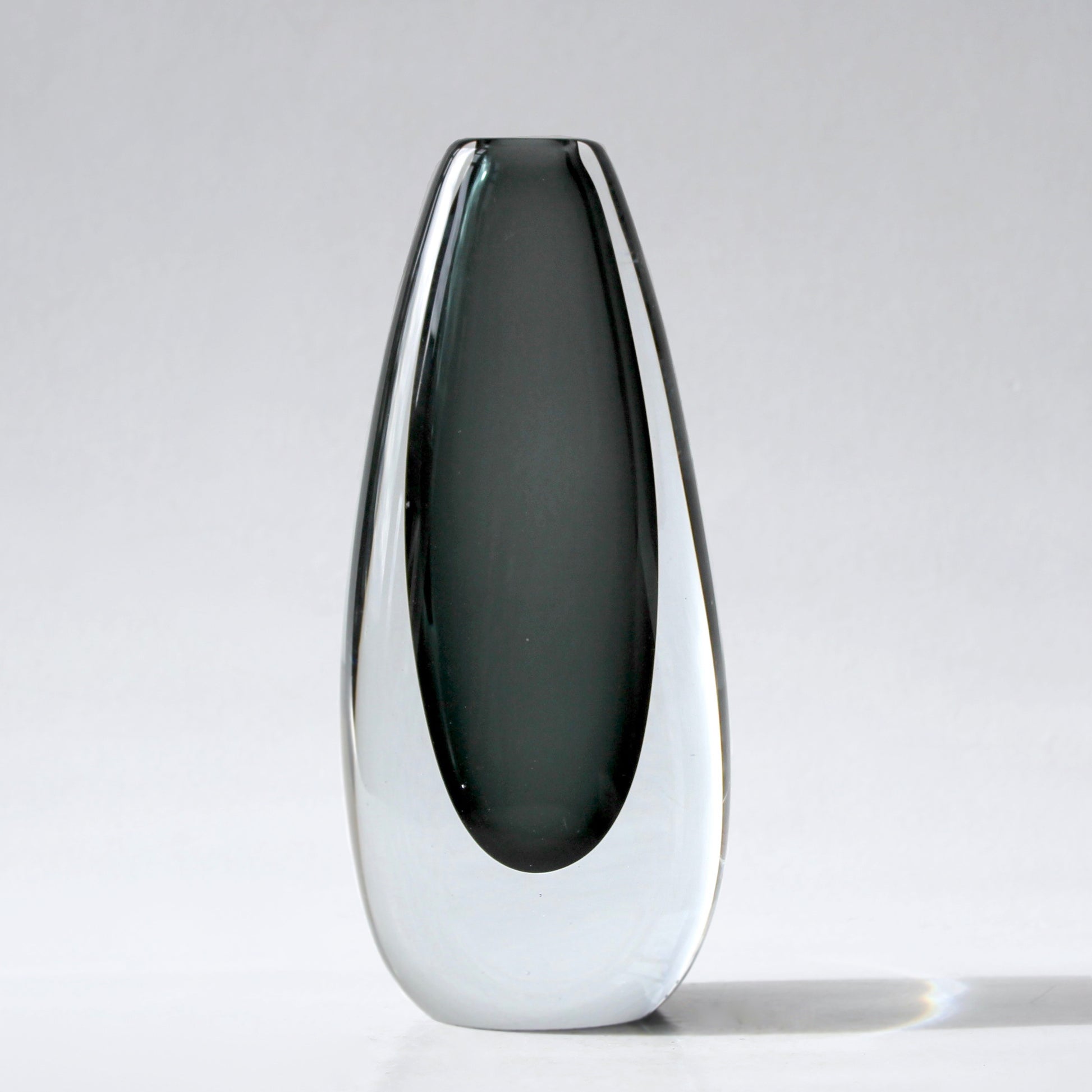 A sommerso vase featuring handblown solid clear Stromberg crystal with a beautiful translucent charcoal underlay. Known as the model B894, it looks fantastic with other models by Strömbergshyttan.