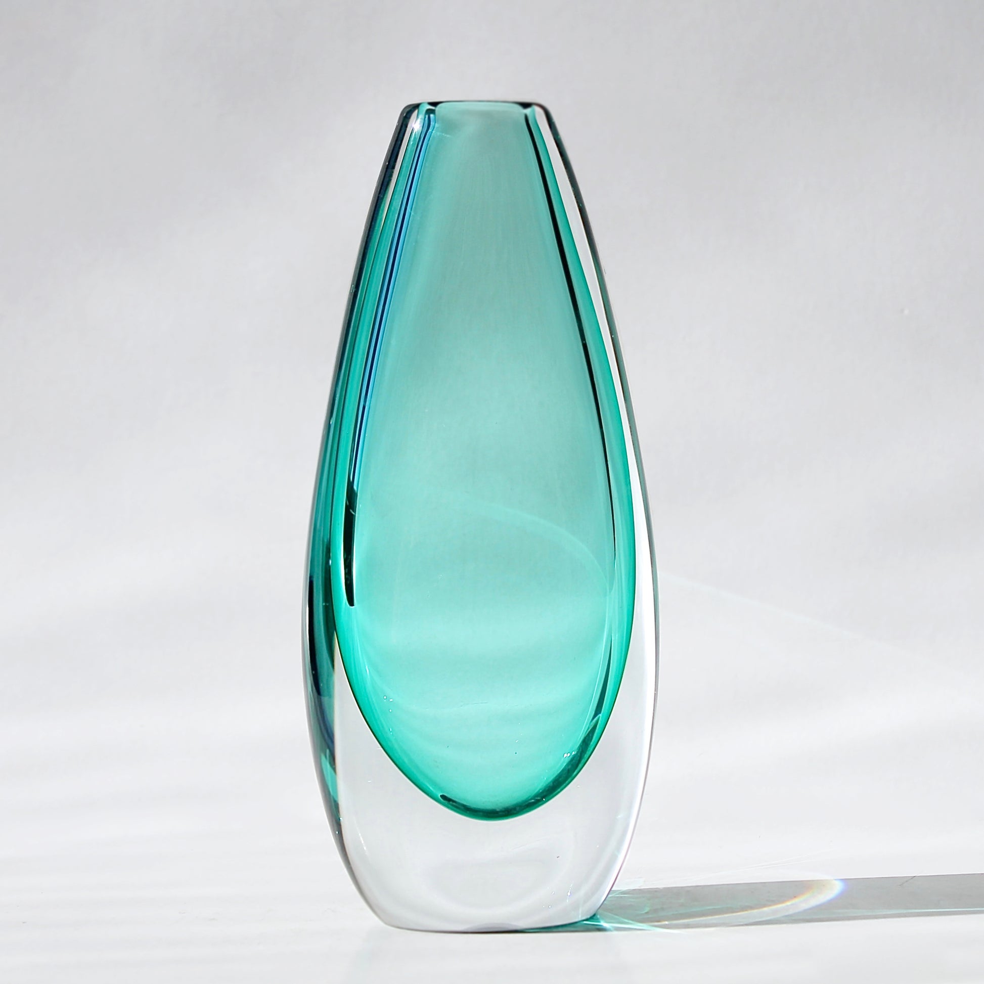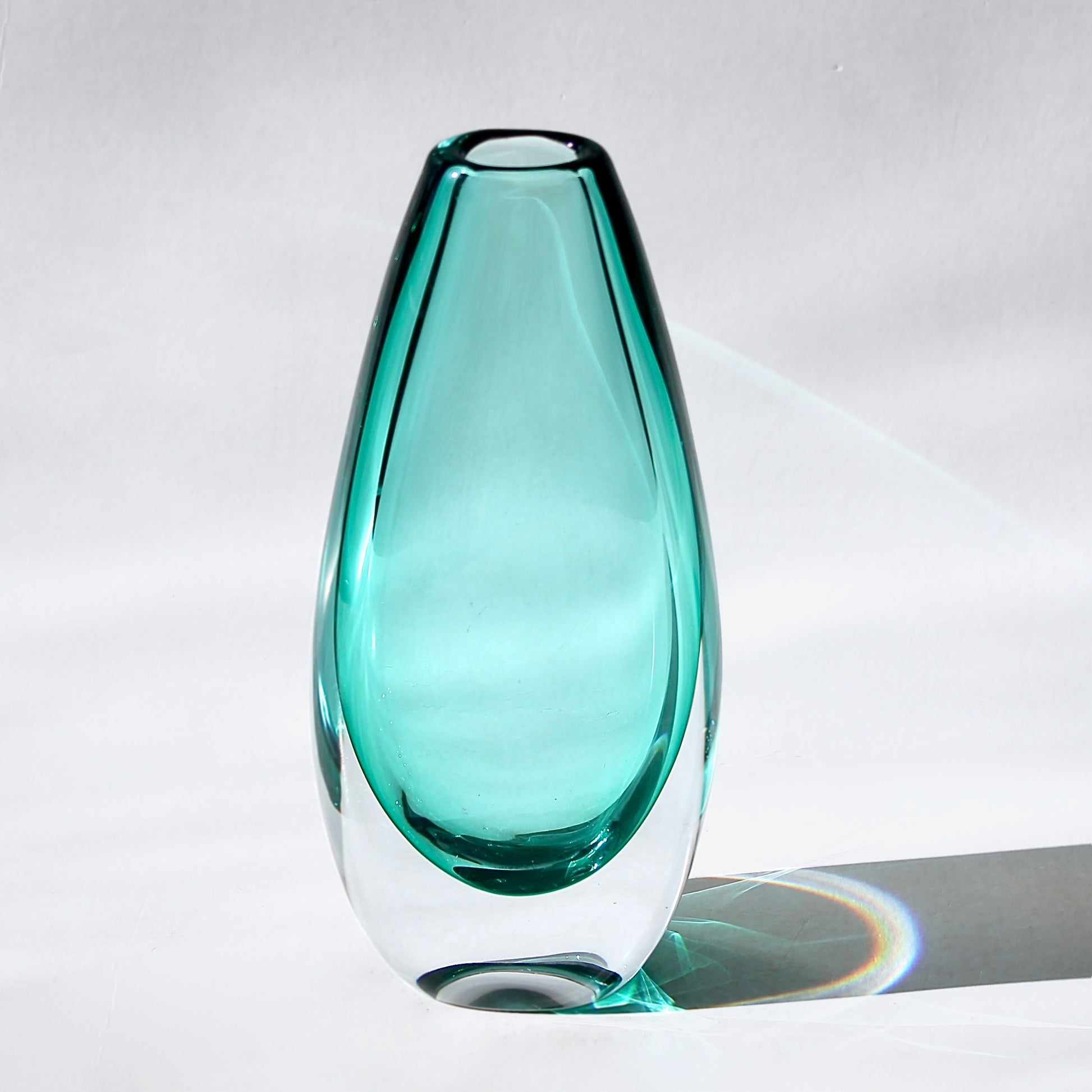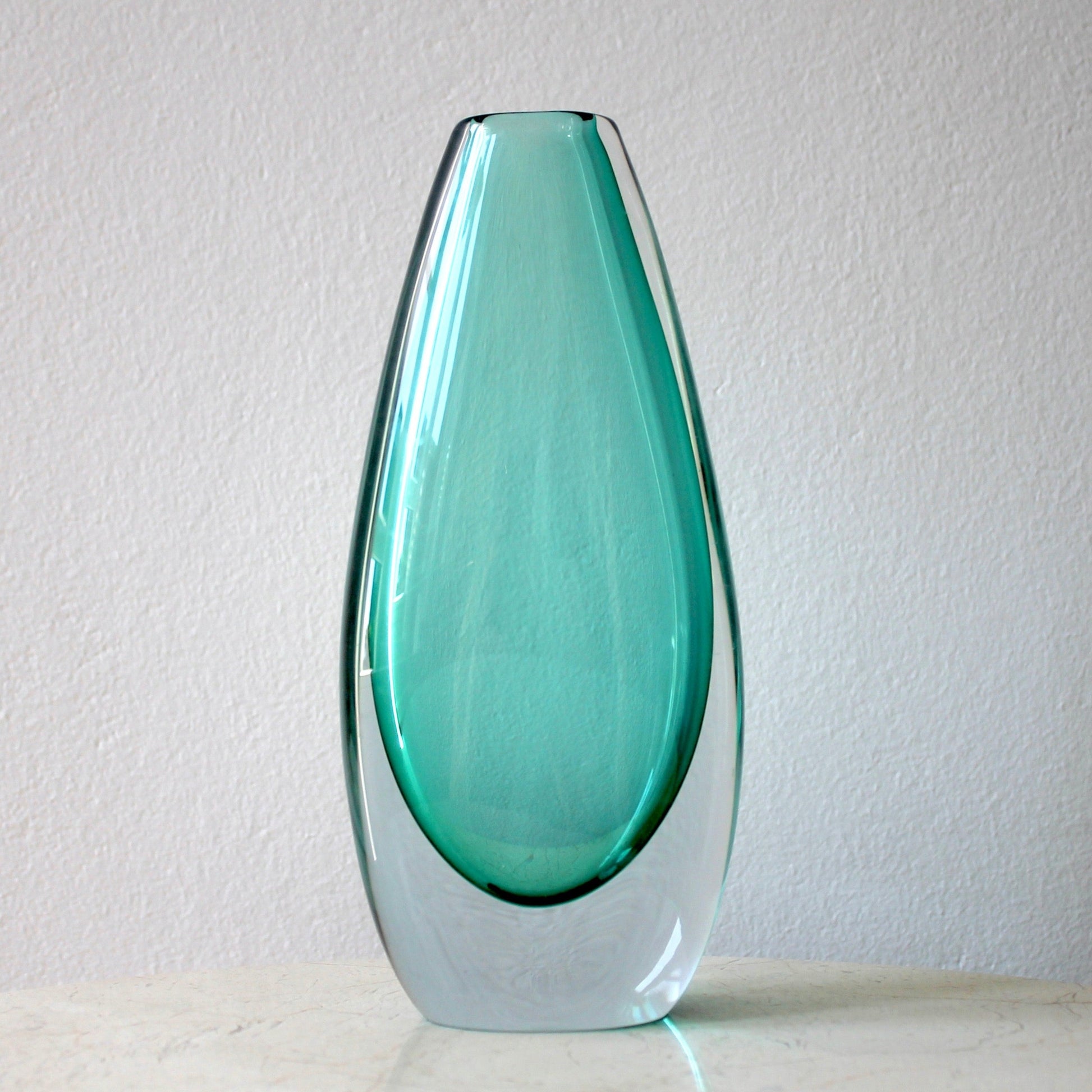 Featuring solid clear handblown crystal that encases a beautiful translucent sea green underlay. This model was designed by Gunnar Nylund in the late 50s and is known as the B894. The overall condition of this vase is excellent with no notches, cracks, repairs or discolouration.