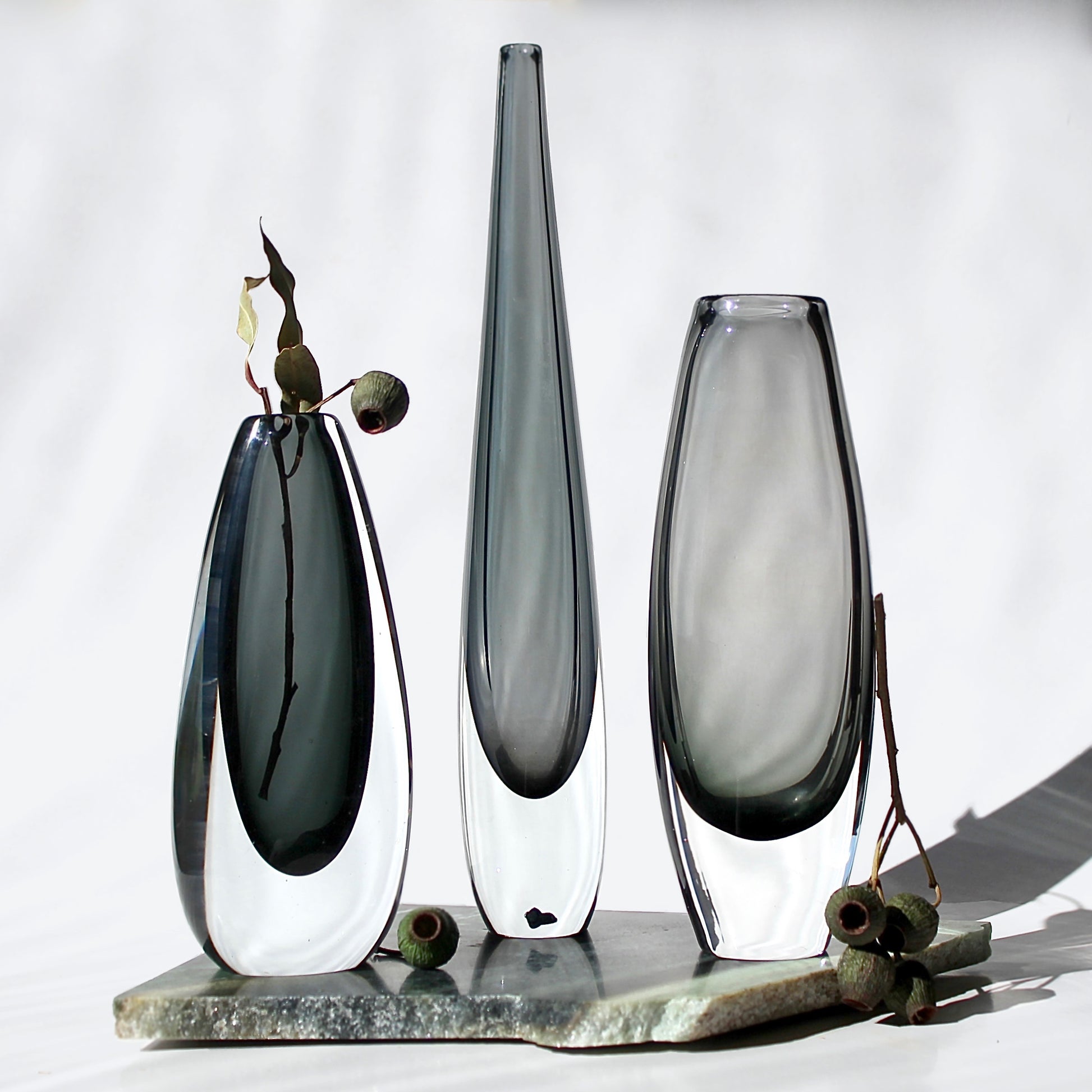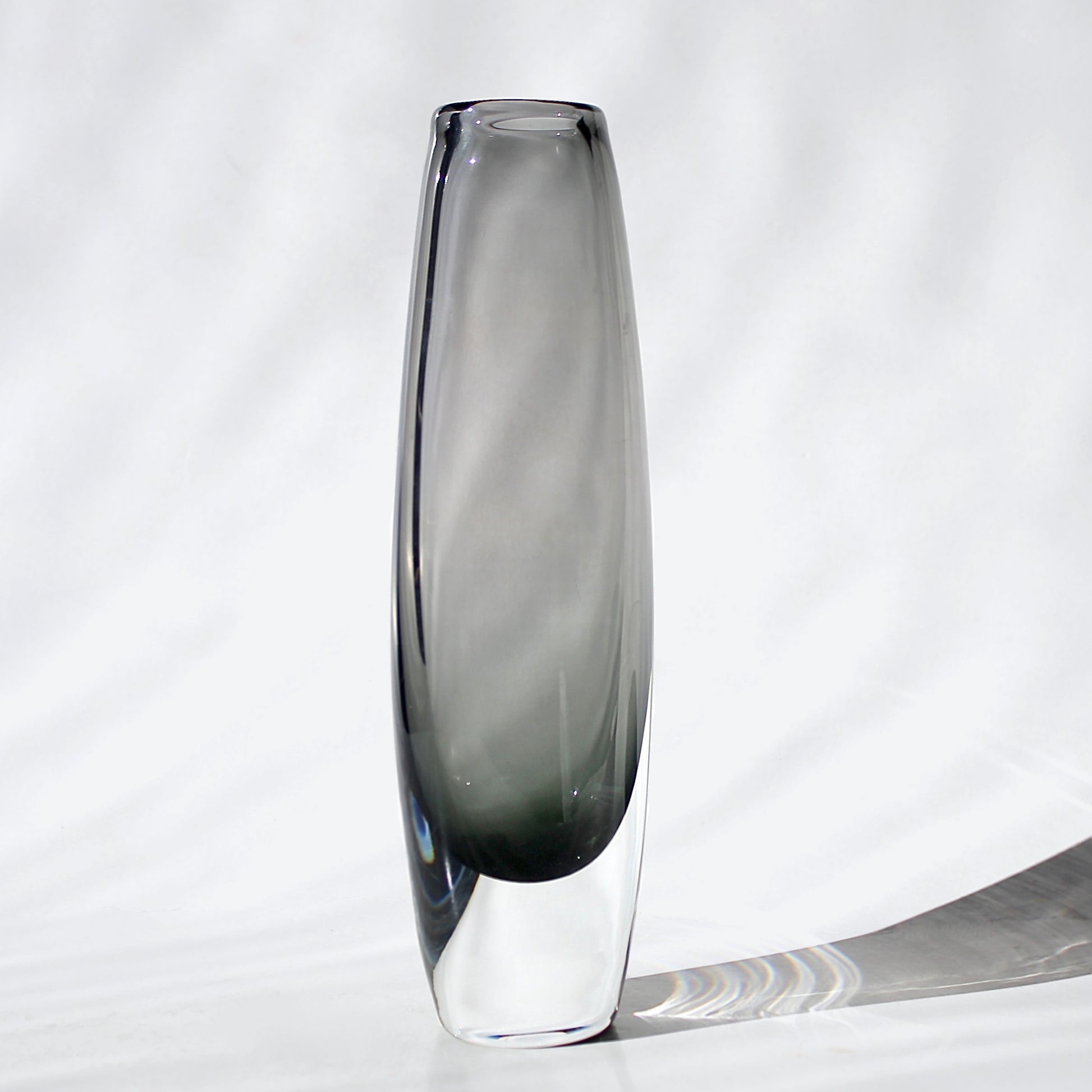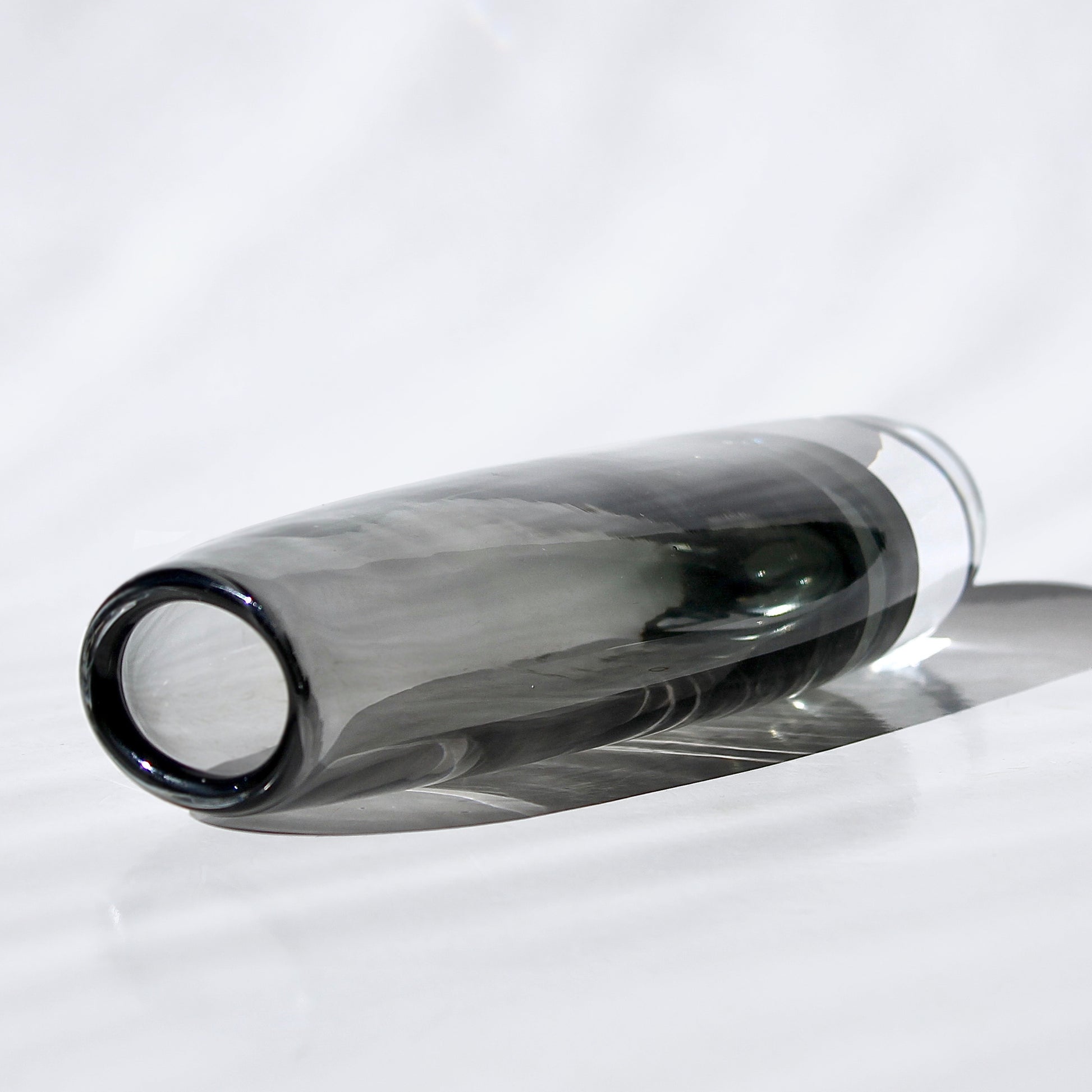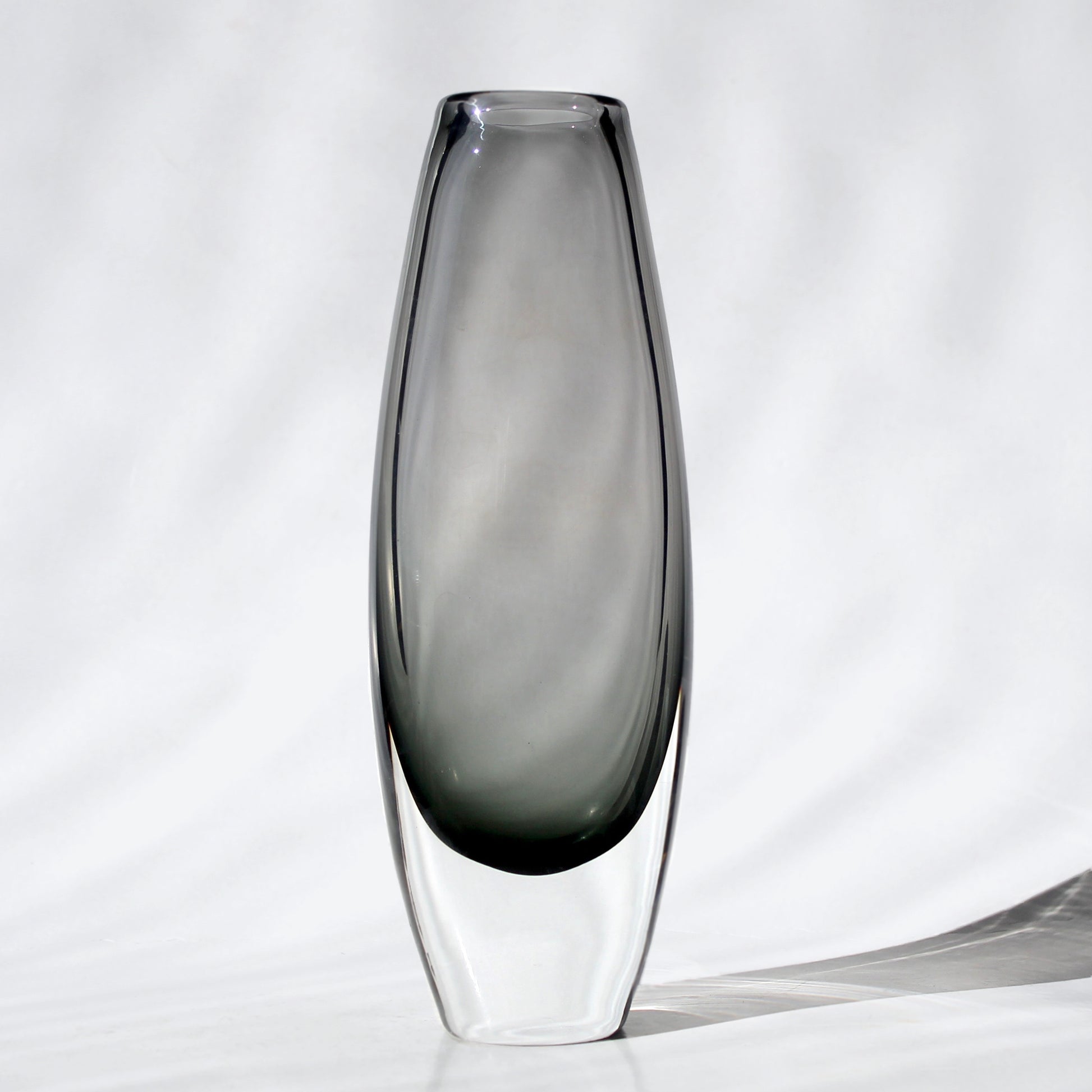 A sommerso vase featuring handblown solid clear Stromberg crystal with a beautiful translucent charcoal underlay. This heavy ovoid-shaped vase looks fantastic with other models by Strömbergshyttan.