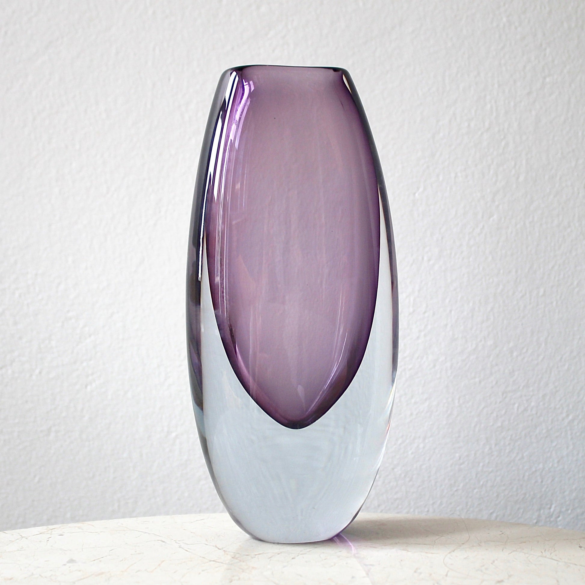 Featuring solid clear handblown crystal that encases a beautiful translucent lilac underlay. This model was designed by Gunnar Nylund in the late 50s and is known as the B894.