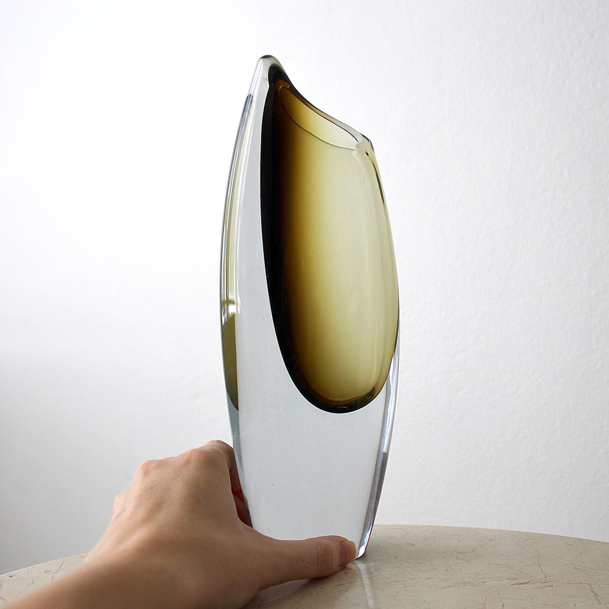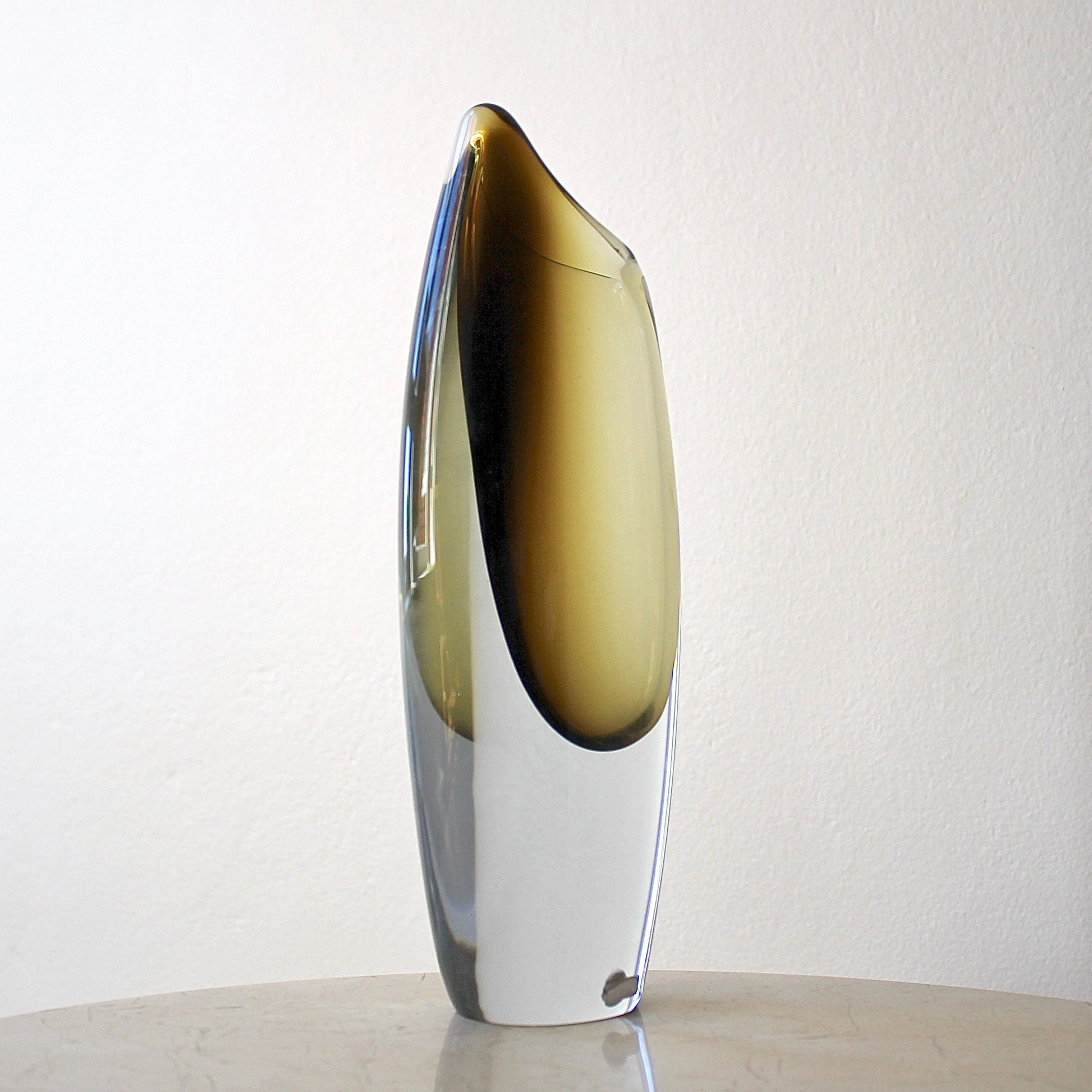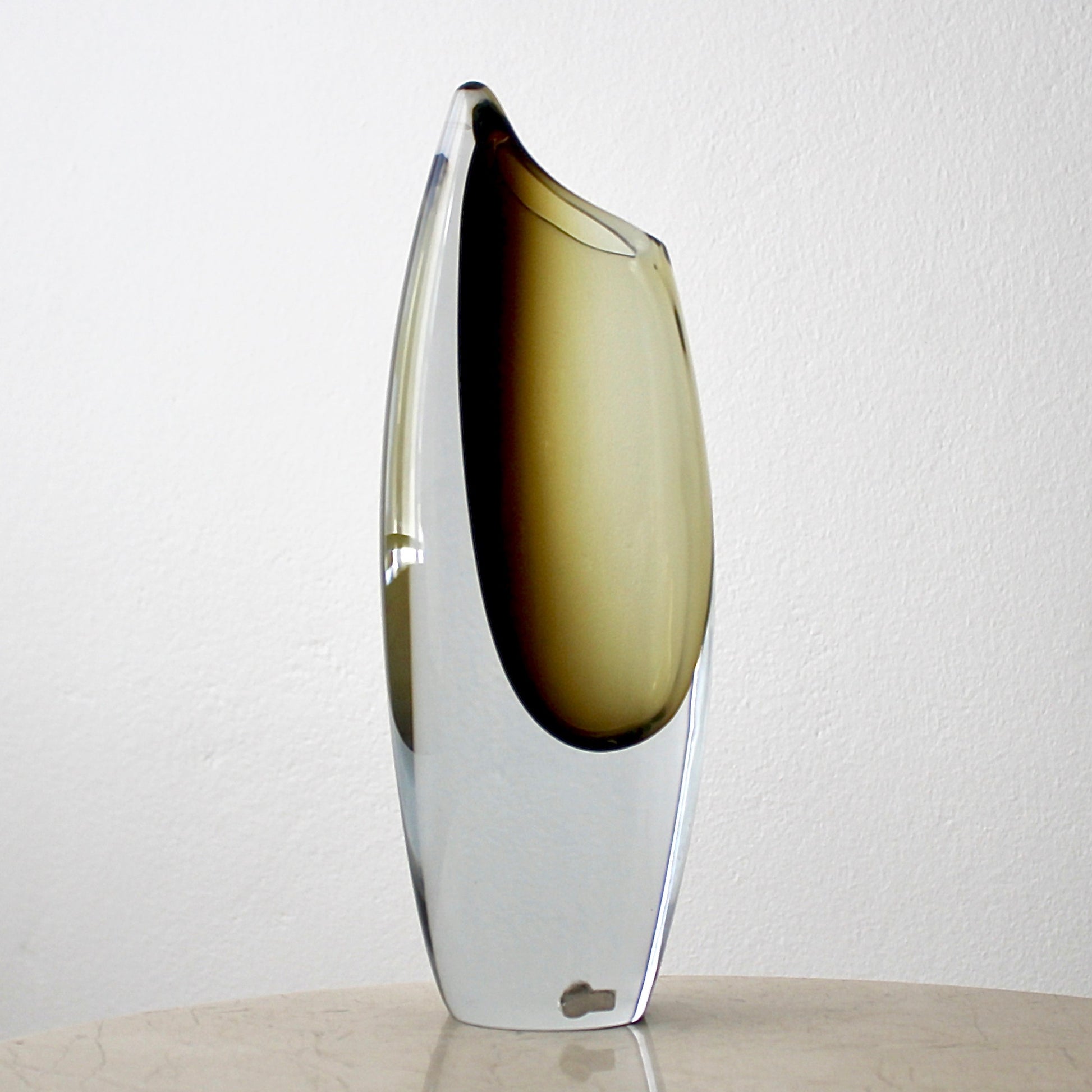 This beautiful mid-century vase features solid Strömberg crystal with an ombre underlay of gold and bronze tones. This model, B845, was designed by Gunnar Nylund for Strömbergshyttan glassworks in the late 1950s.