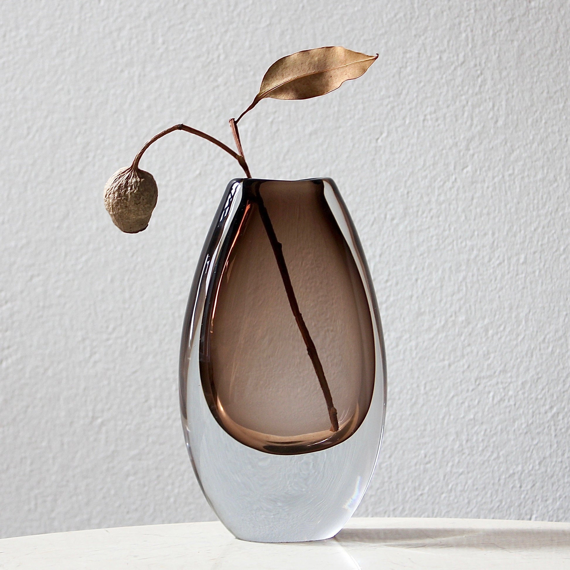 Featuring solid clear hand blown crystal that encases a transparent cinnamon underlay. This model was designed by Gunnar Nylund in the late 50s and is known as the B894.