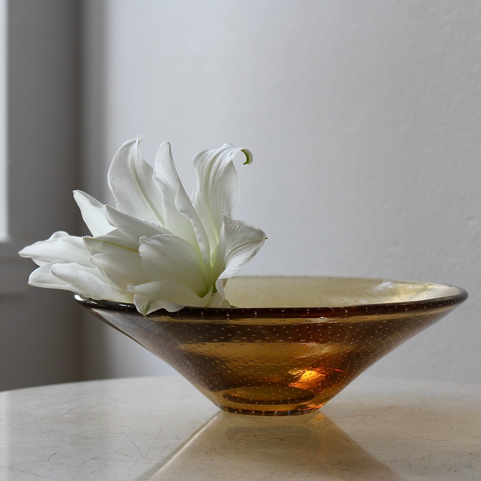 This incredibly beautiful bowl features blown solid amber crystal with controlled internal bullicante. The incredible effect is created through a spike mould blown glass technique, which was expertly mastered by Nuutajarvi glass artists.