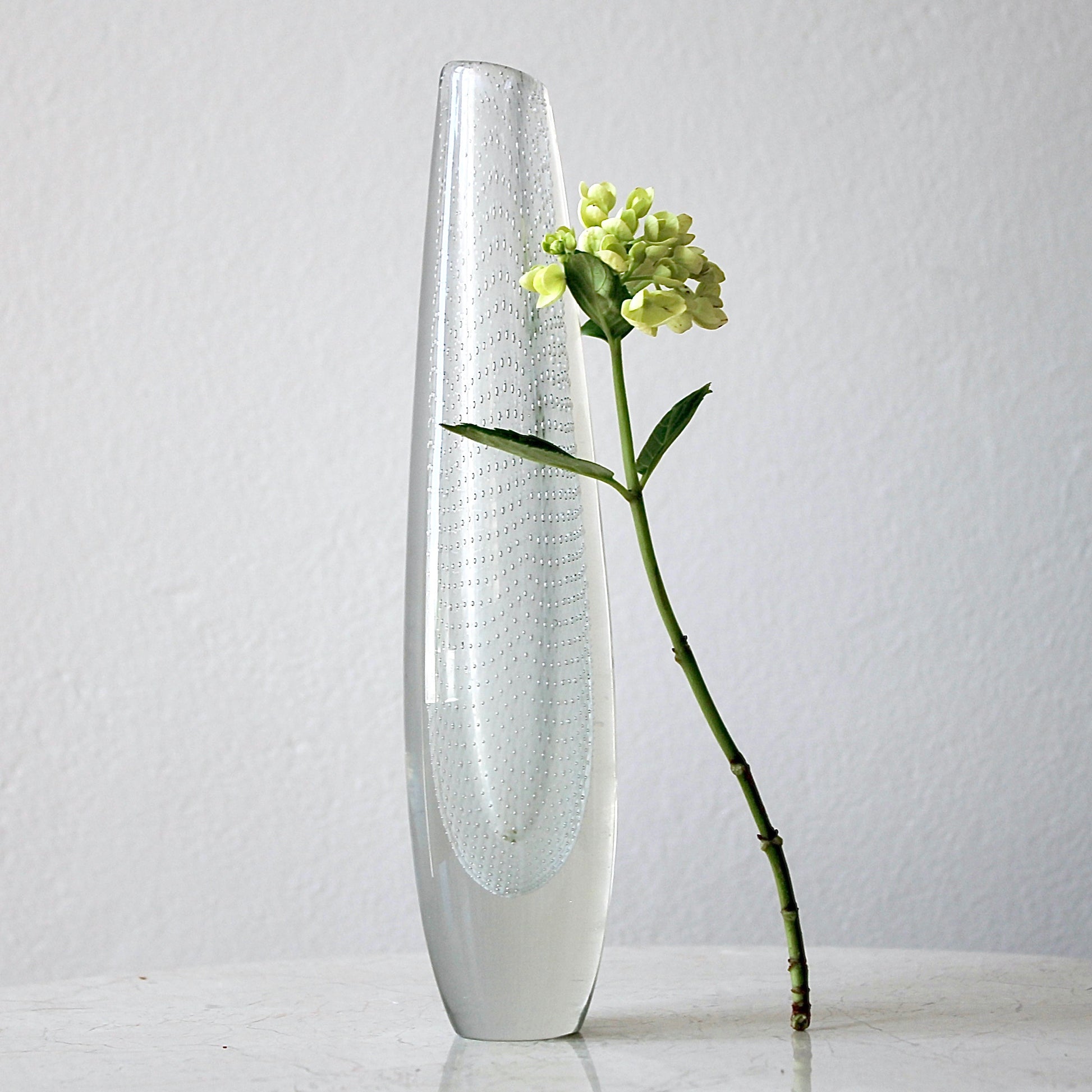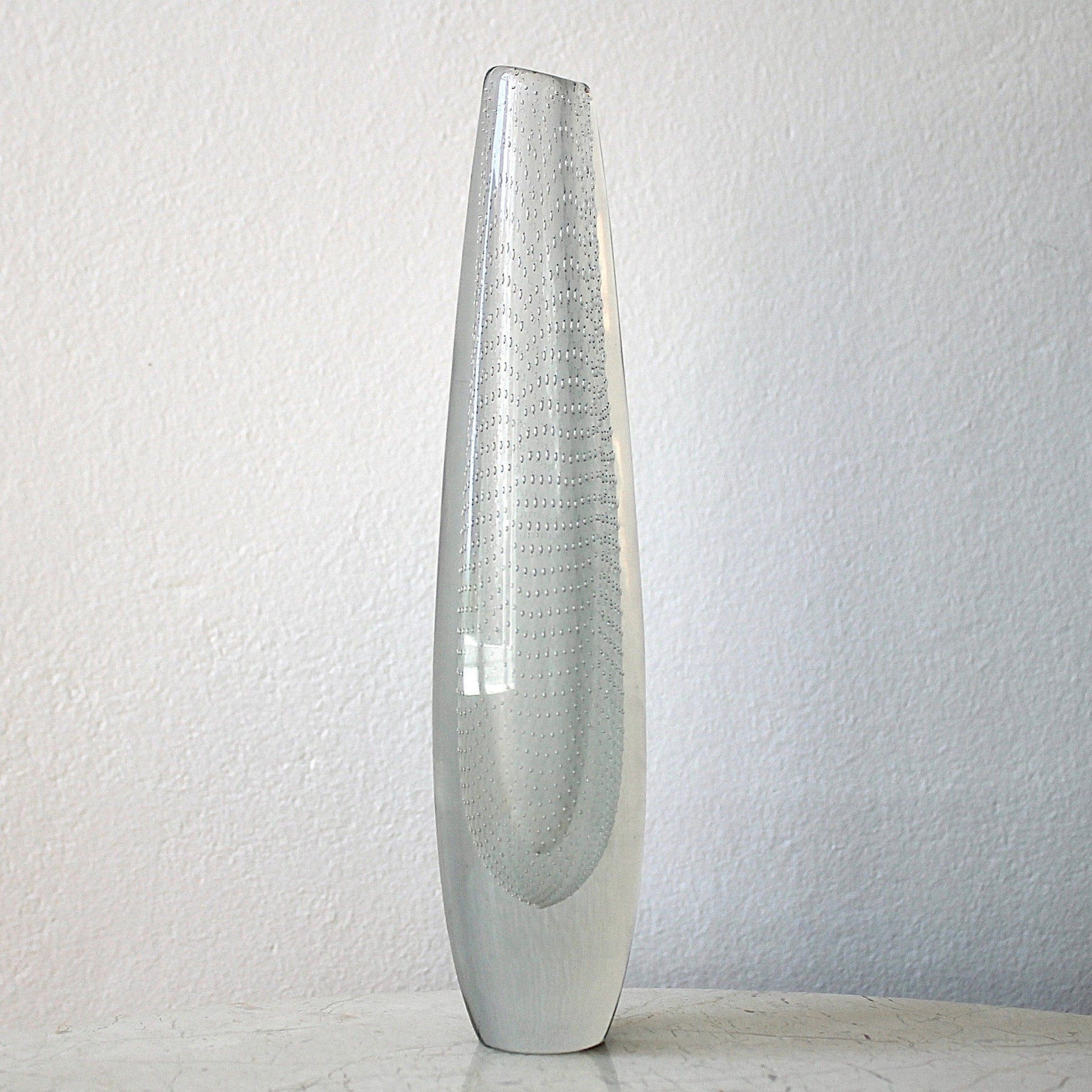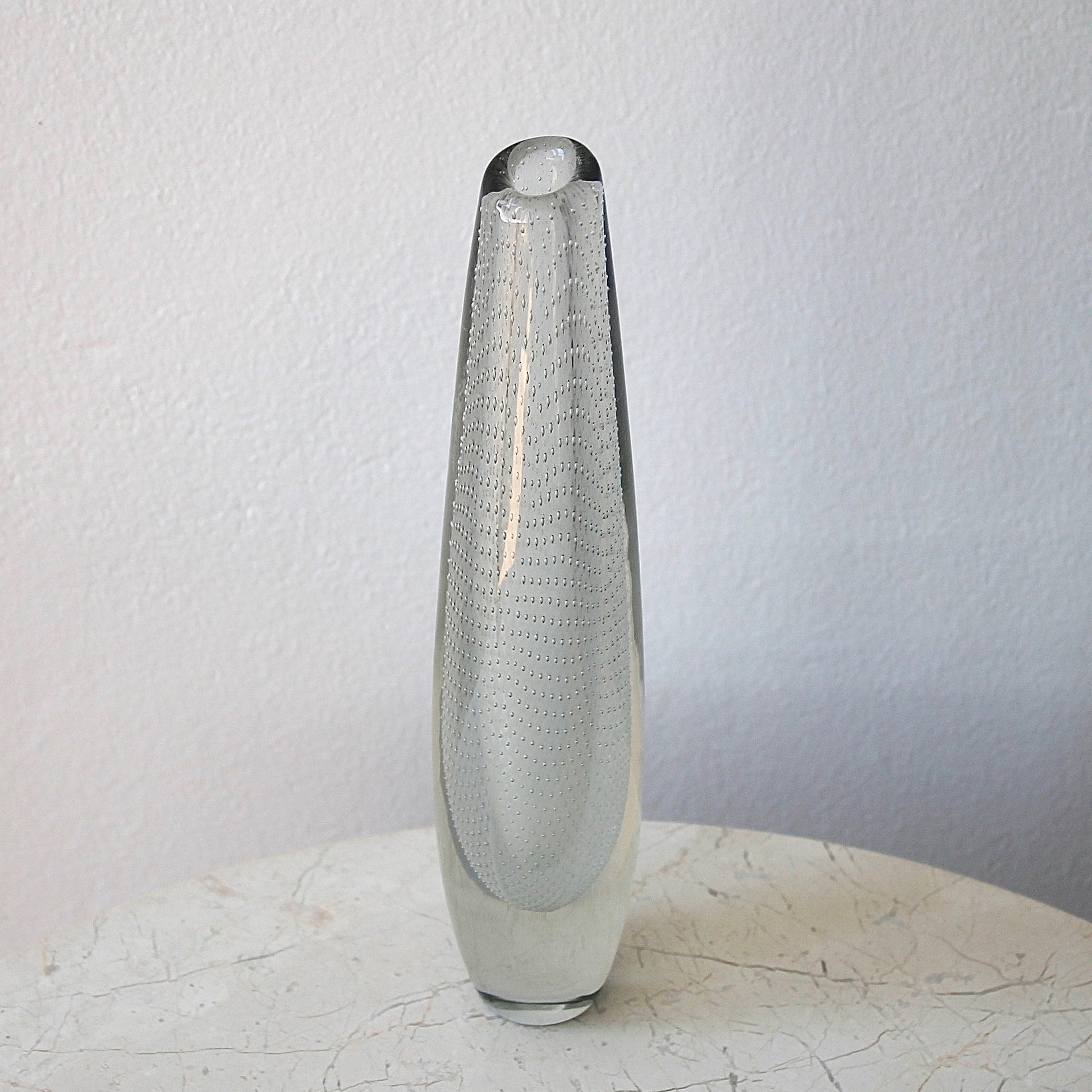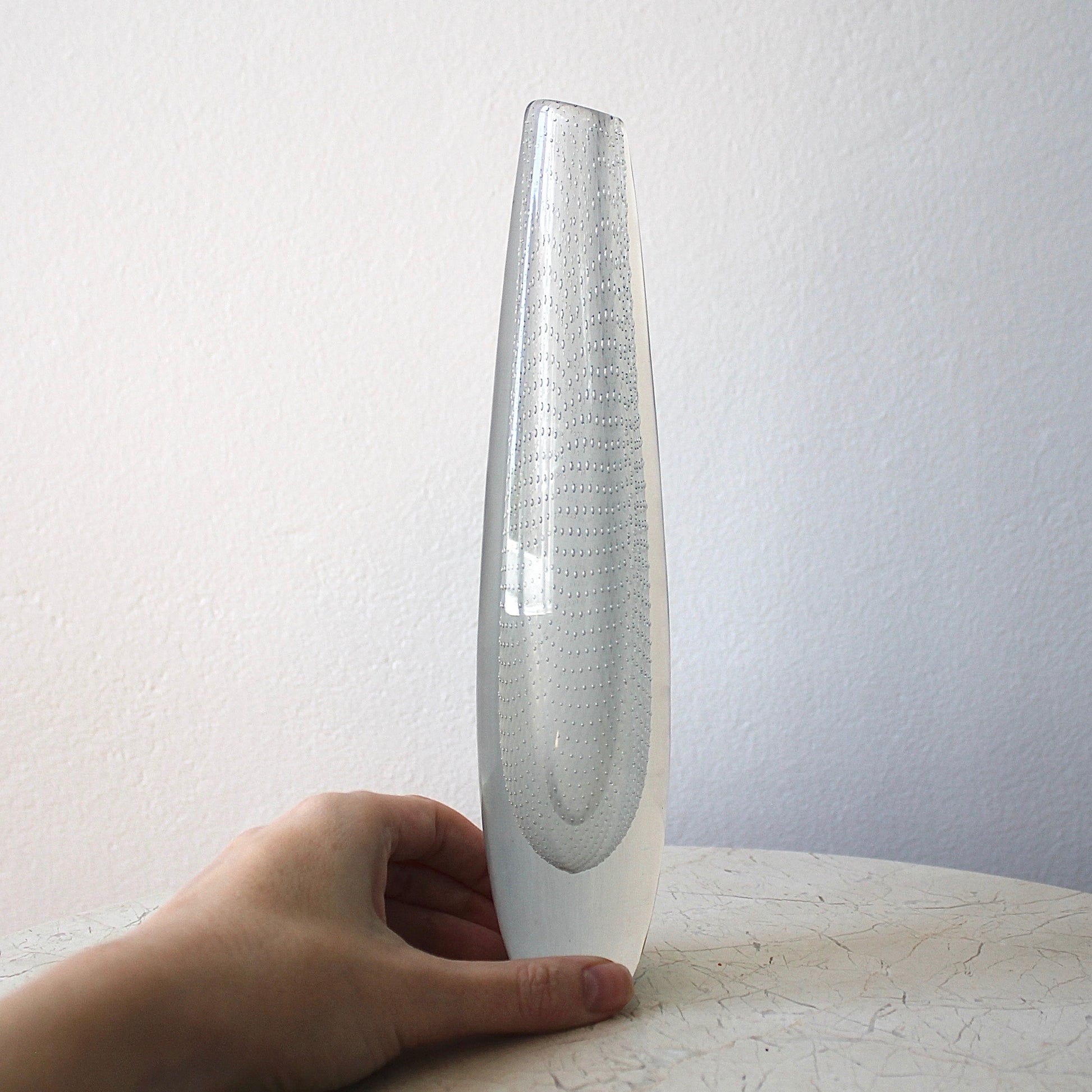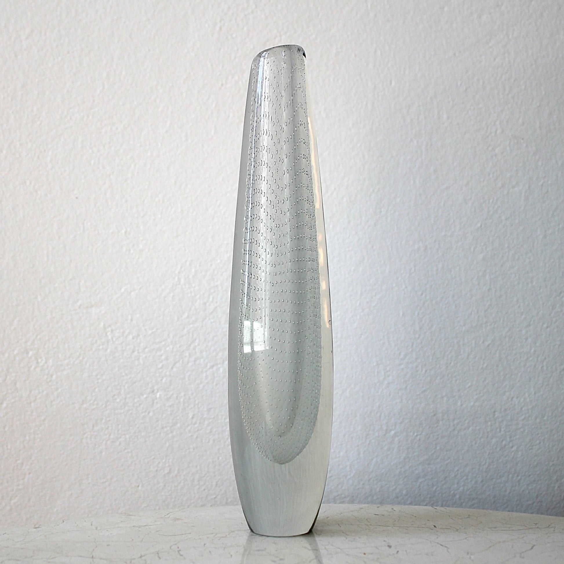 Known as model GN 31, this stunningly beautiful vase features blown solid clear & white crystal with controlled internal bullicante. The incredible effect is created through a spike mould blown glass technique, which was expertly mastered by Nuutajarvi glass artists.