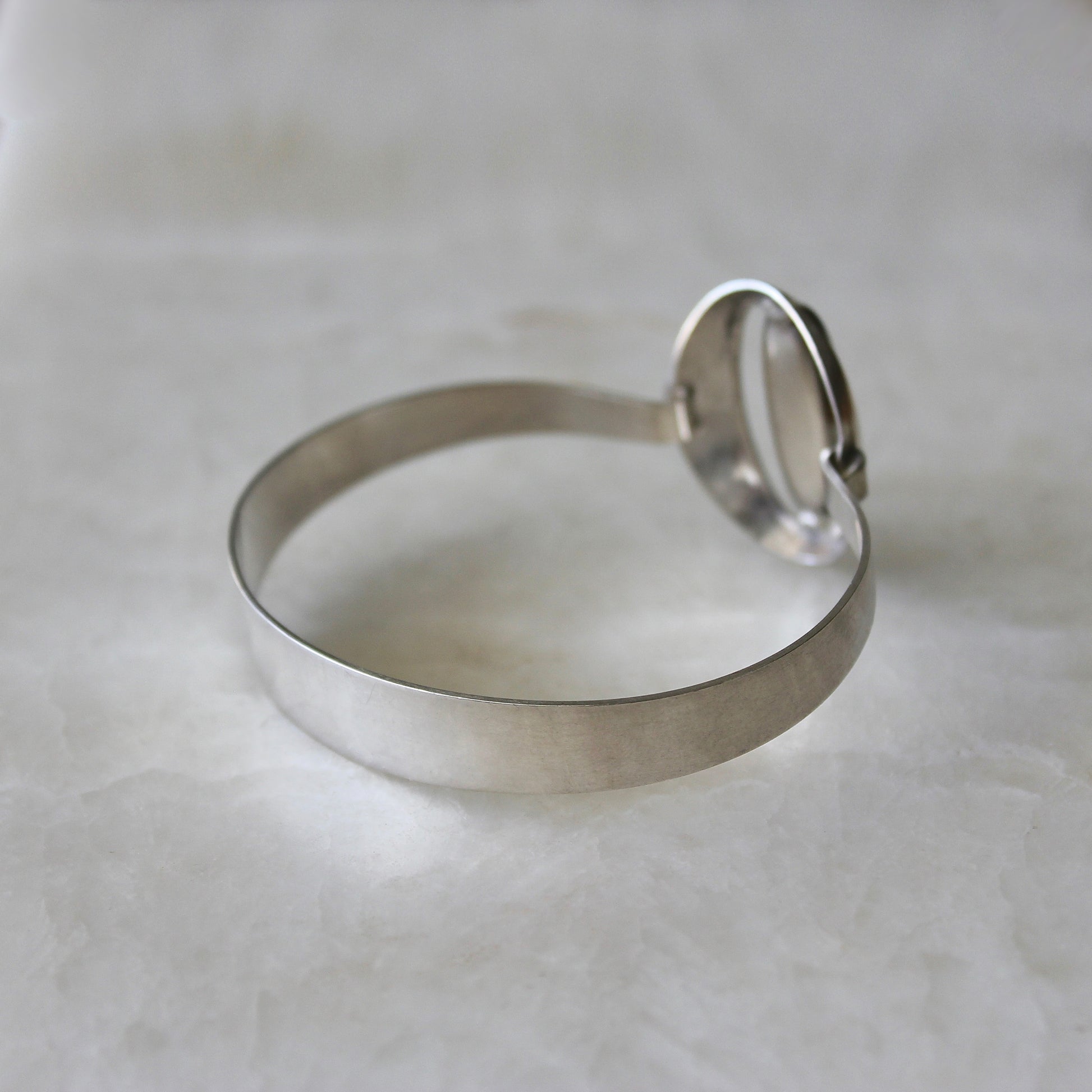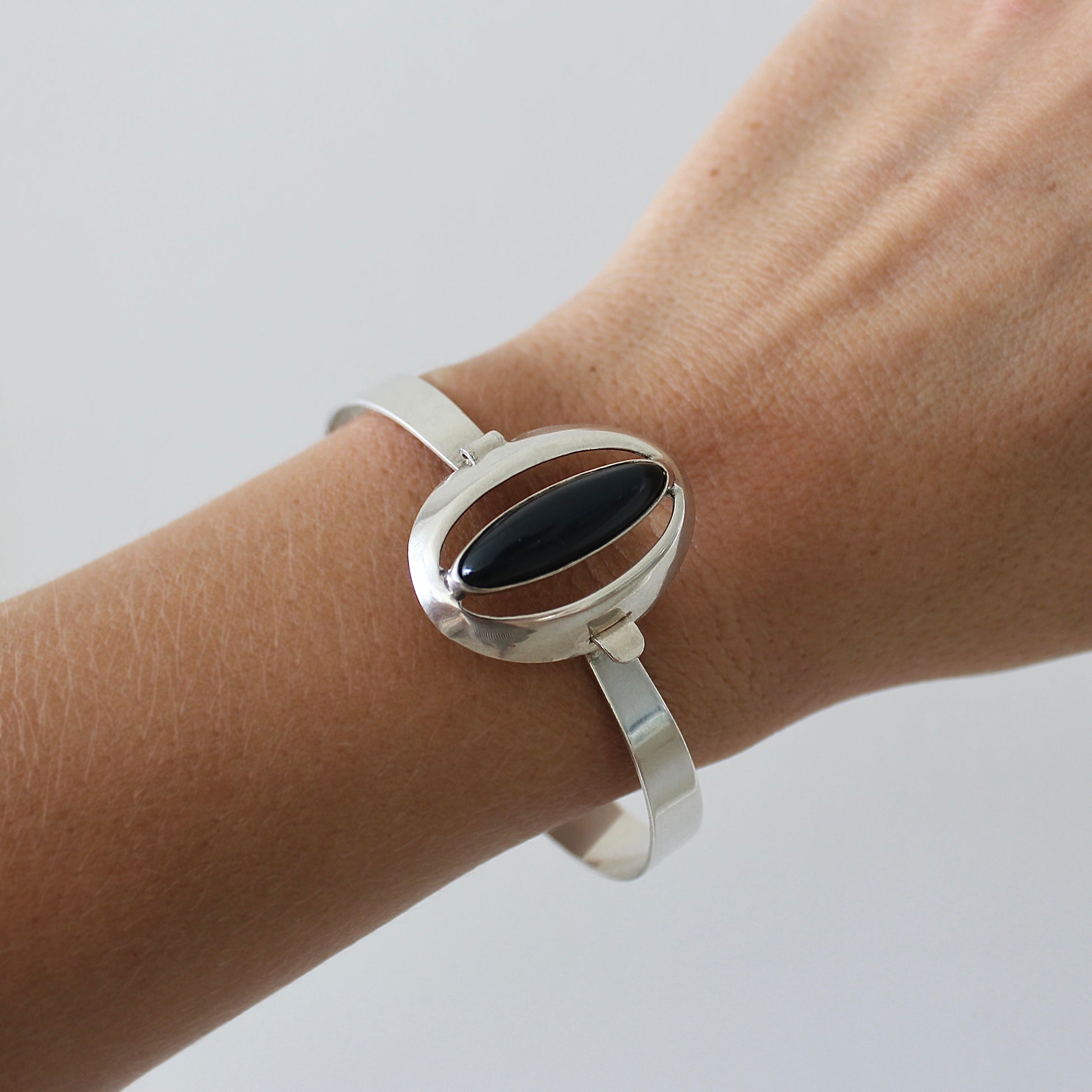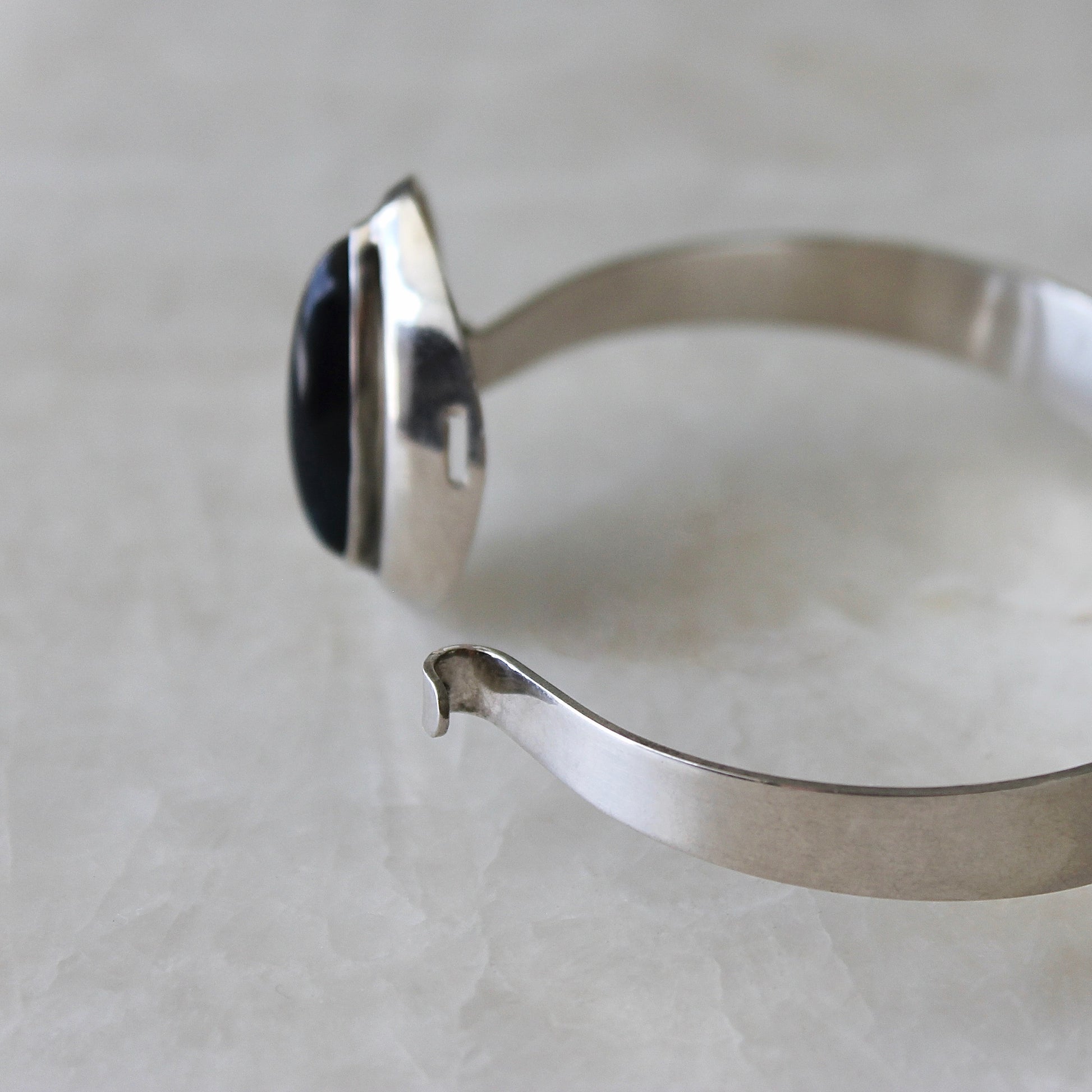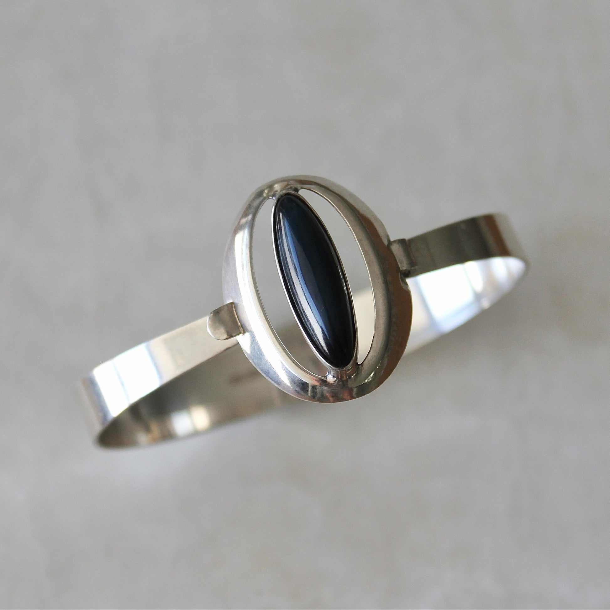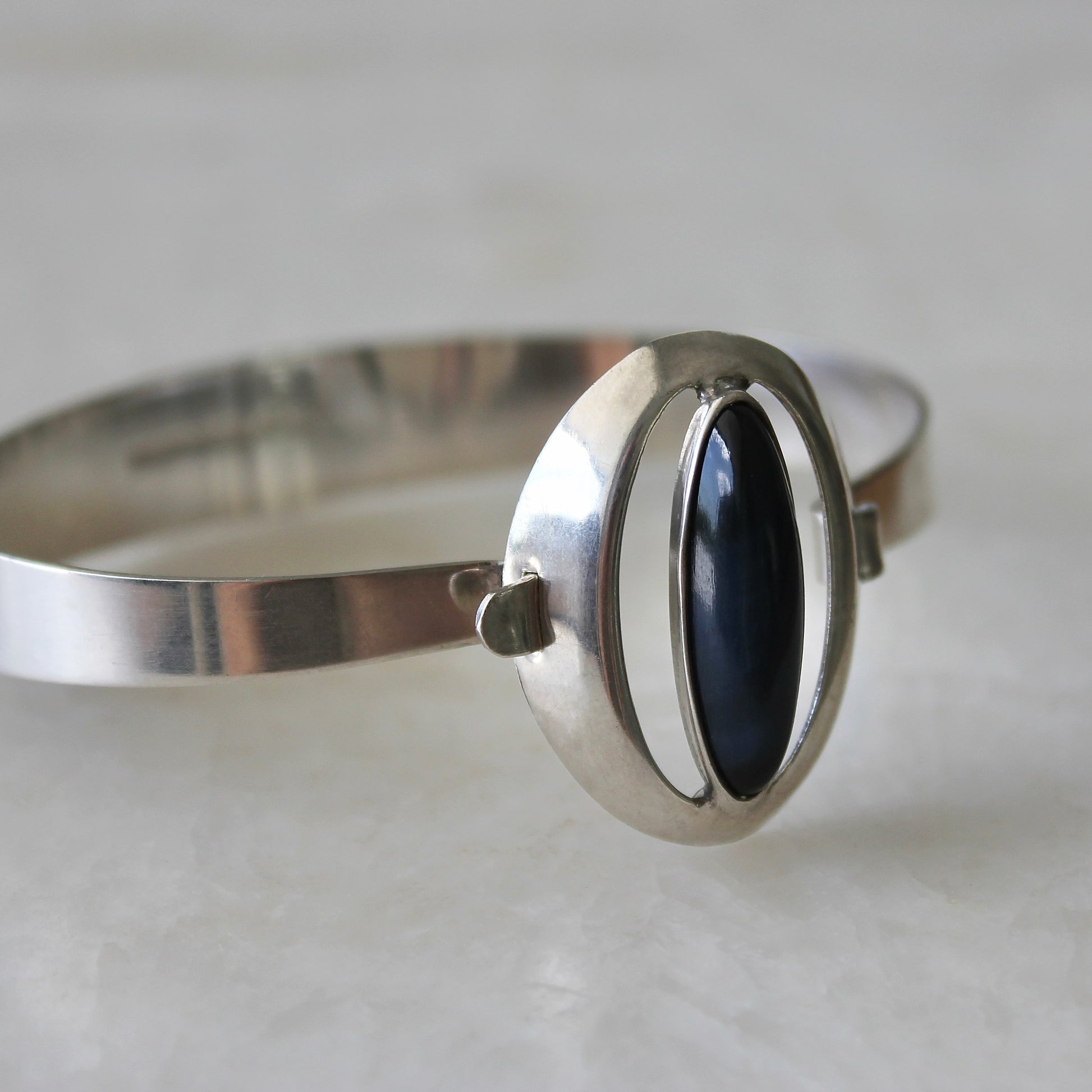 This beautiful Modernist bracelet features silver that frames a deep-blue oval Hawk's Eye. It was designed and handcrafted by jeweller Jouko Janné, who was registered under the maker's mark JJ in Lappeenranta between 1959 and 1966.