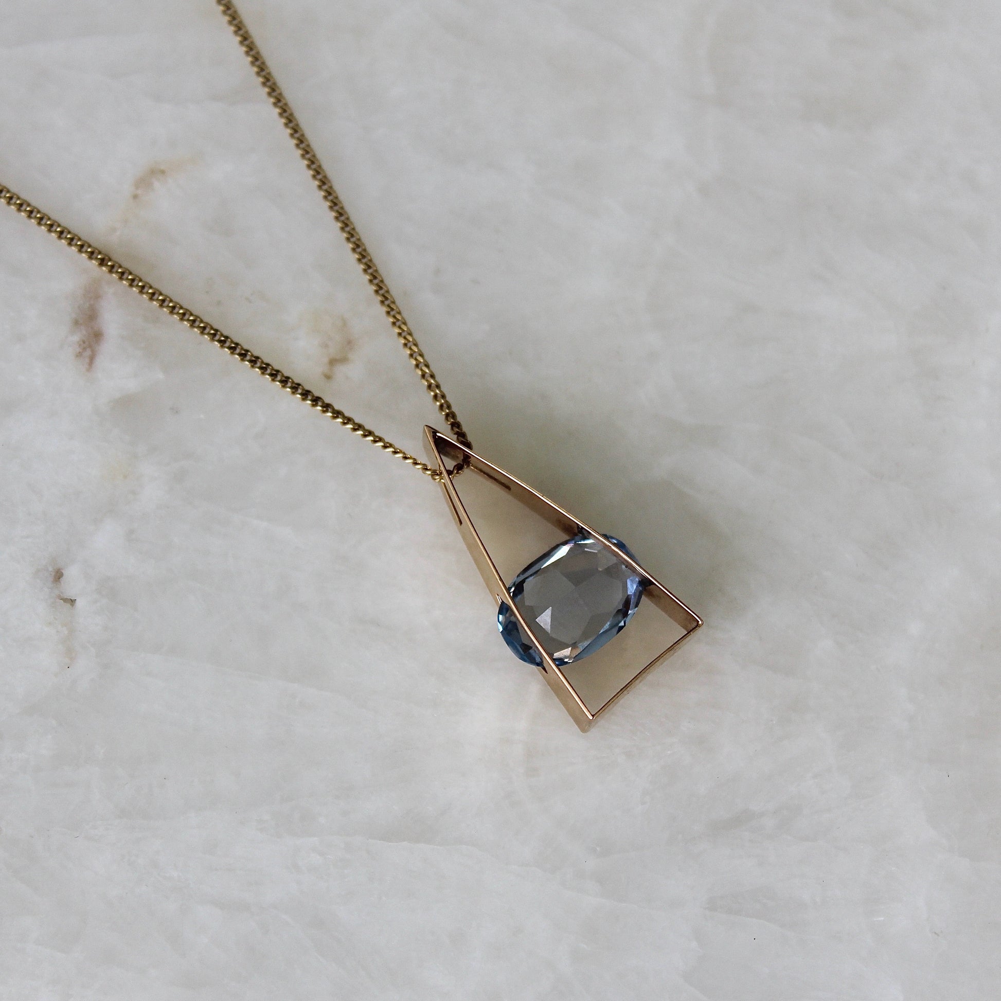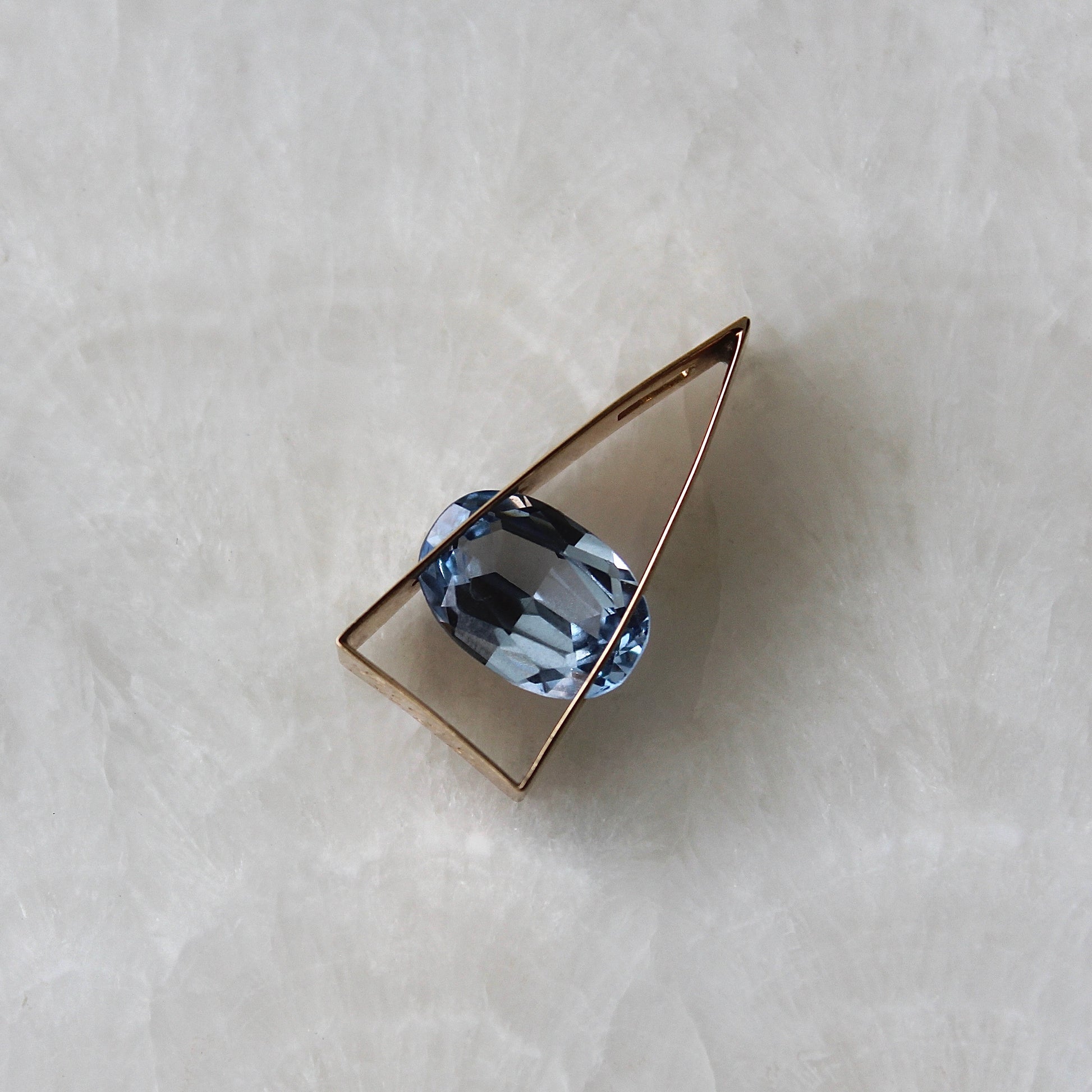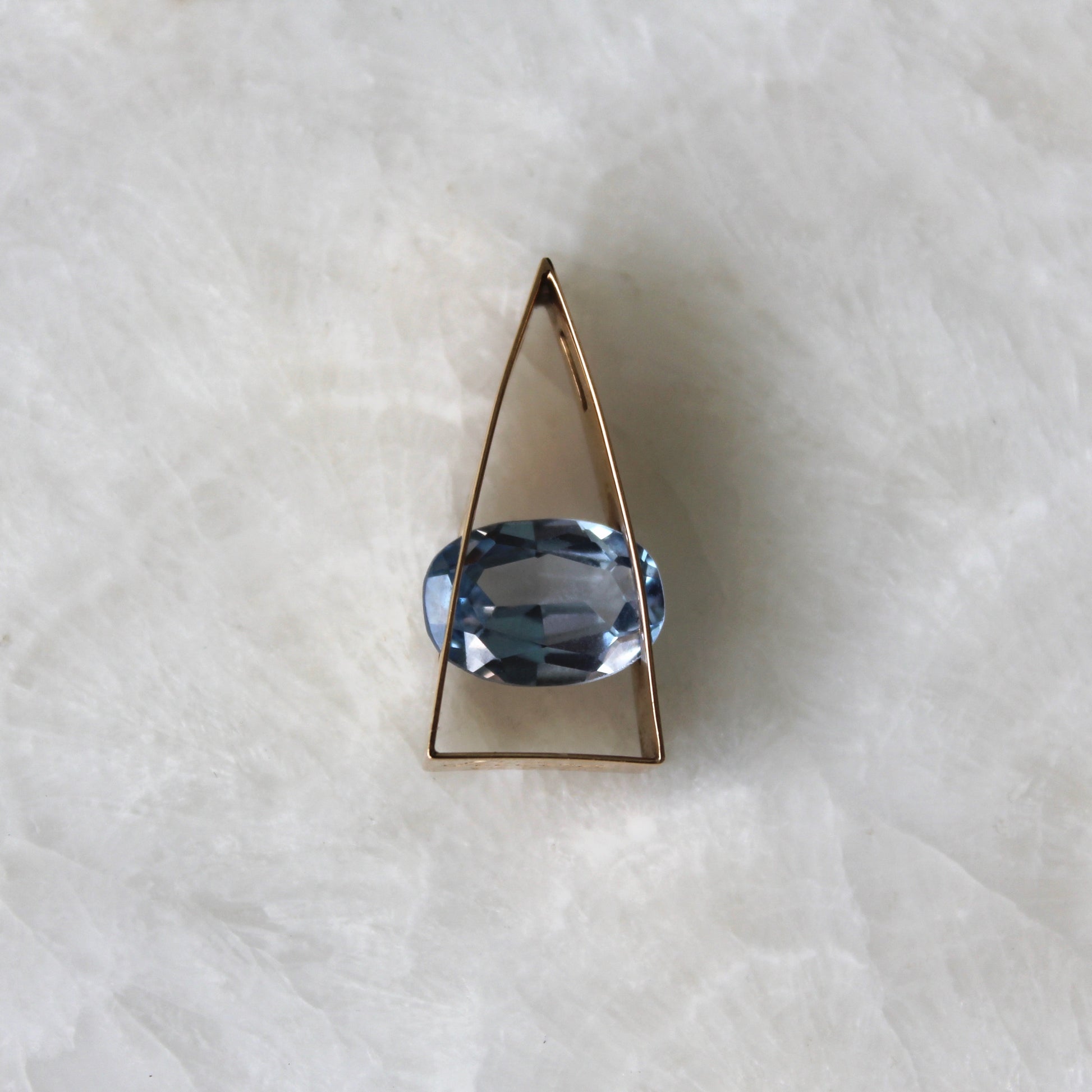 This stunning Modernist pendant features a light blue facetted stone suspended in a triangular frame of solid 14k gold. The unique design was handcrafted in 1961 by Helsinki based jeweller Jouko Uolavi Sorvari, which was registered from 1954 until 1994.