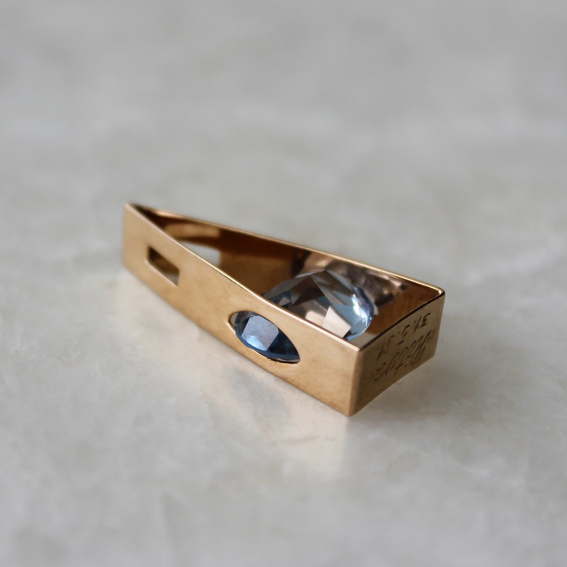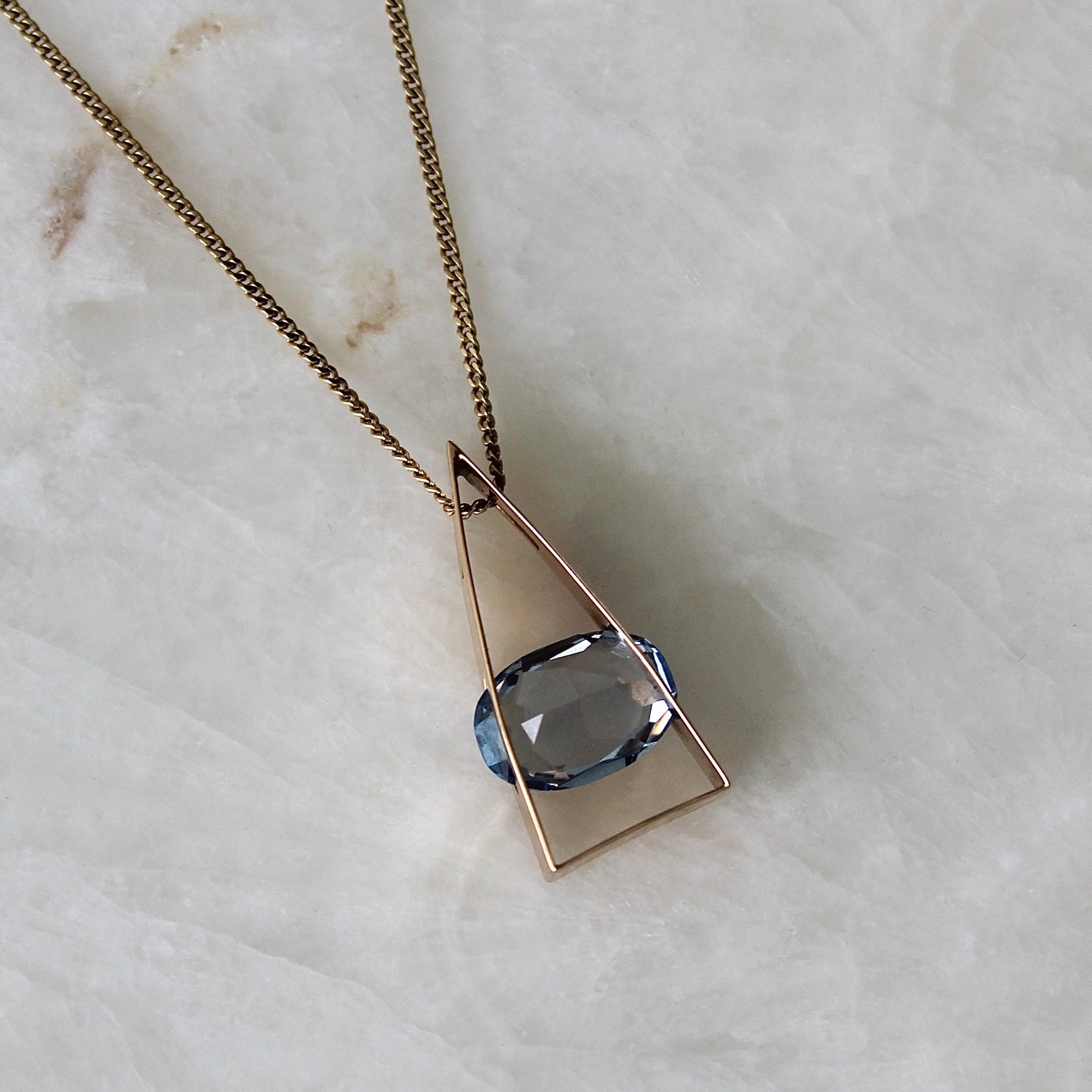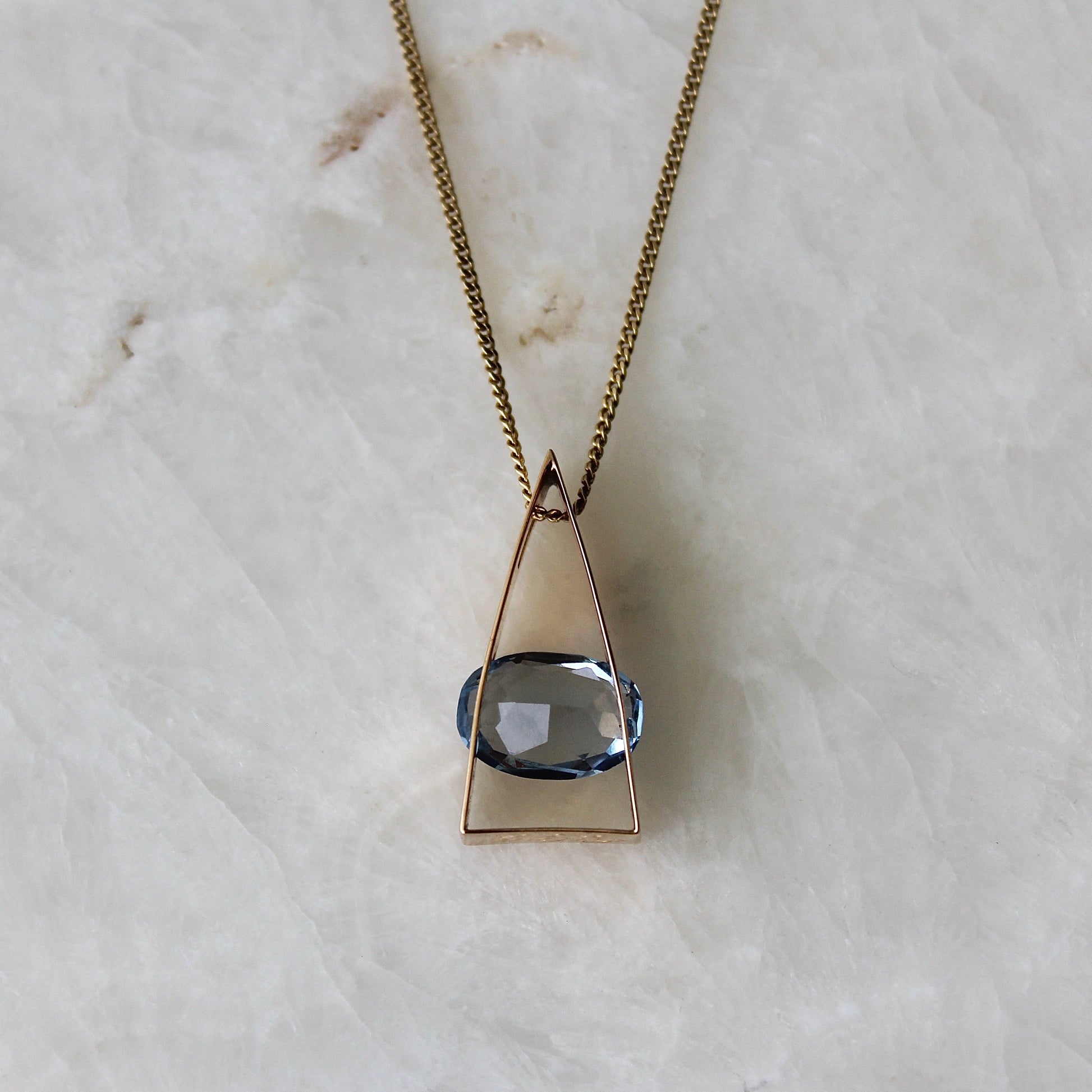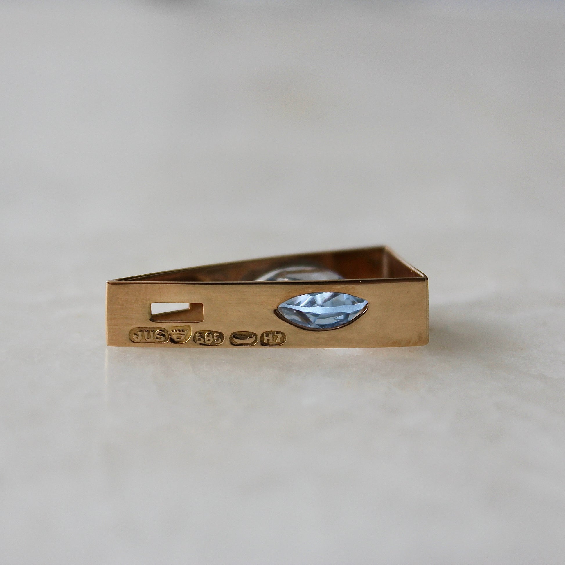 This stunning Modernist pendant features a light blue facetted stone suspended in a triangular frame of solid 14k gold. The unique design was handcrafted in 1961 by Helsinki based jeweller Jouko Uolavi Sorvari, which was registered from 1954 until 1994.