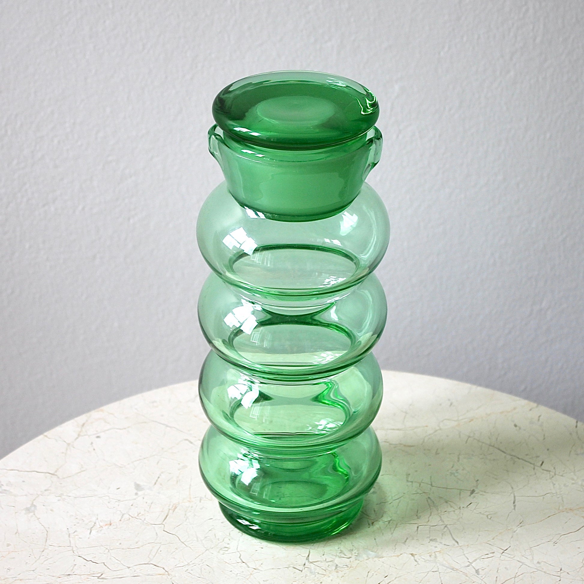 This rare original mid-century cocktail shaker was designed by the famous Kaj Franck for Nuutajärvi Notsjö in 1953. Known as model 2544, the design features a hooped form of heavy blown sea-green glass and solid matte-finish lid.