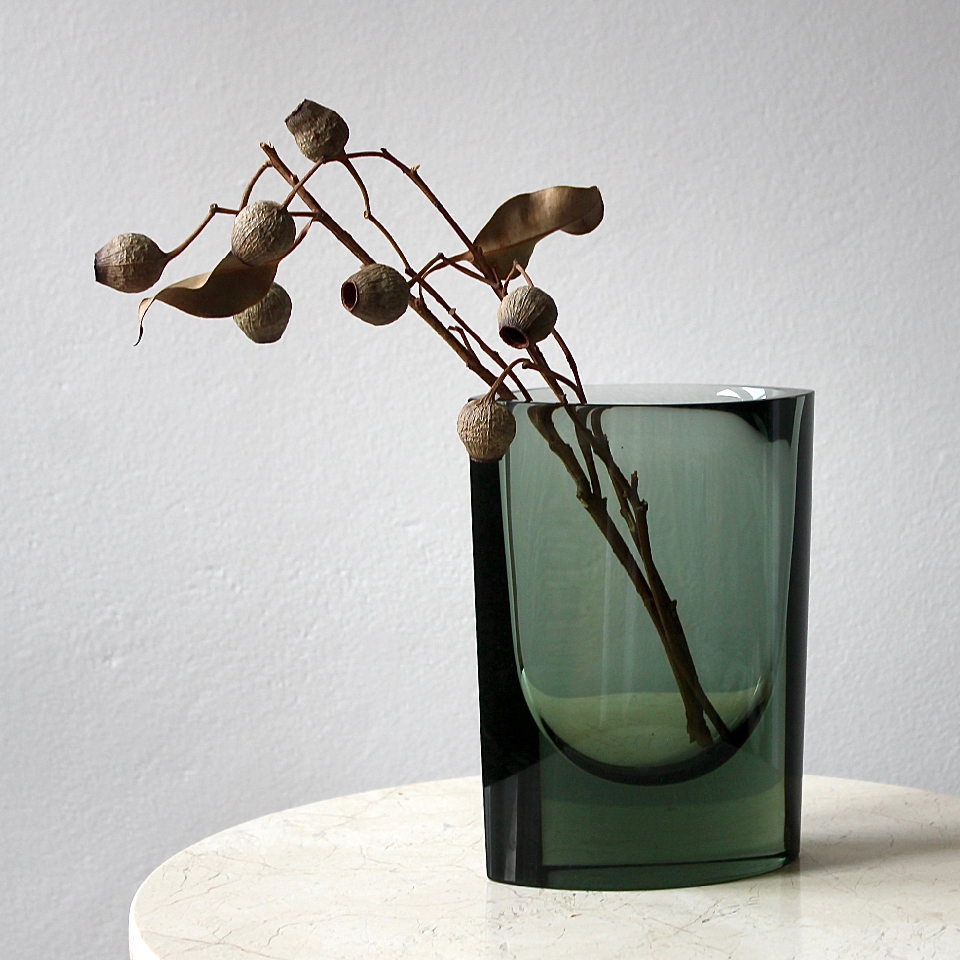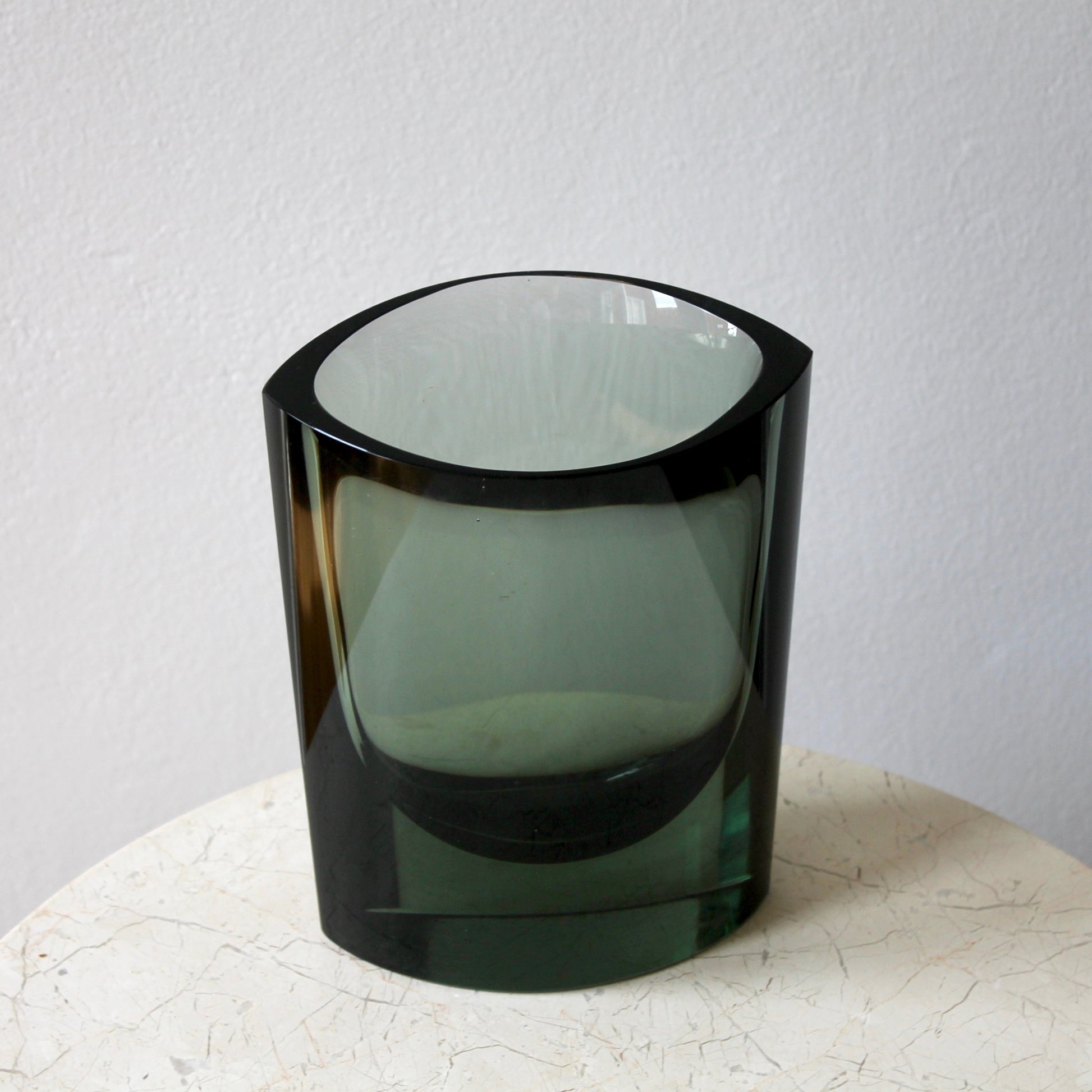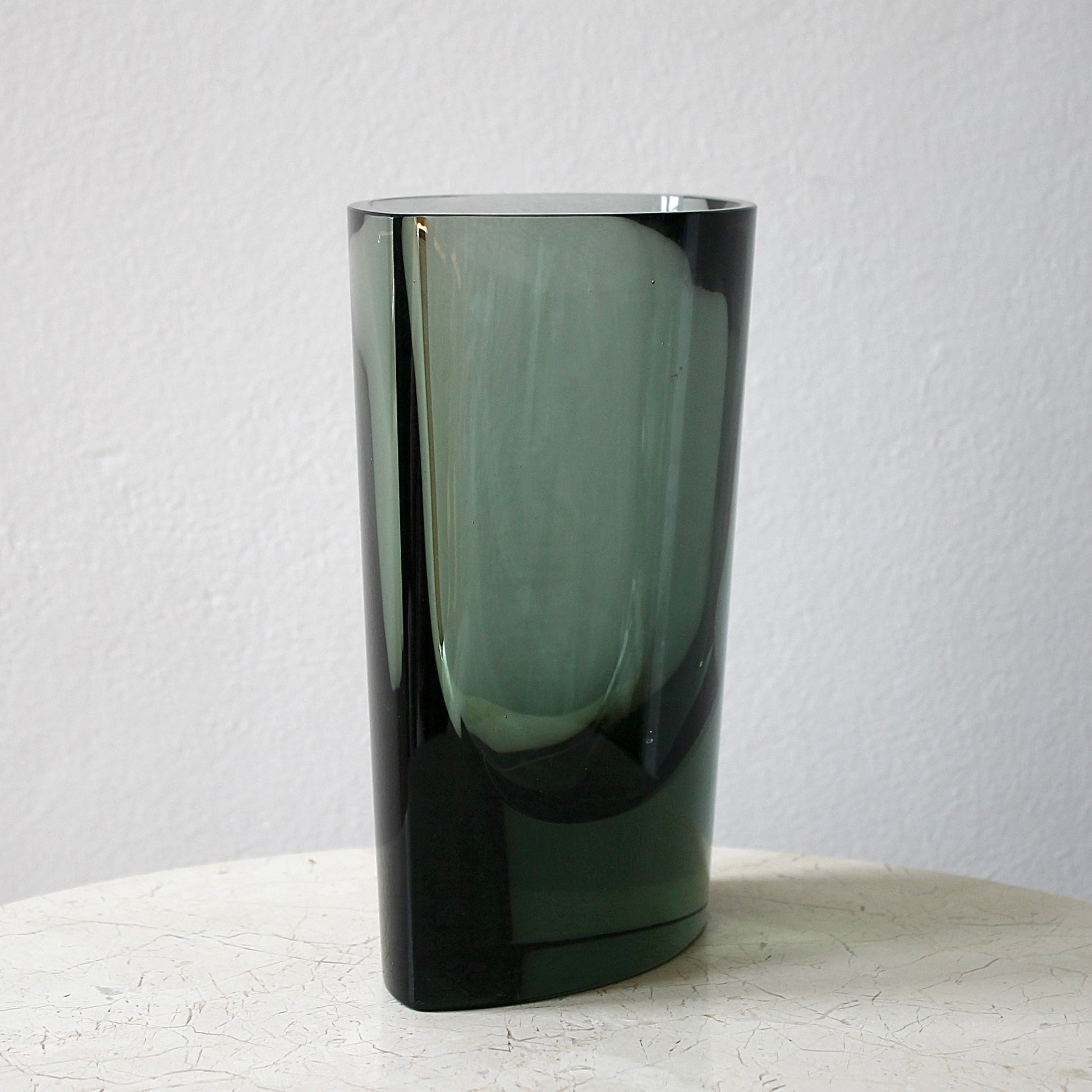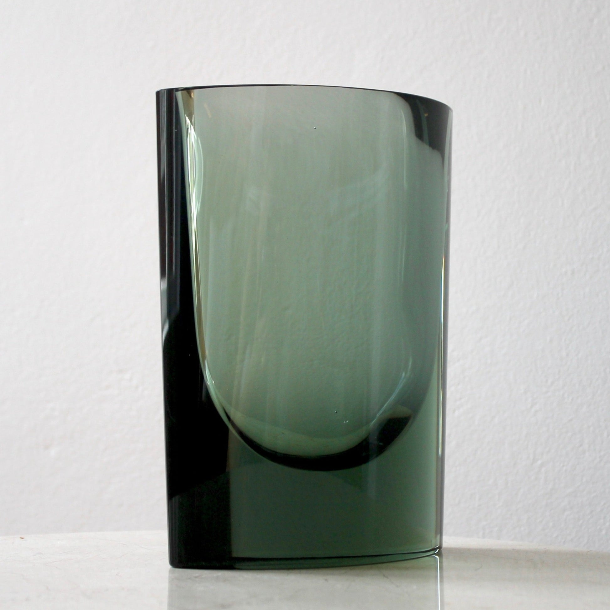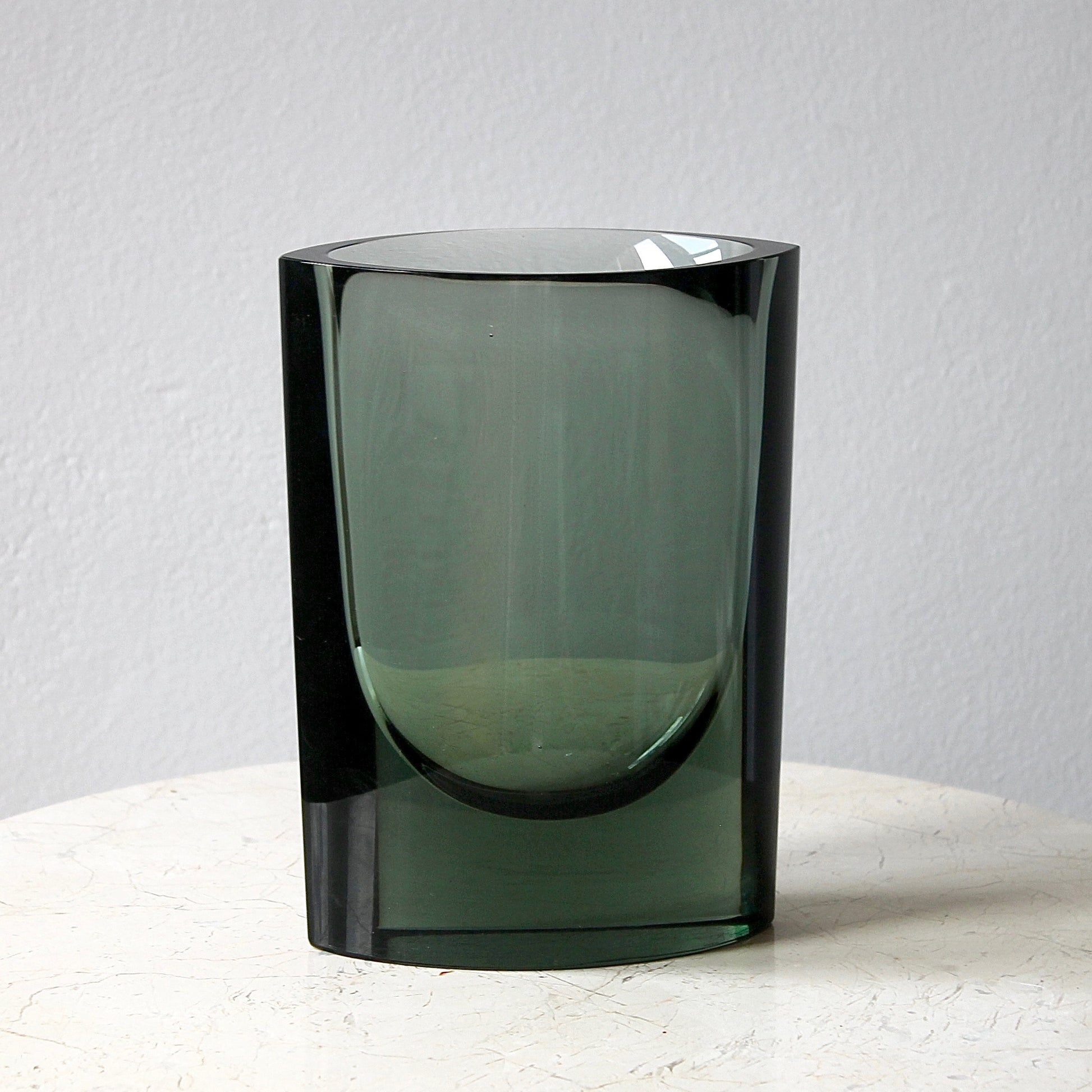 This striking heavy Modernist vase has a geometric form with polished sides. It features smokey olive still mould-blown glass with exceptional lines and shading that change at different angles. This design, known as model 407, was created in the 1960s.