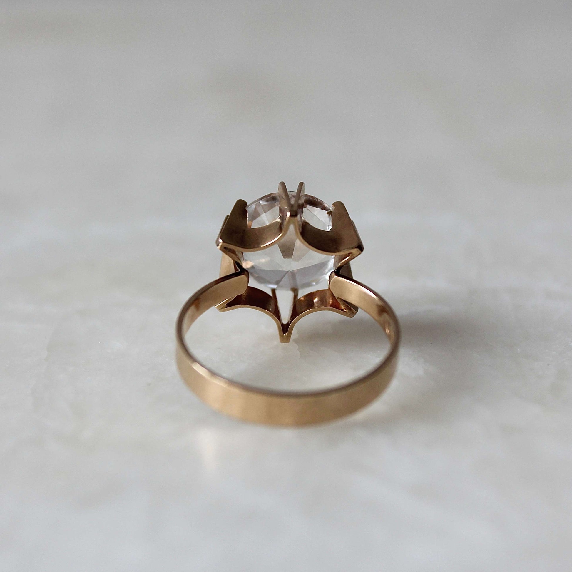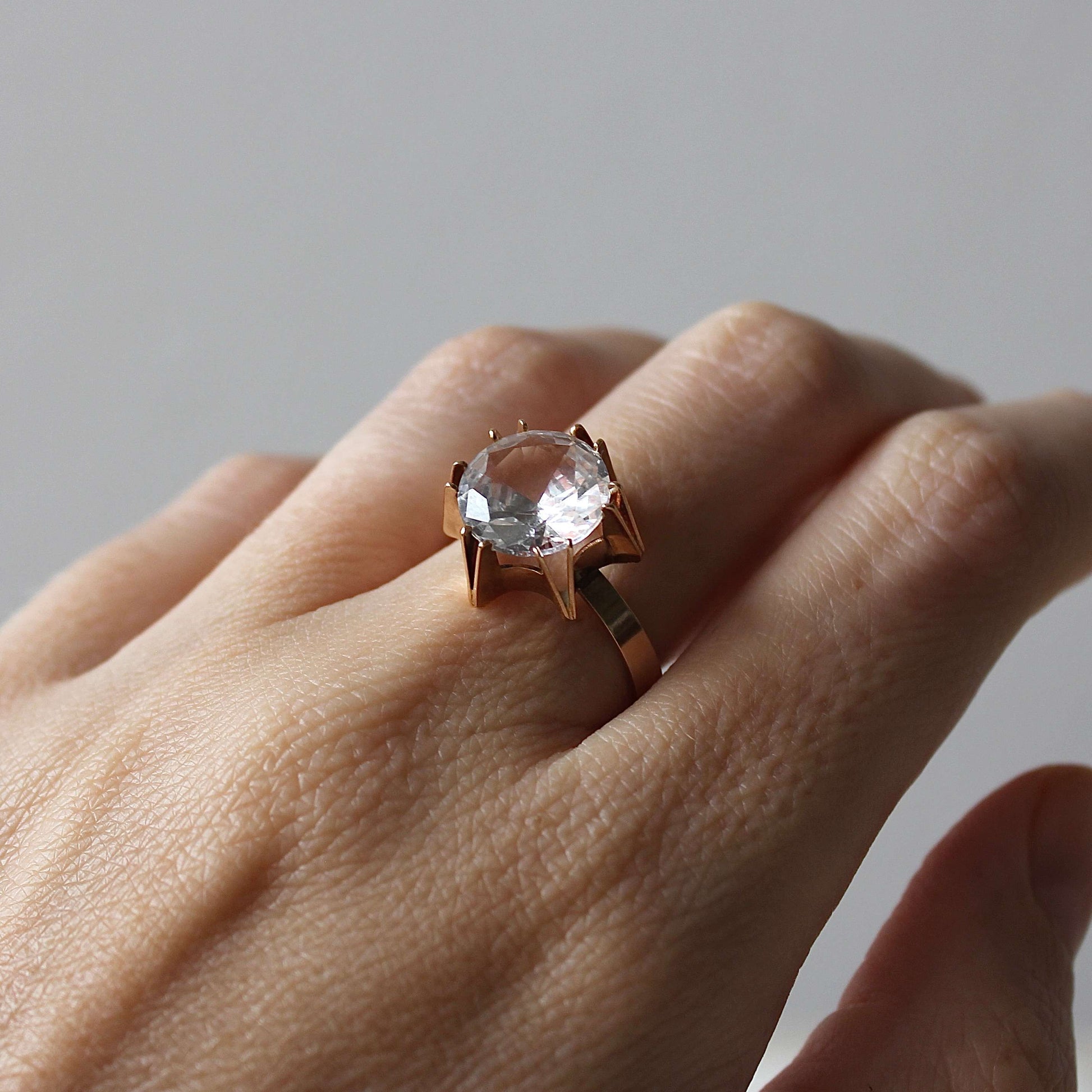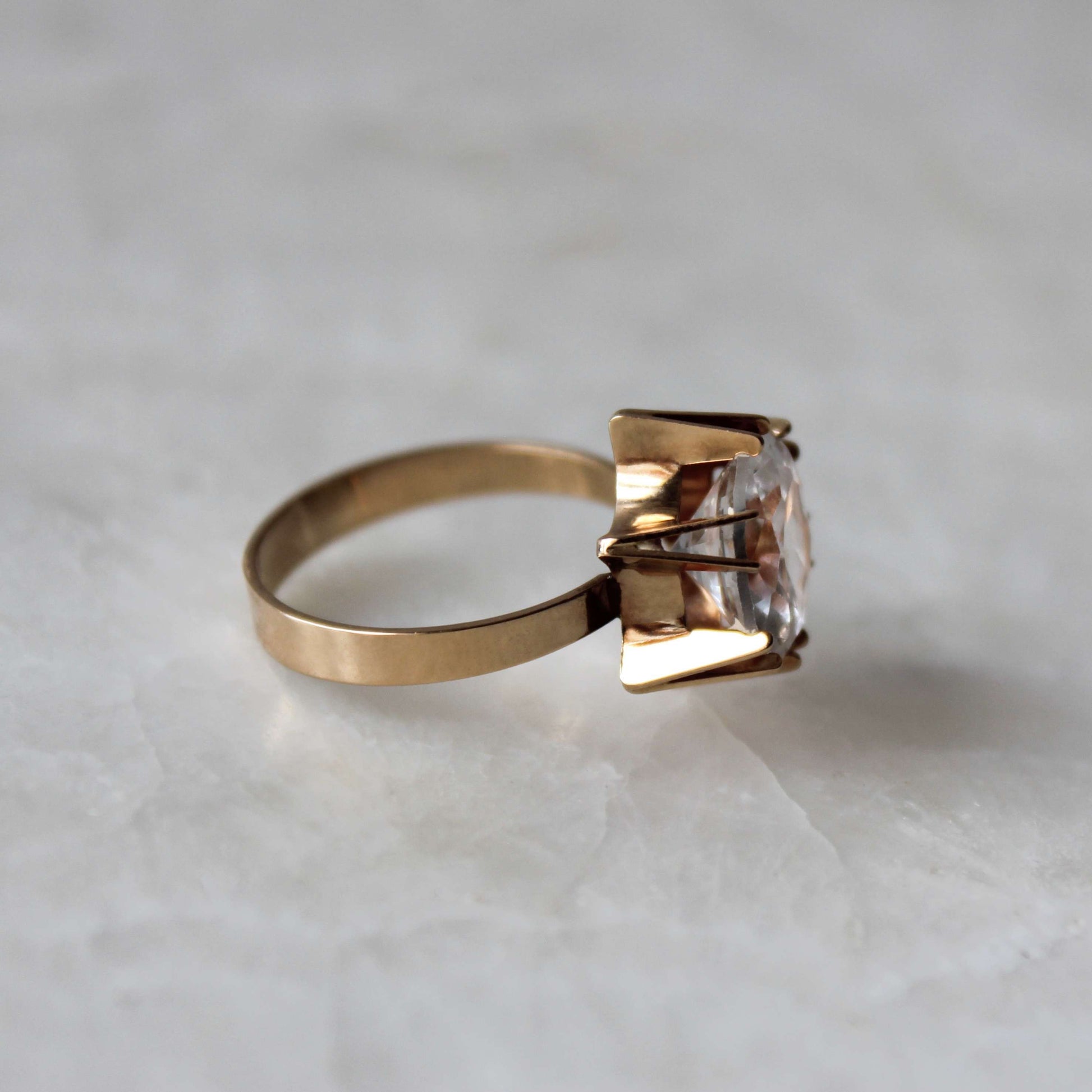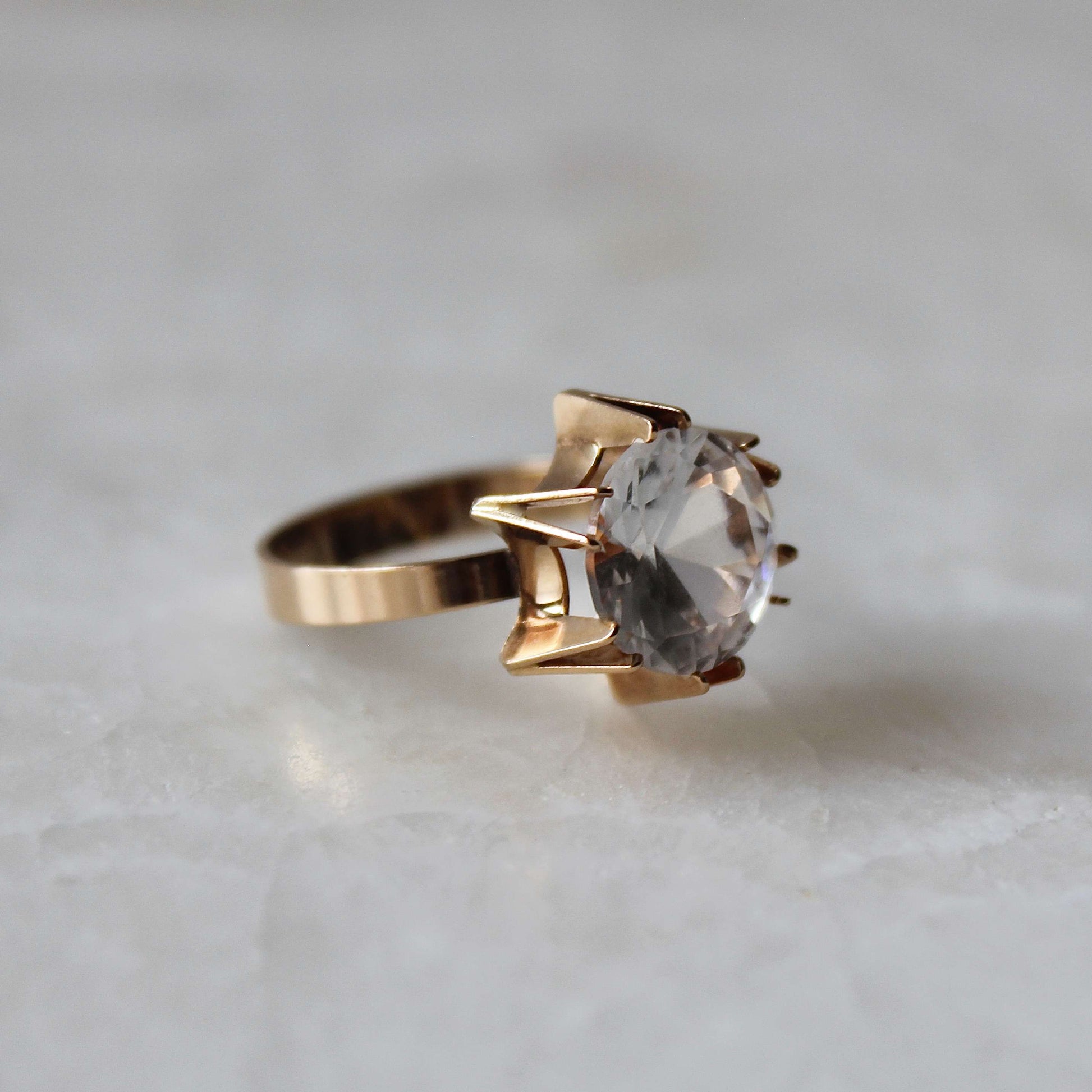 This lovely Modernist ring features handcrafted solid 14k gold that beautifully frames a faceted clear lab-created spinel in a unique setting. It was designed and made by Koru-Sampo (1963 - 1994) in 1968.