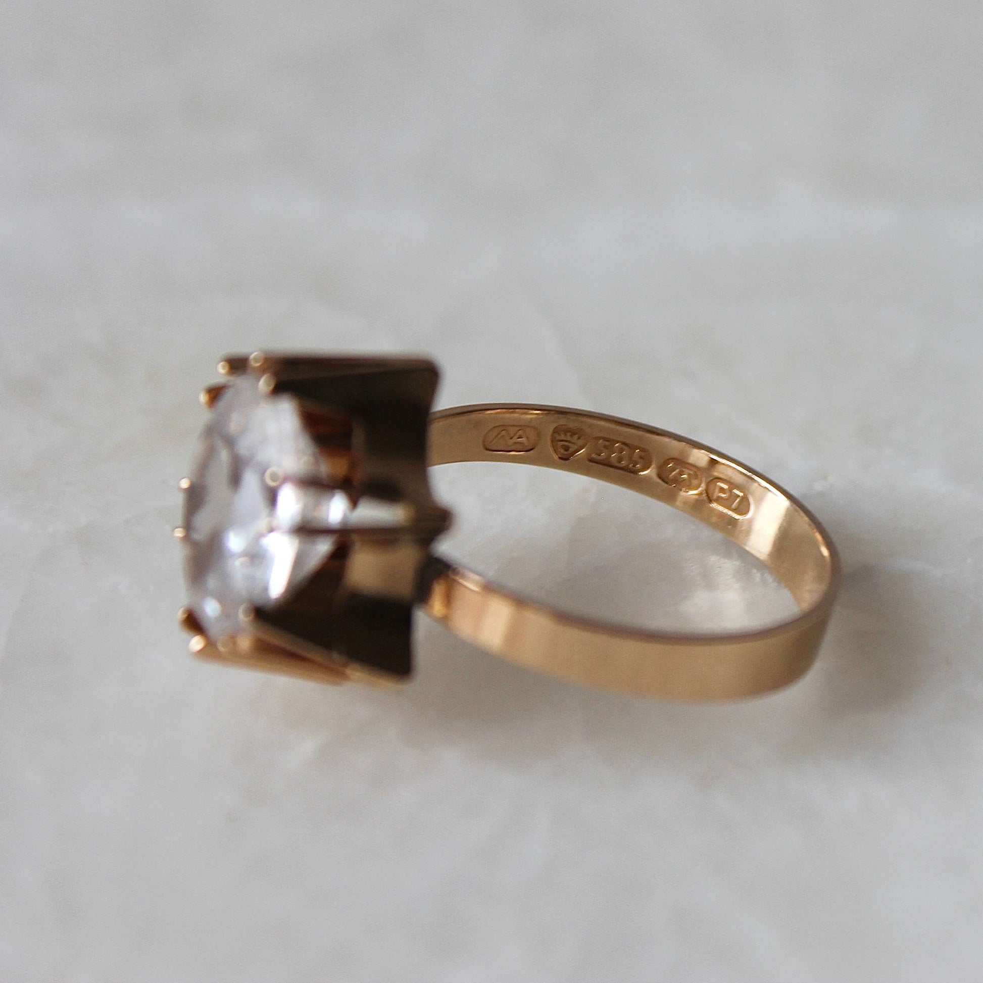 This ring is fully stamped with the Finnish hallmarks Koru-Sampo motif (maker), crown motif (Finland), '585' (14k gold), Turku motif & 'P7' (year).