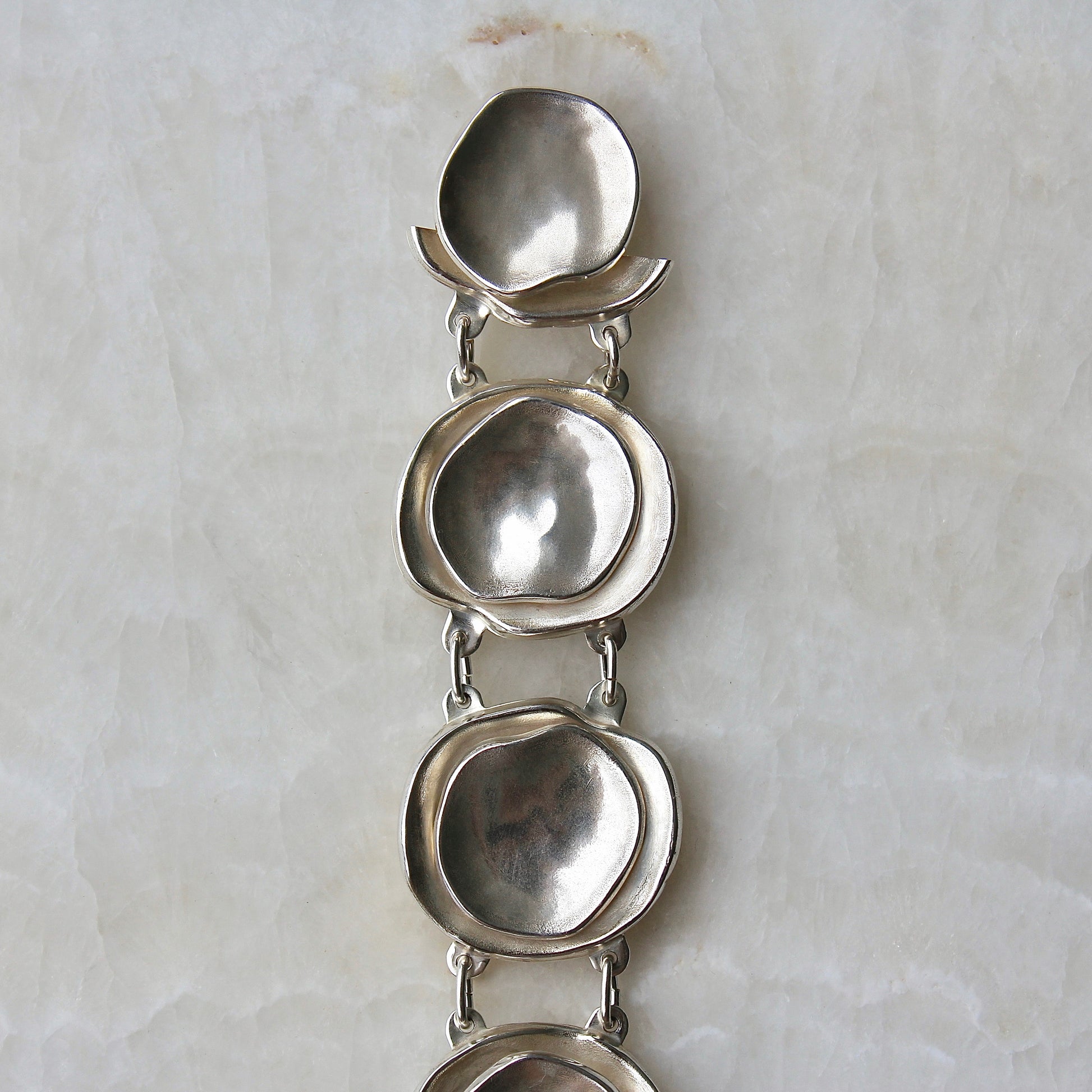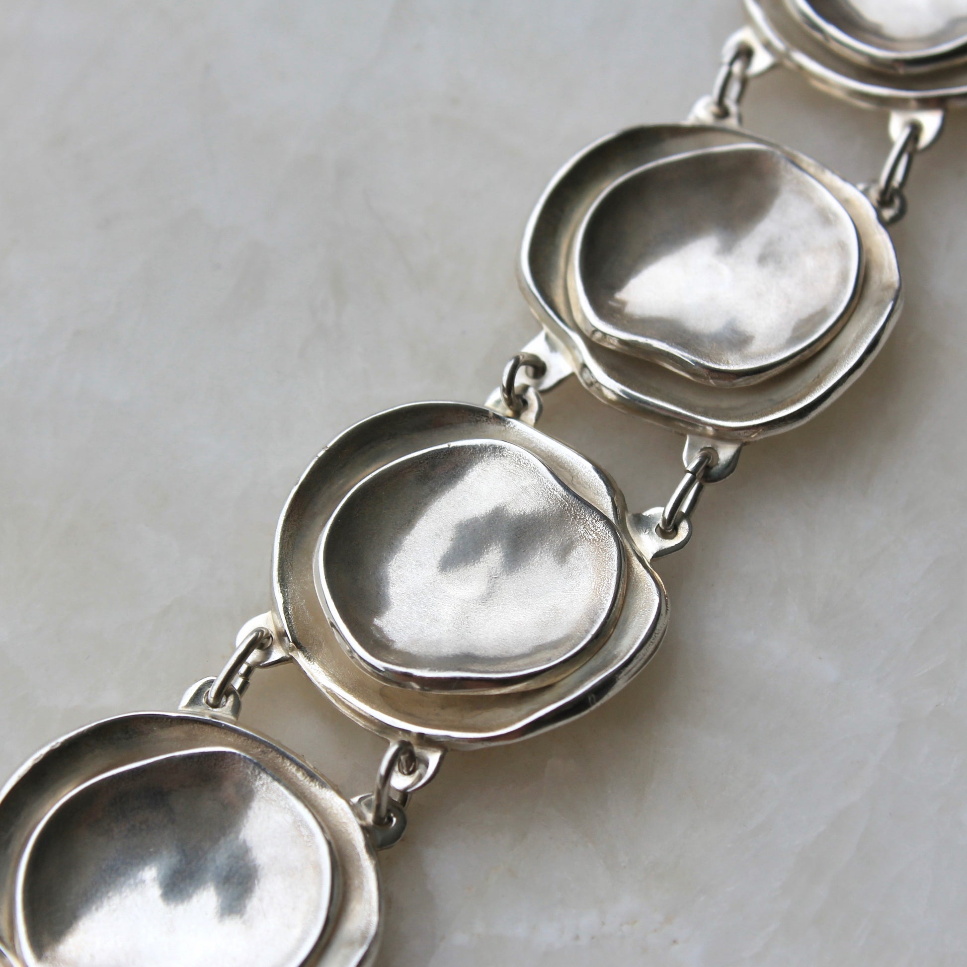 This rare bracelet features six abstract silver circular forms reminiscent of a flower, connected by smaller links. The beautiful design belongs to Liisa Vitali's 'Gardenia' series and was sold by the famous precious metals company Kultakeskus in 1974.