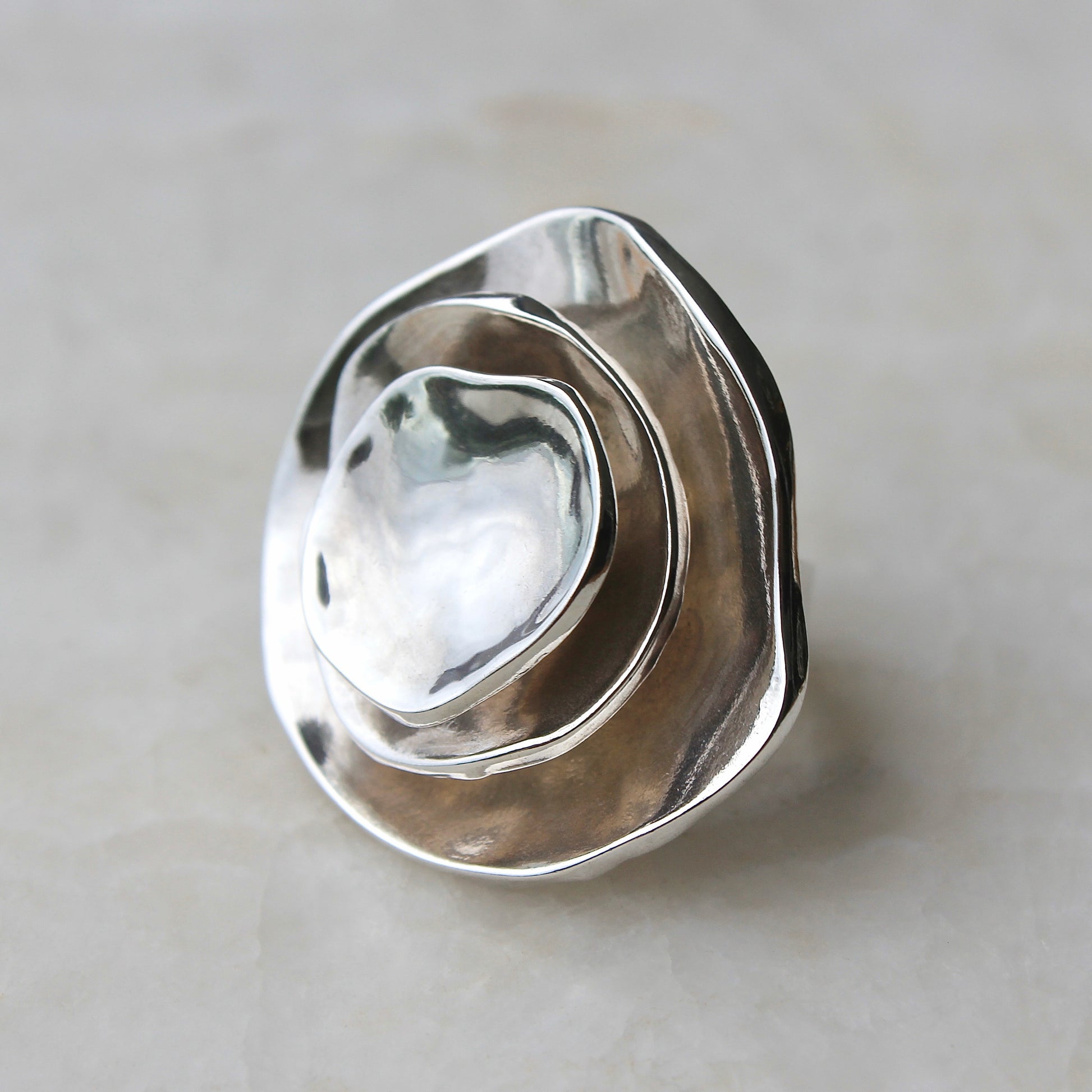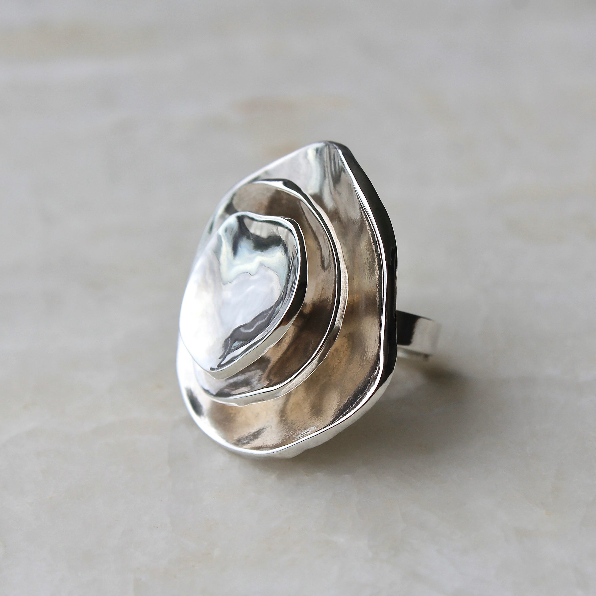 This rare ring features abstract silver layers reminiscent of a flower. The beautiful design belongs to Liisa Vitali's 'Gardenia' series and was sold by the Helsinki based jeweller N. Westerback in 1974.
