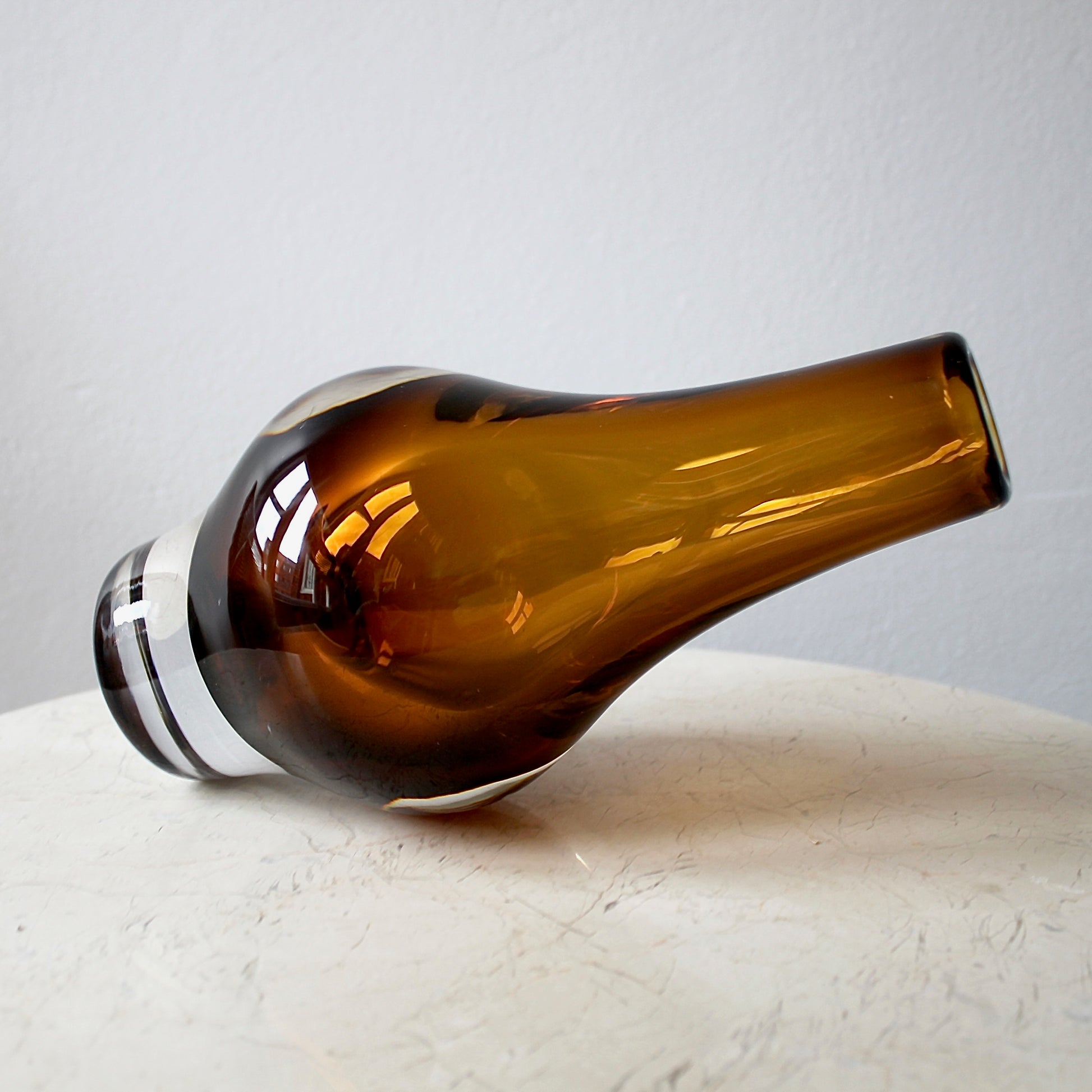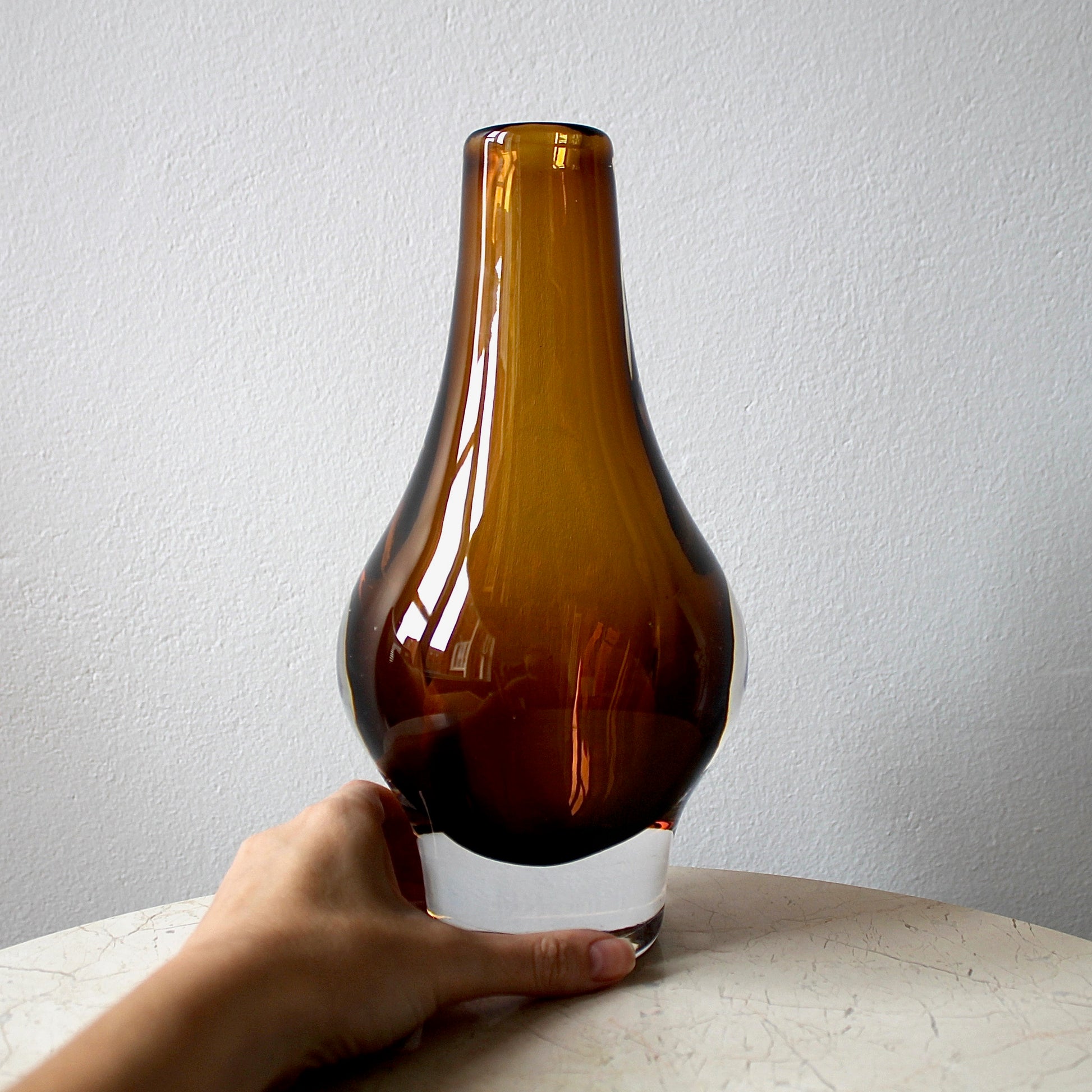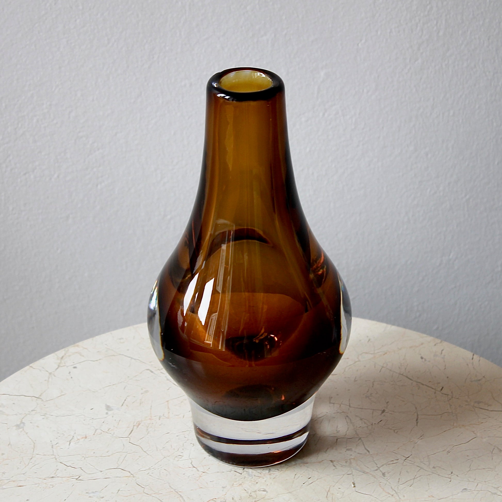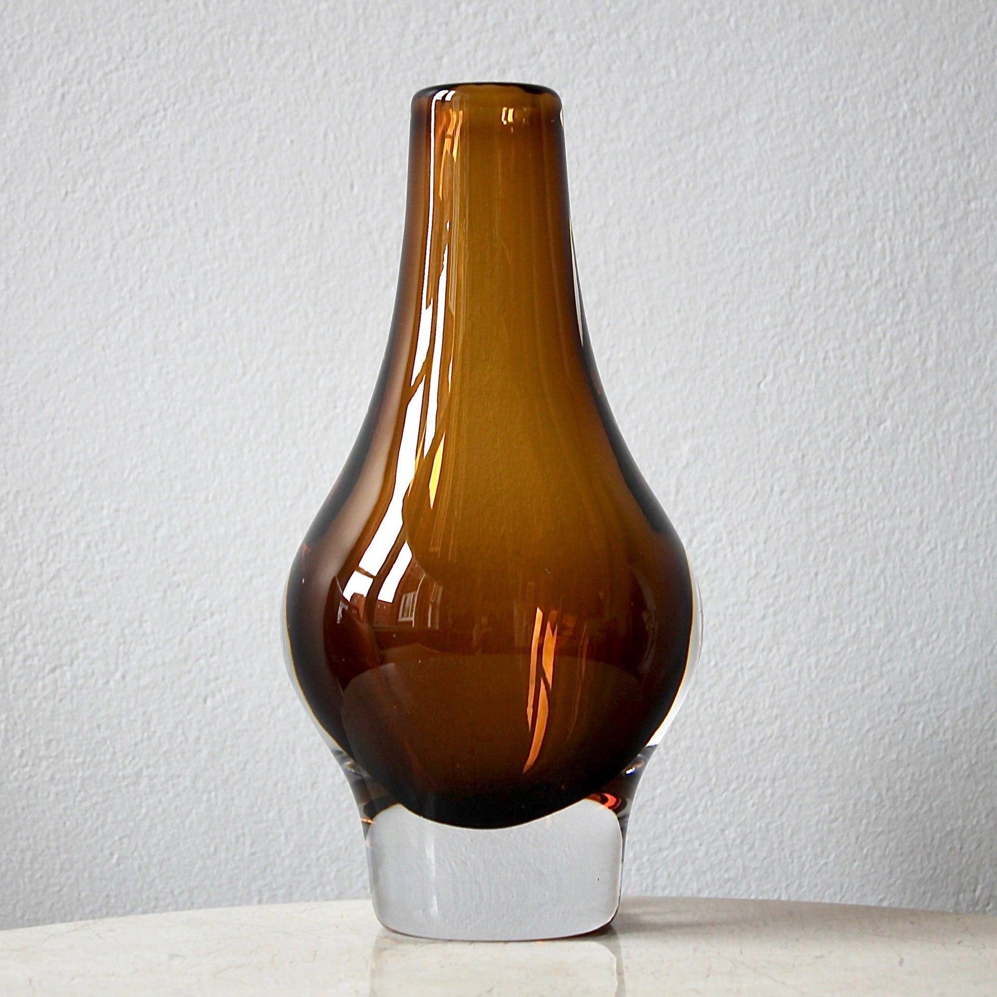 This original mid-century sommerso vase features super solid clear crystal with a beautiful amber underlay. It was designed by Mona Morales-Schildt (1908 - 1999), who was one of Sweden's leading glass artists in the 20th century. This design comes in a variety of sizes, including miniature versions. This model is one of the larger ones.
