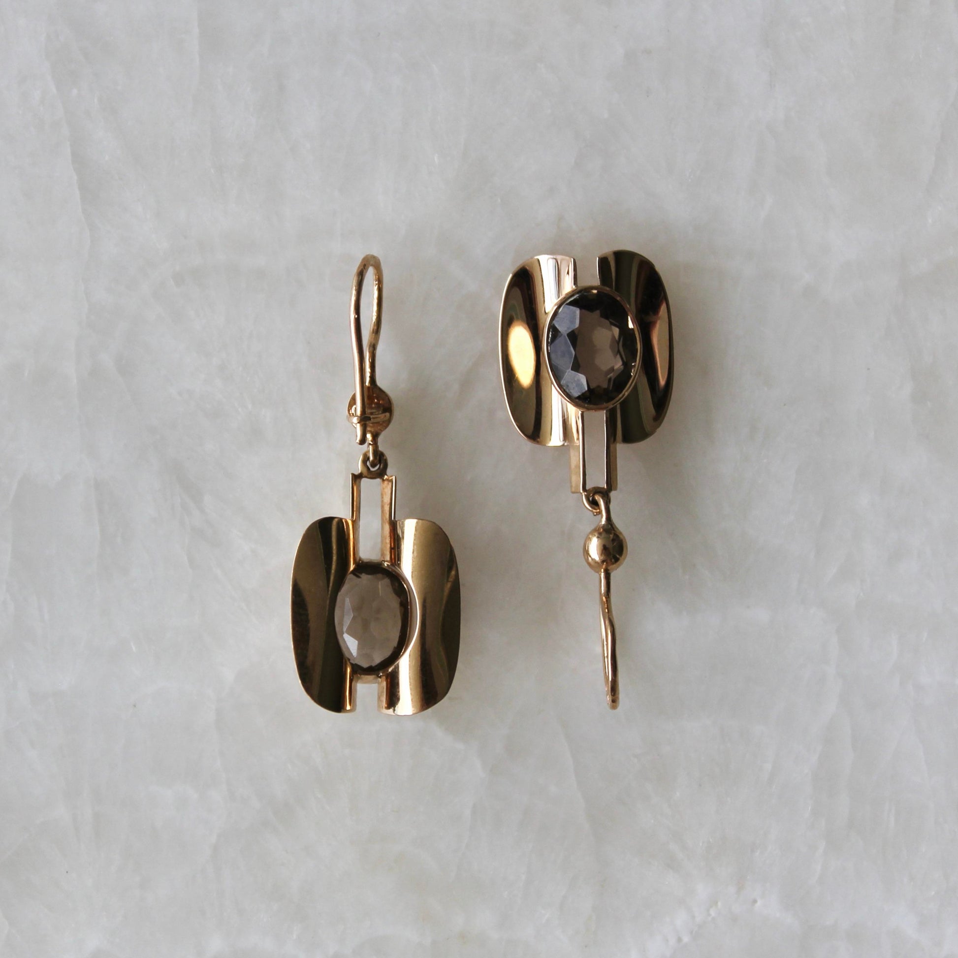 These elegant Modernist earrings feature solid 14k gold that beautifully frames a facetted oval smoky-quartz. The unique design was handcrafted by the atelier N. Westerback in Helsinki, which was registered between 1897 and 1969. (Originally to Nestor Westerback and later to Eino Westerback in 1919).