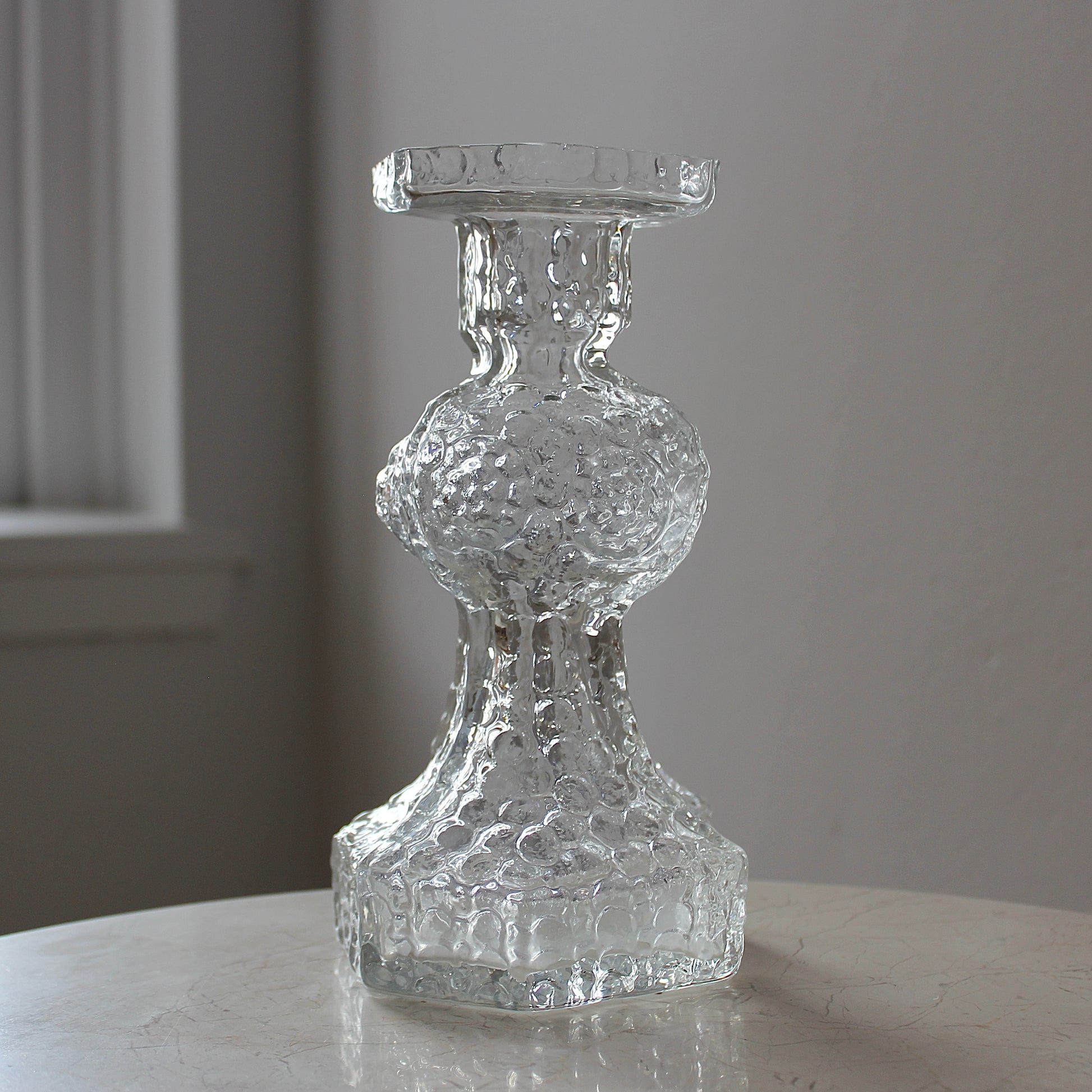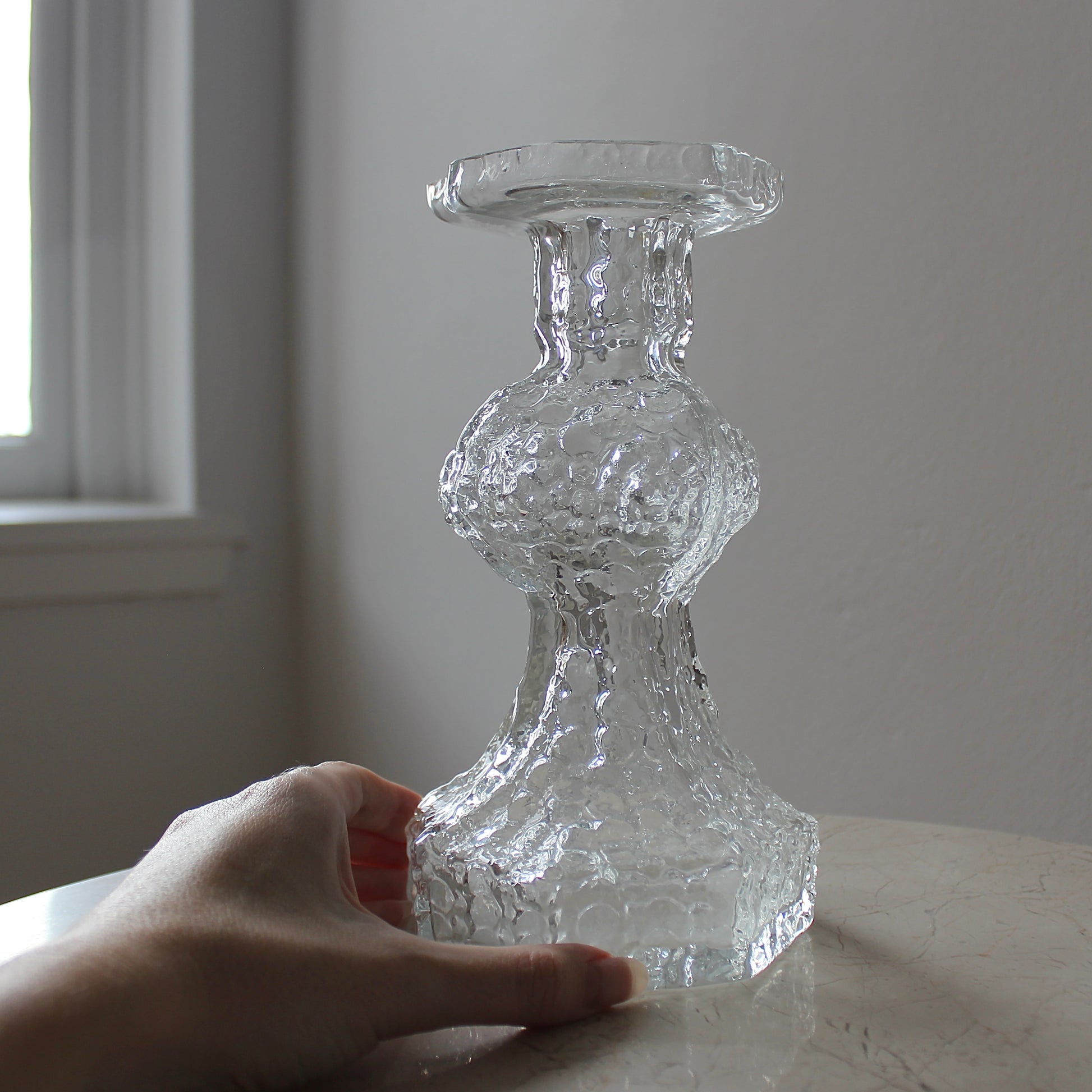 This model was designed by the famous Nanny Still for Finnish glassworks Riihimäen Lasi. In production from 1970 to 1976, the design features an irregular tall form with a beautiful textured surface.