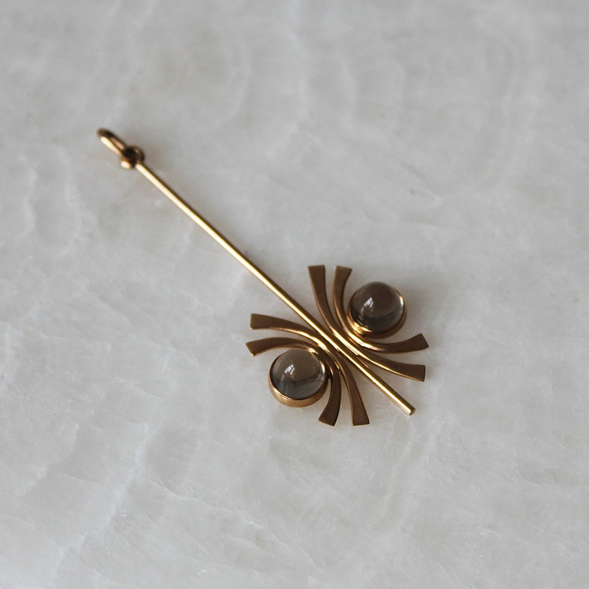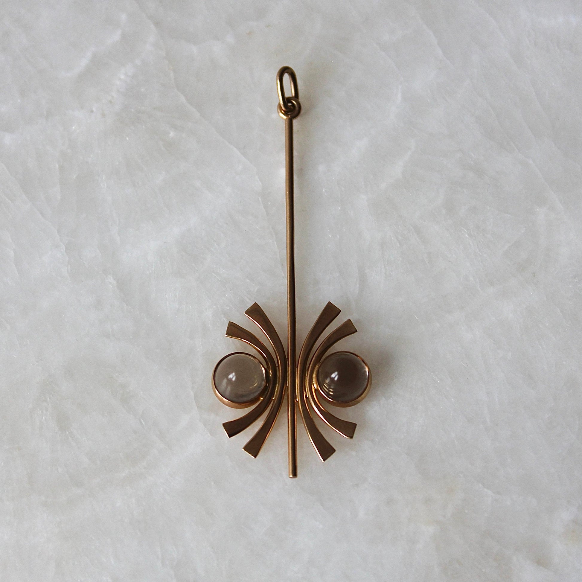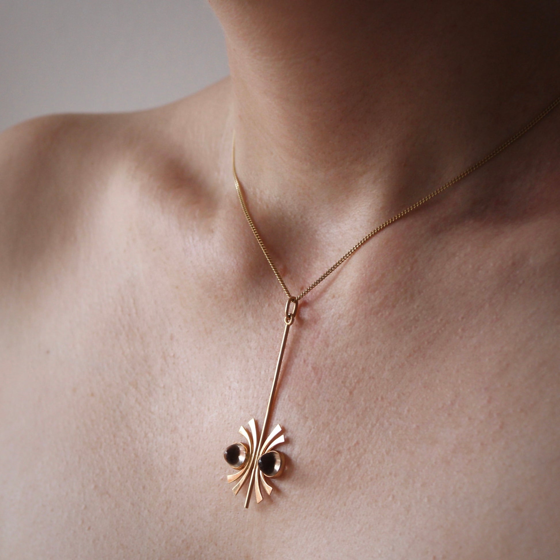 This stunning Modernist pendant features 14k solid gold that highlights two beautiful smoky quartz cabochon bullets. It was designed by the renowned Finnish jeweller and metalsmith Pekka Piekäinen during his time as chief designer at Auran Kultaseppä, a position he held from 1971 to 1989.