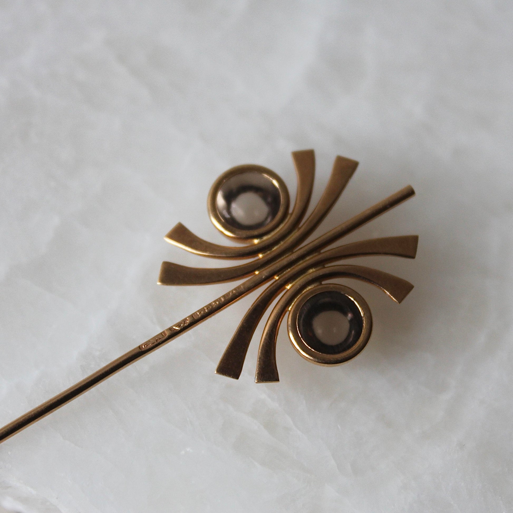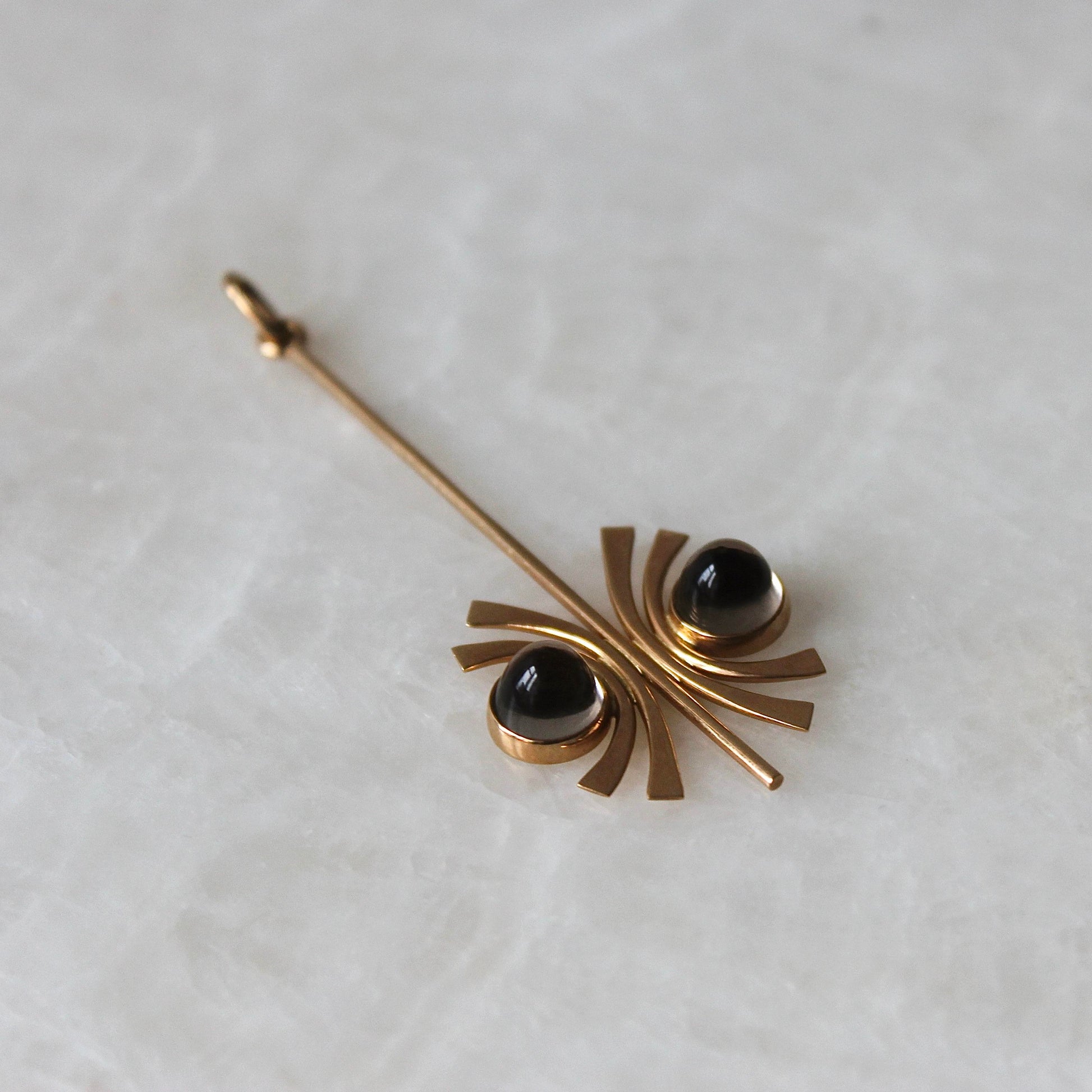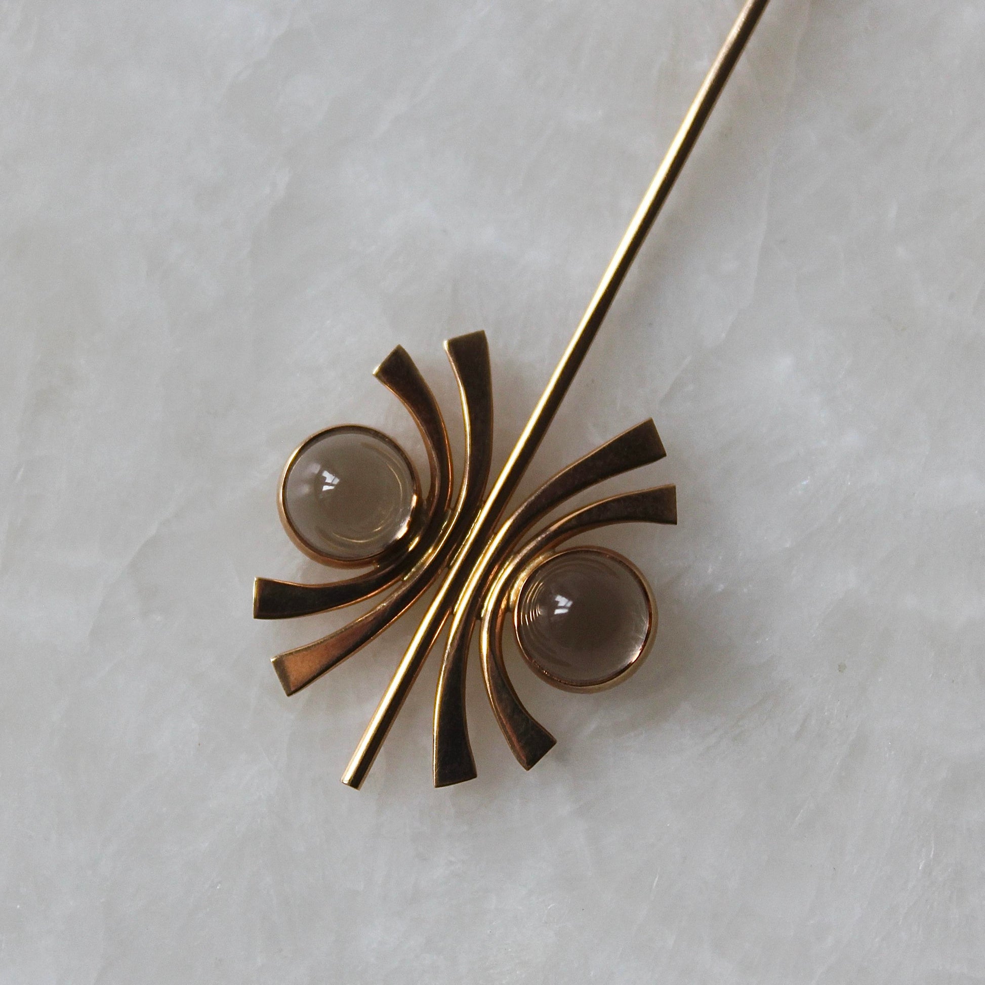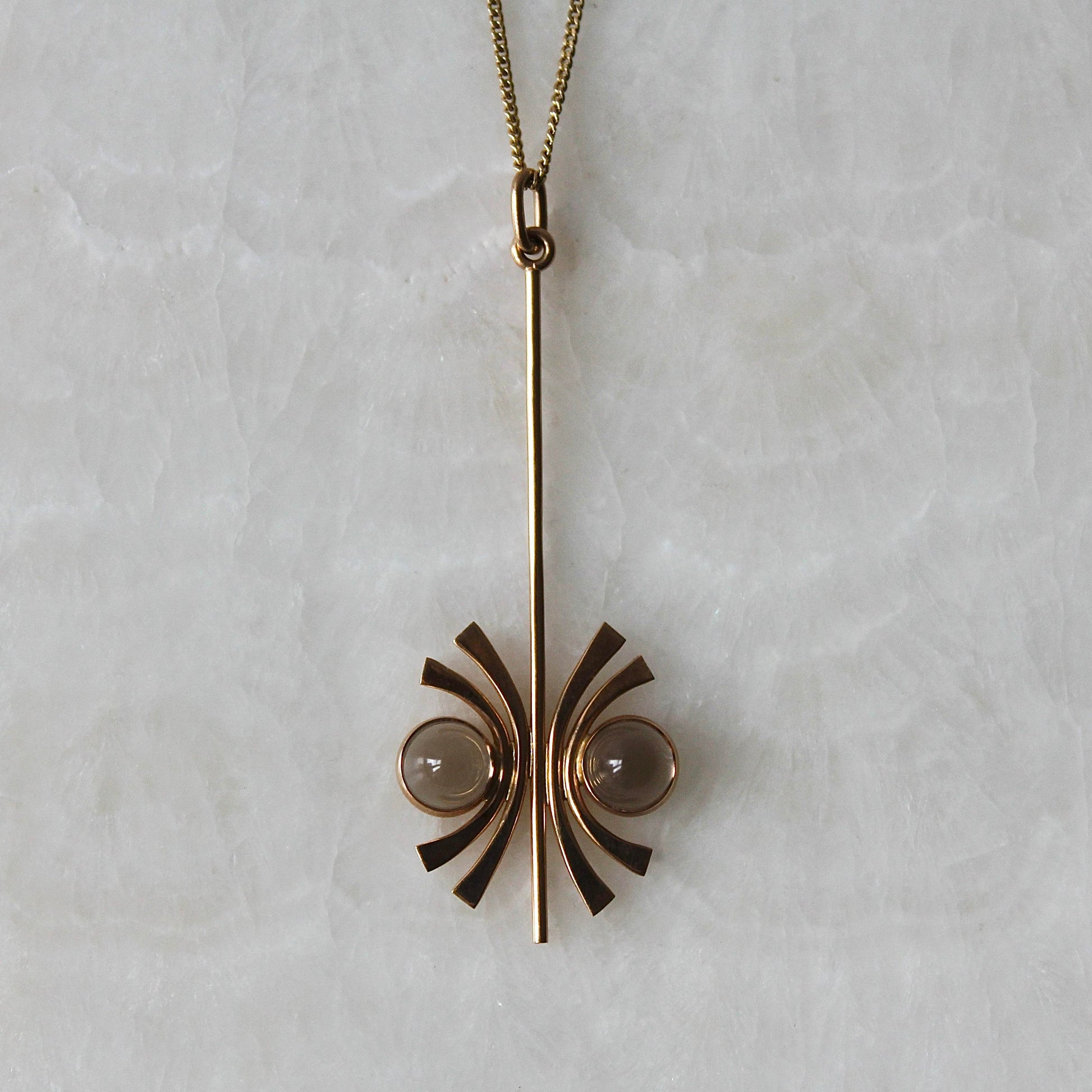 This stunning Modernist pendant features 14k solid gold that highlights two beautiful smoky quartz cabochon bullets. It was designed by the renowned Finnish jeweller and metalsmith Pekka Piekäinen during his time as chief designer at Auran Kultaseppä, a position he held from 1971 to 1989.